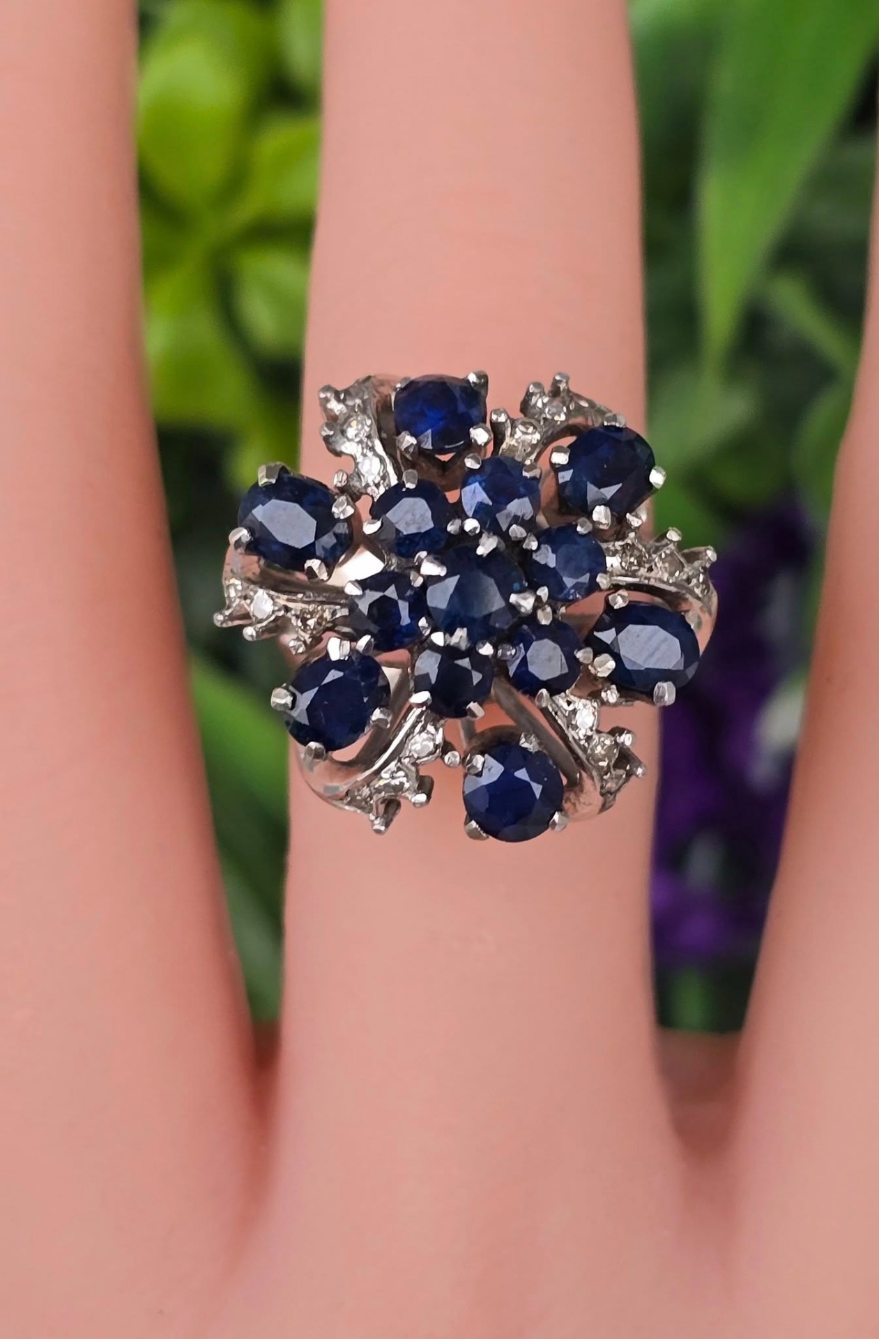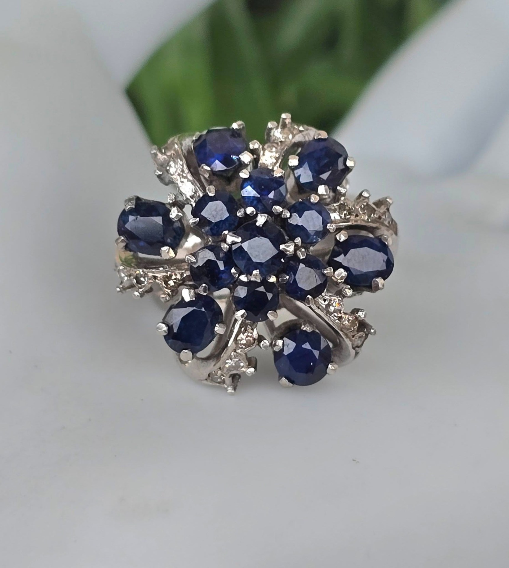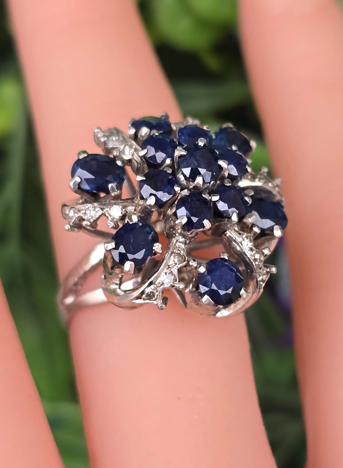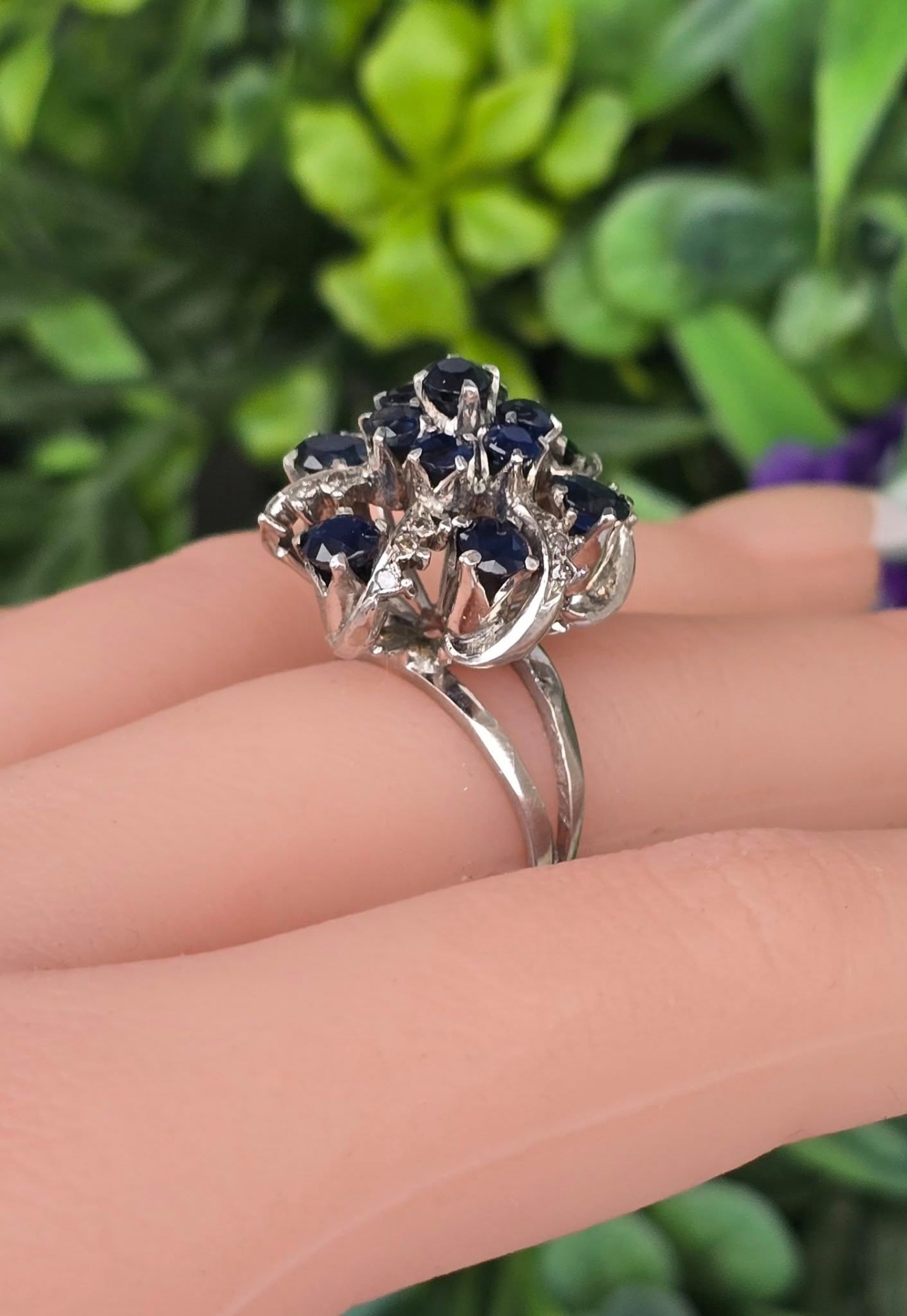 Inel "cocktail" vechi, spectaculos, de tip "cluster" (ciorchine), din aur alb de 8K, cu 13 safire "navy-blue" și 18 diamante naturale de calitate superioară.