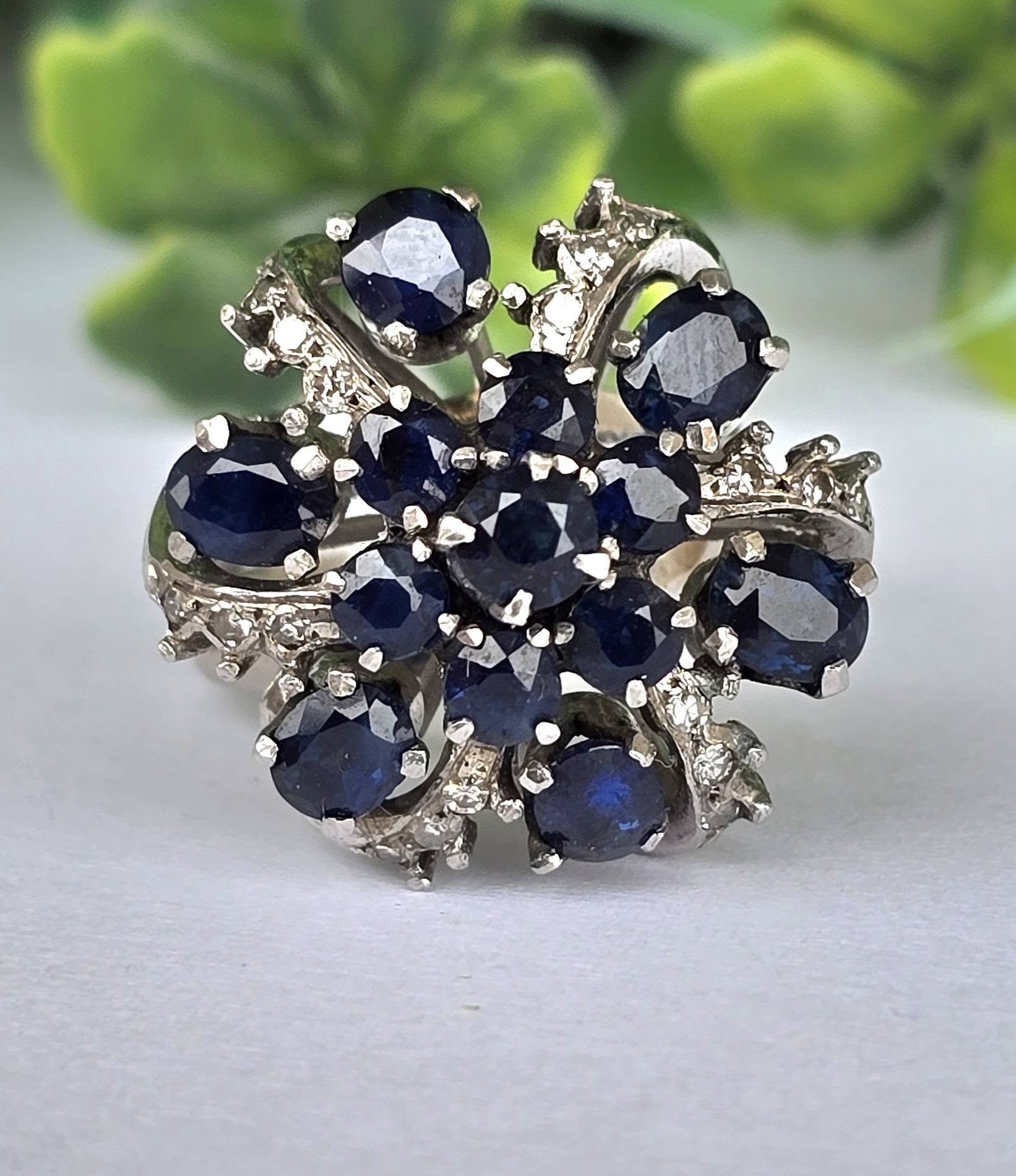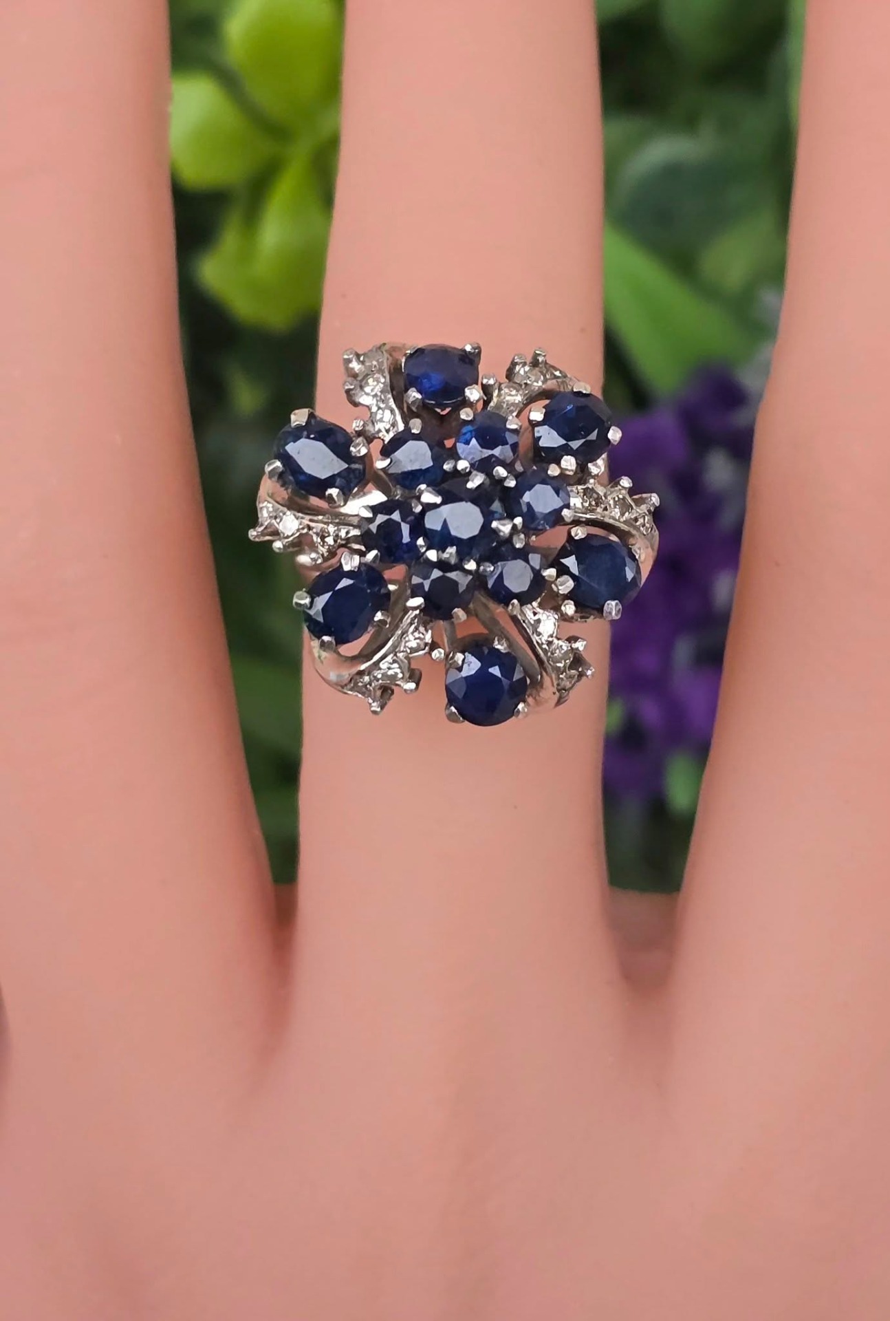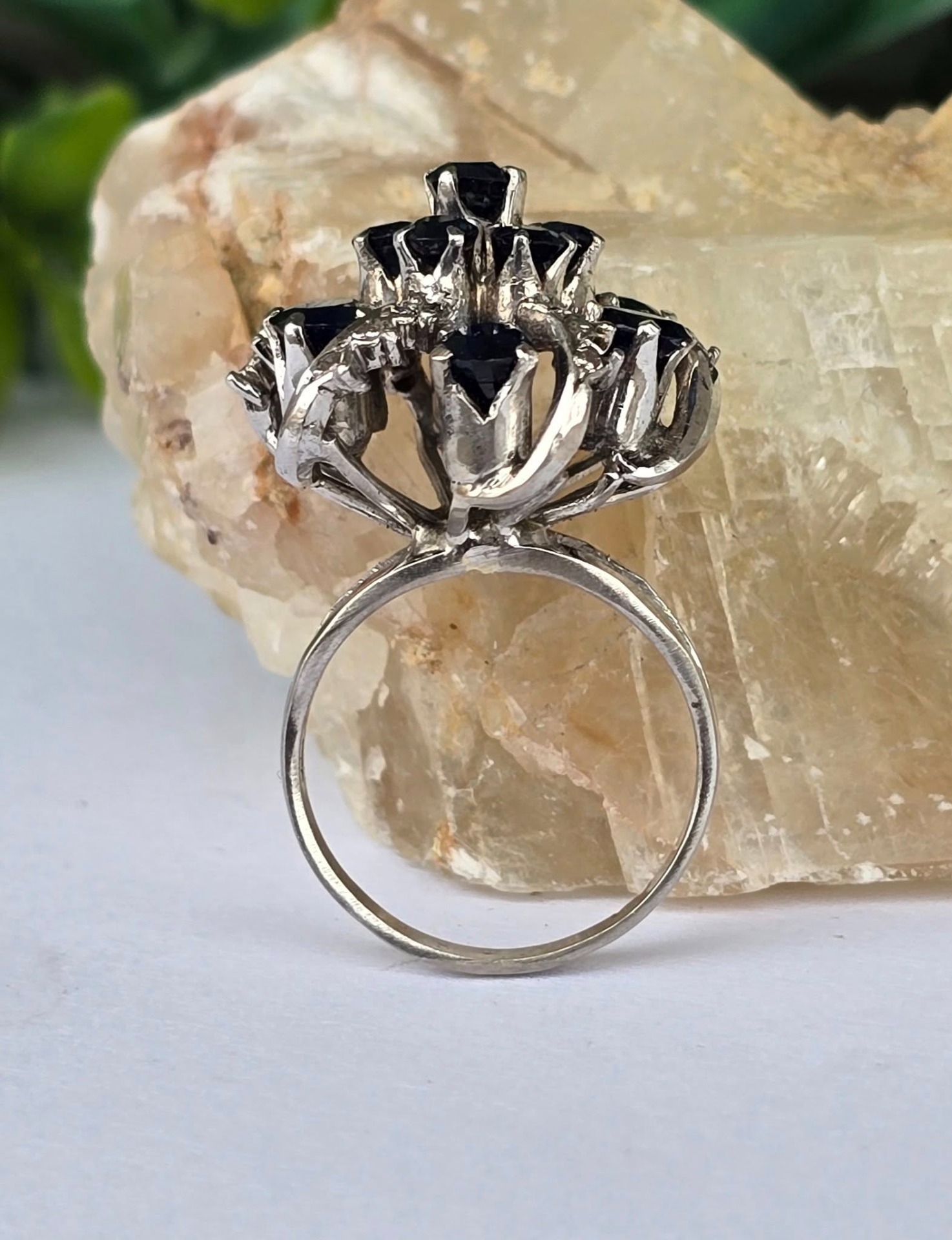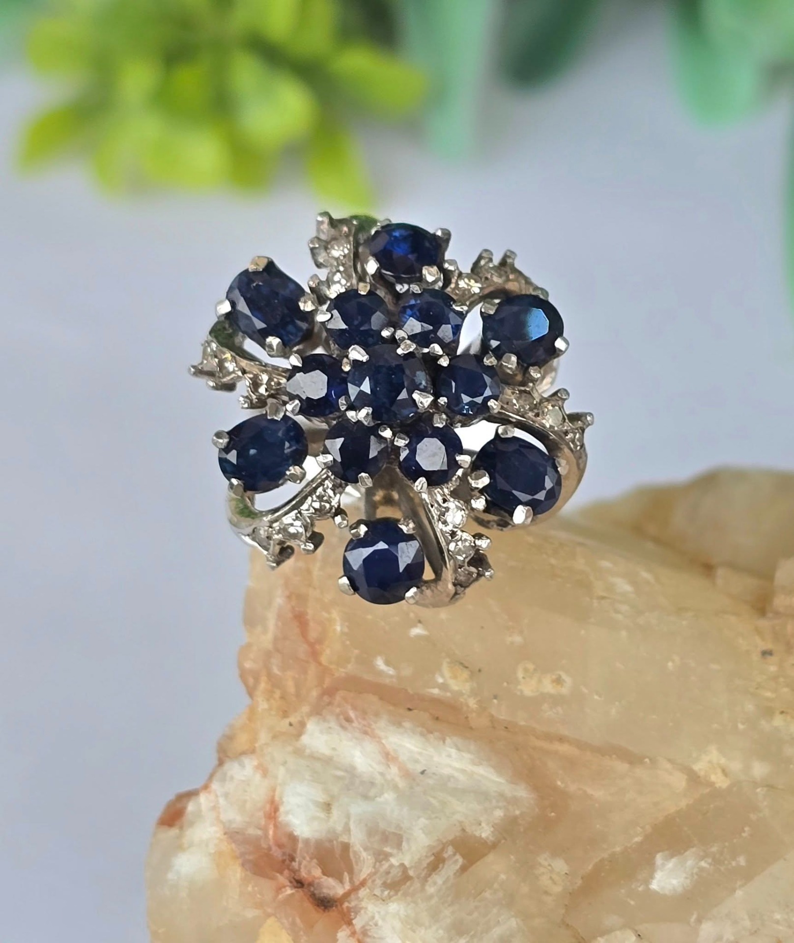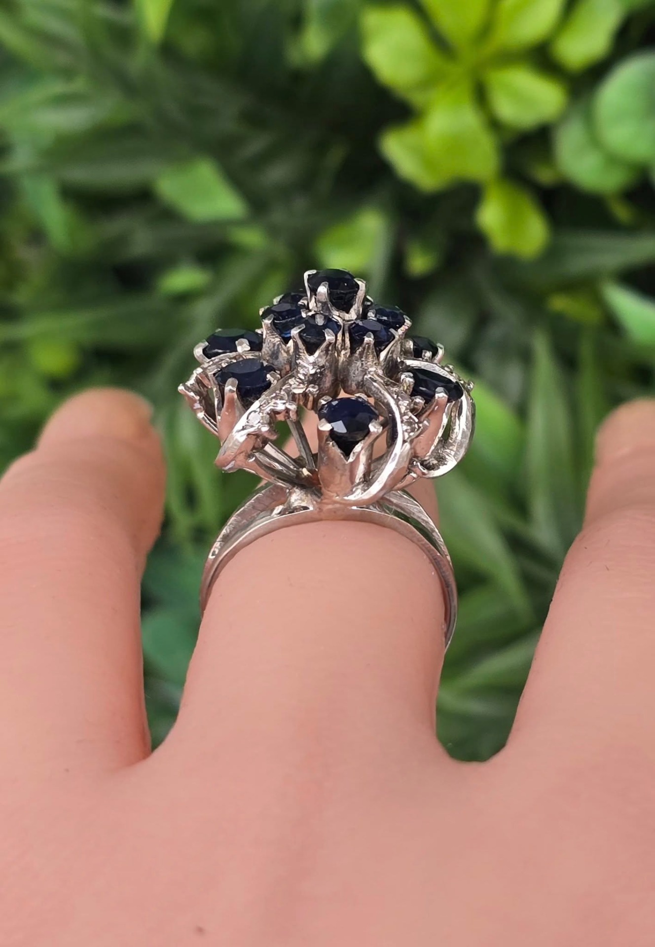 Inel "cocktail" vechi, spectaculos, de tip "cluster" (ciorchine), din aur alb de 8K, cu 13 safire "navy-blue" și 18 diamante naturale de calitate superioară.