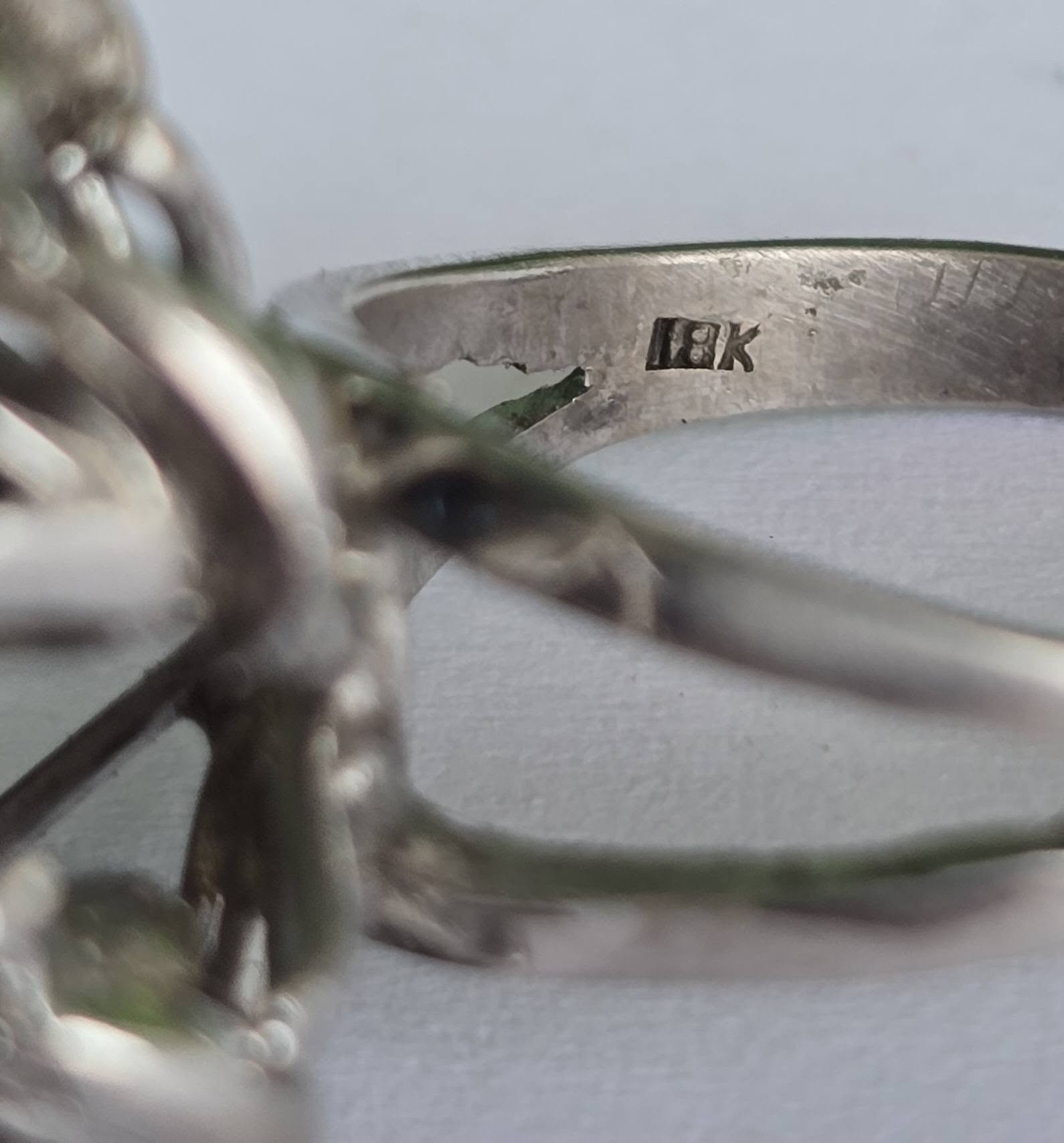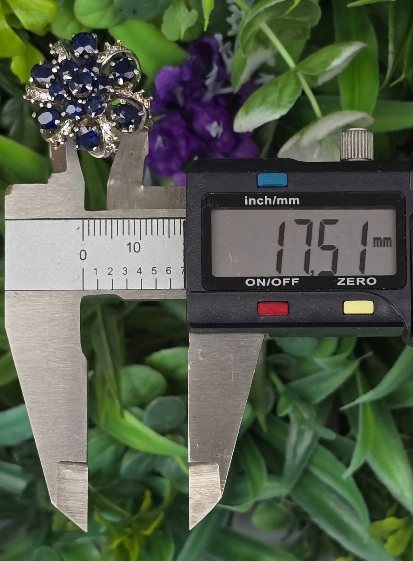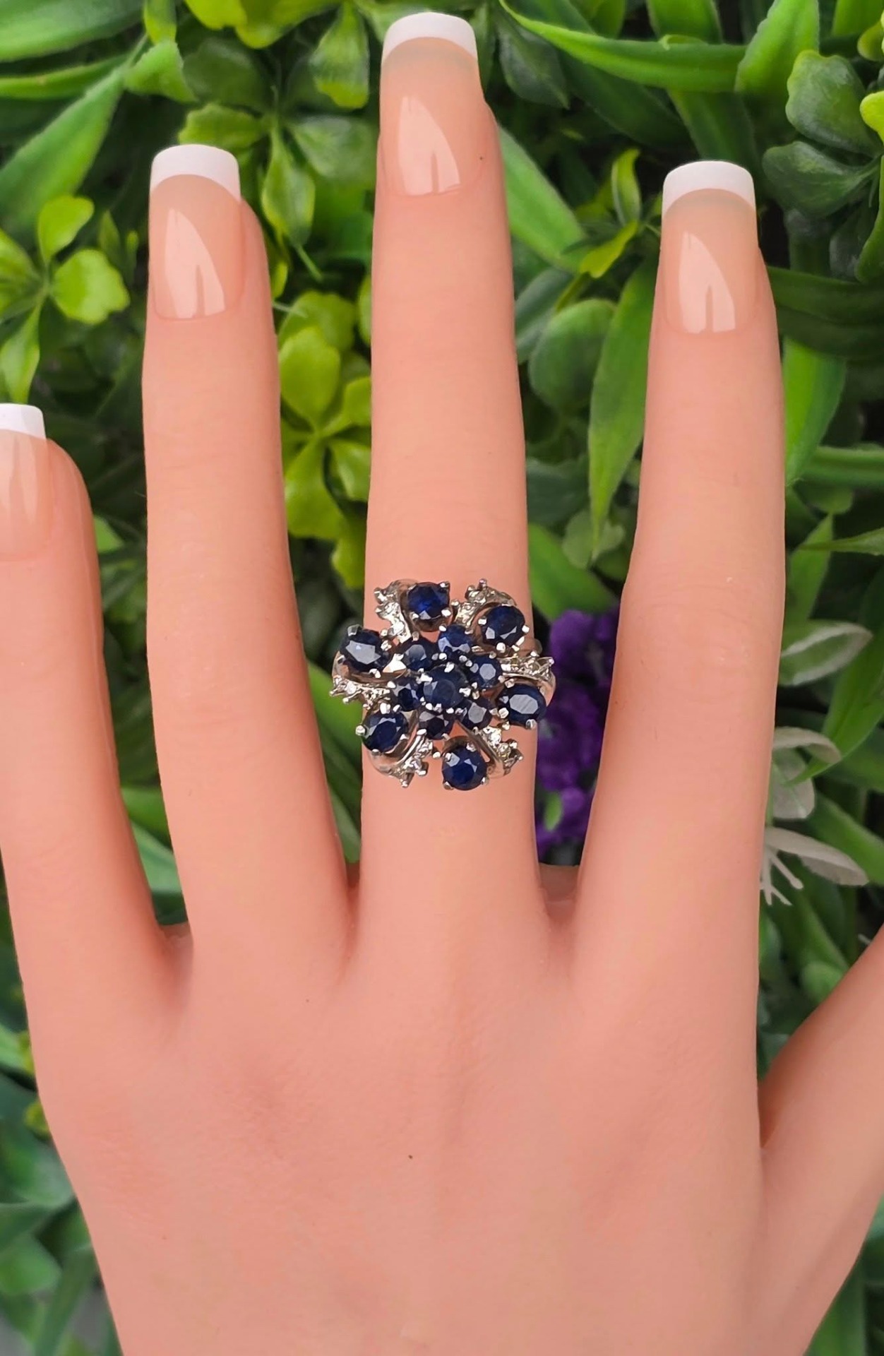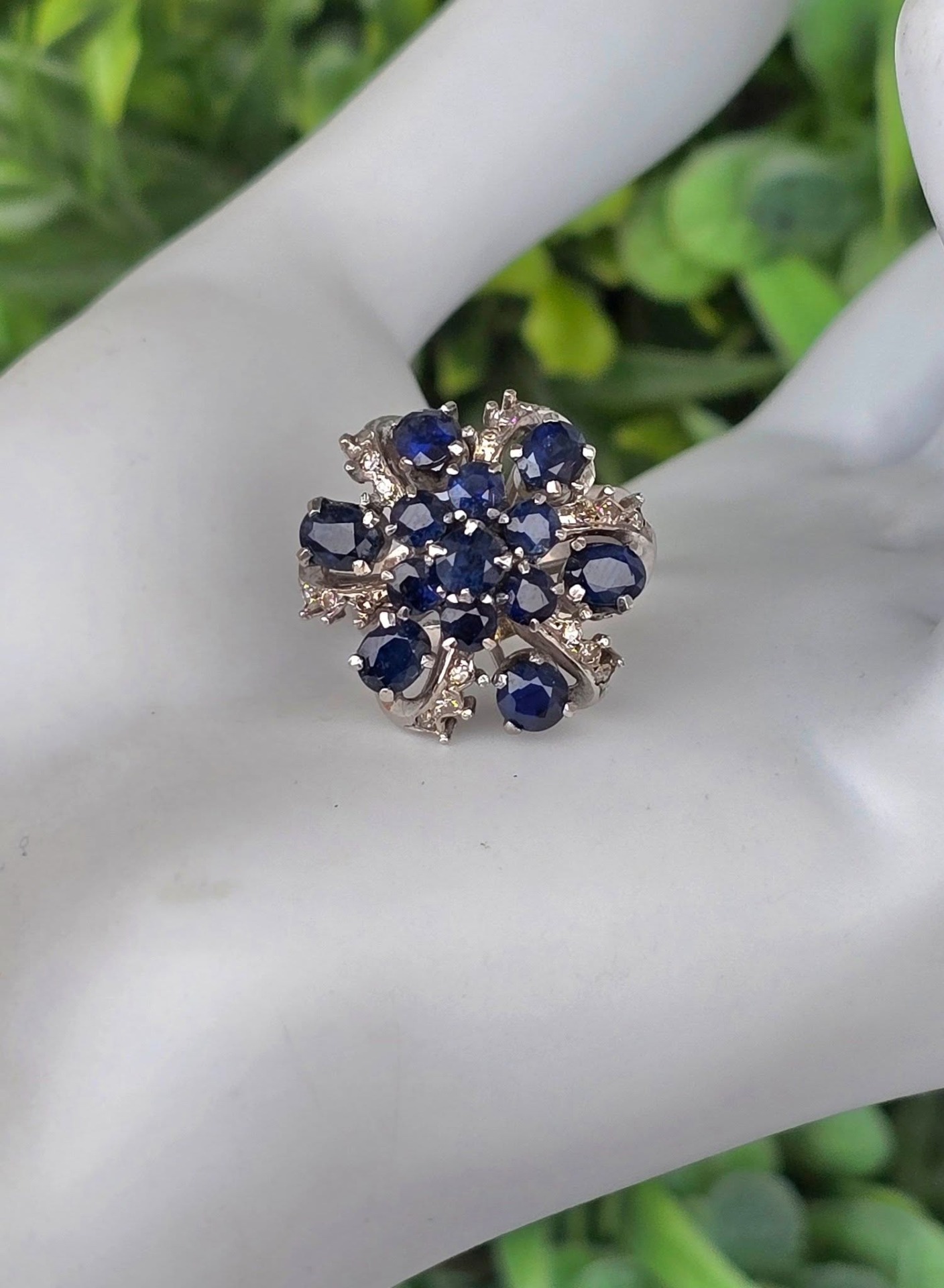 Inel "cocktail" vechi, spectaculos, de tip "cluster" (ciorchine), din aur alb de 8K, cu 13 safire "navy-blue" și 18 diamante naturale de calitate superioară.
