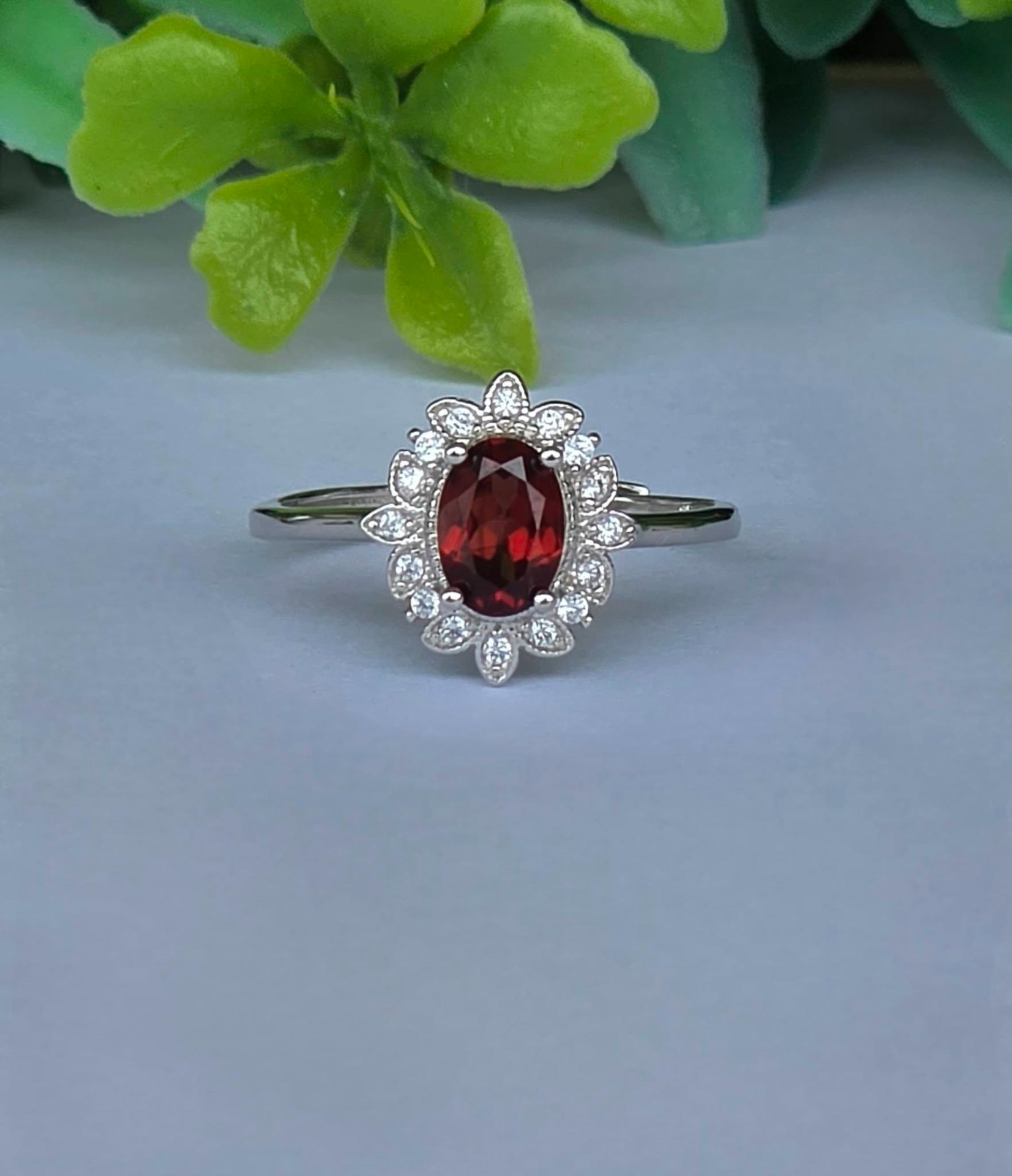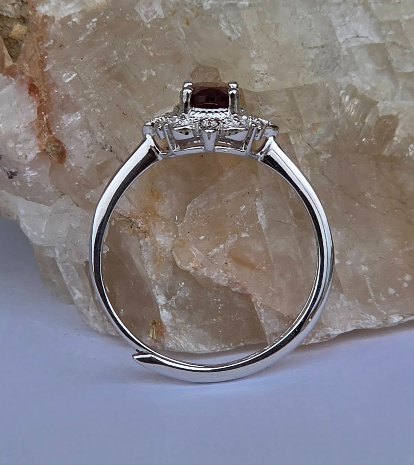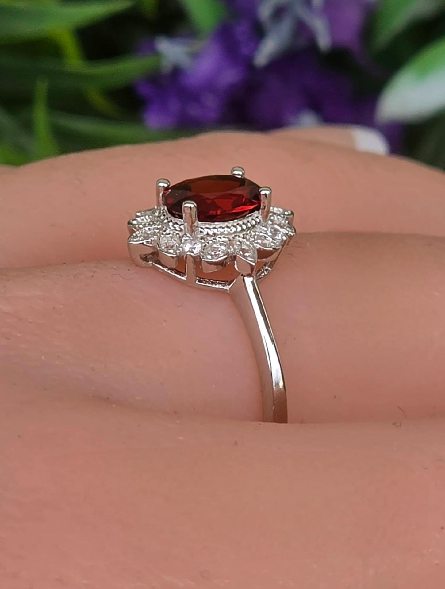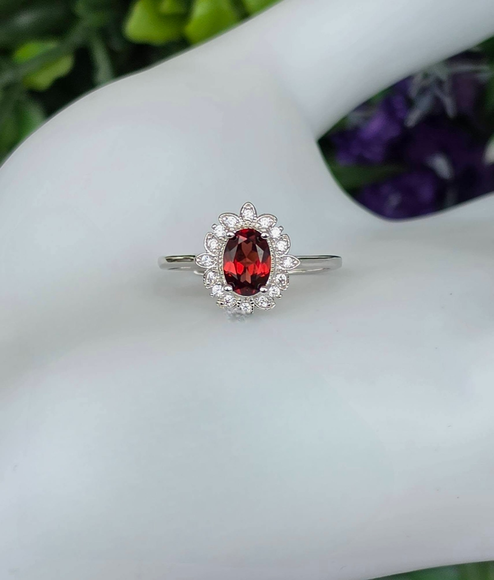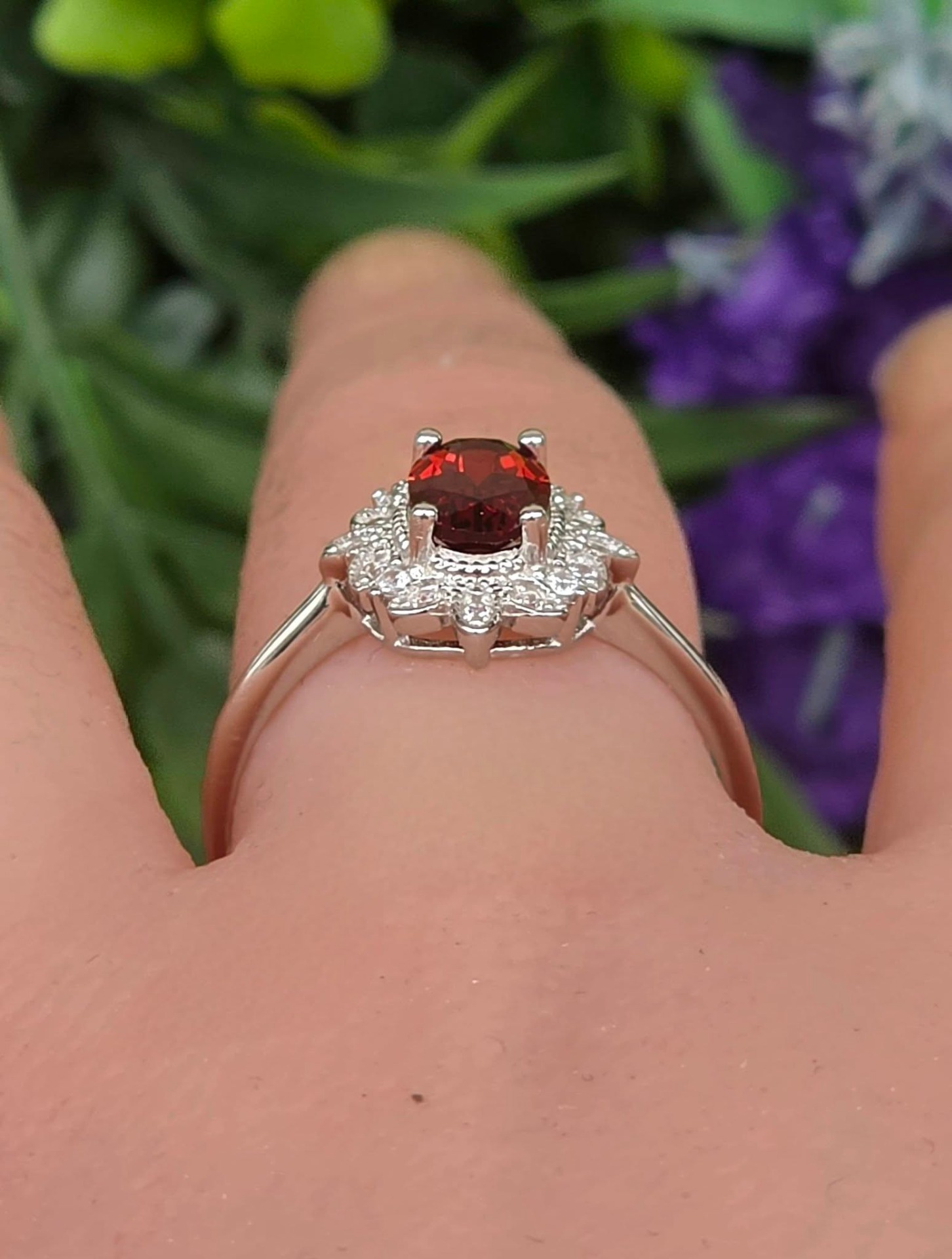 Inel contemporan deosebit, din argint platinat, cu un superb granat natural și pietre cubic zirconia.