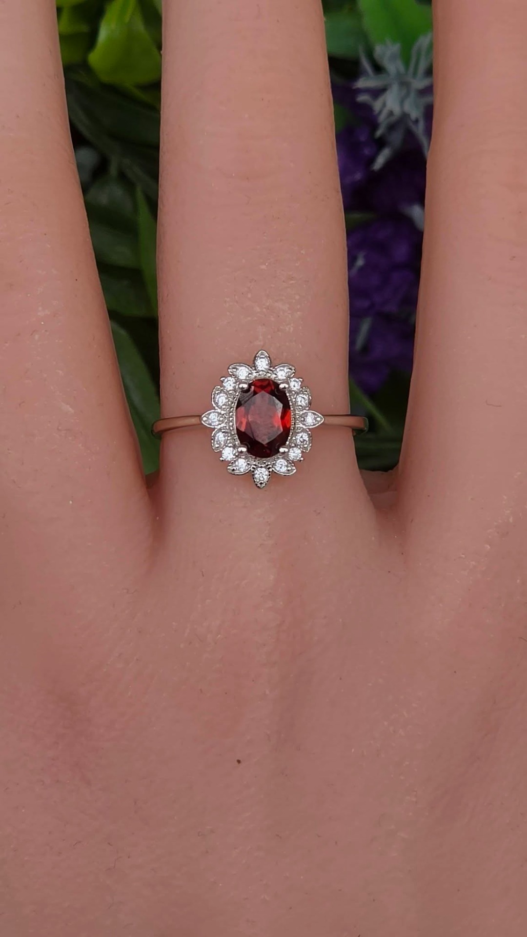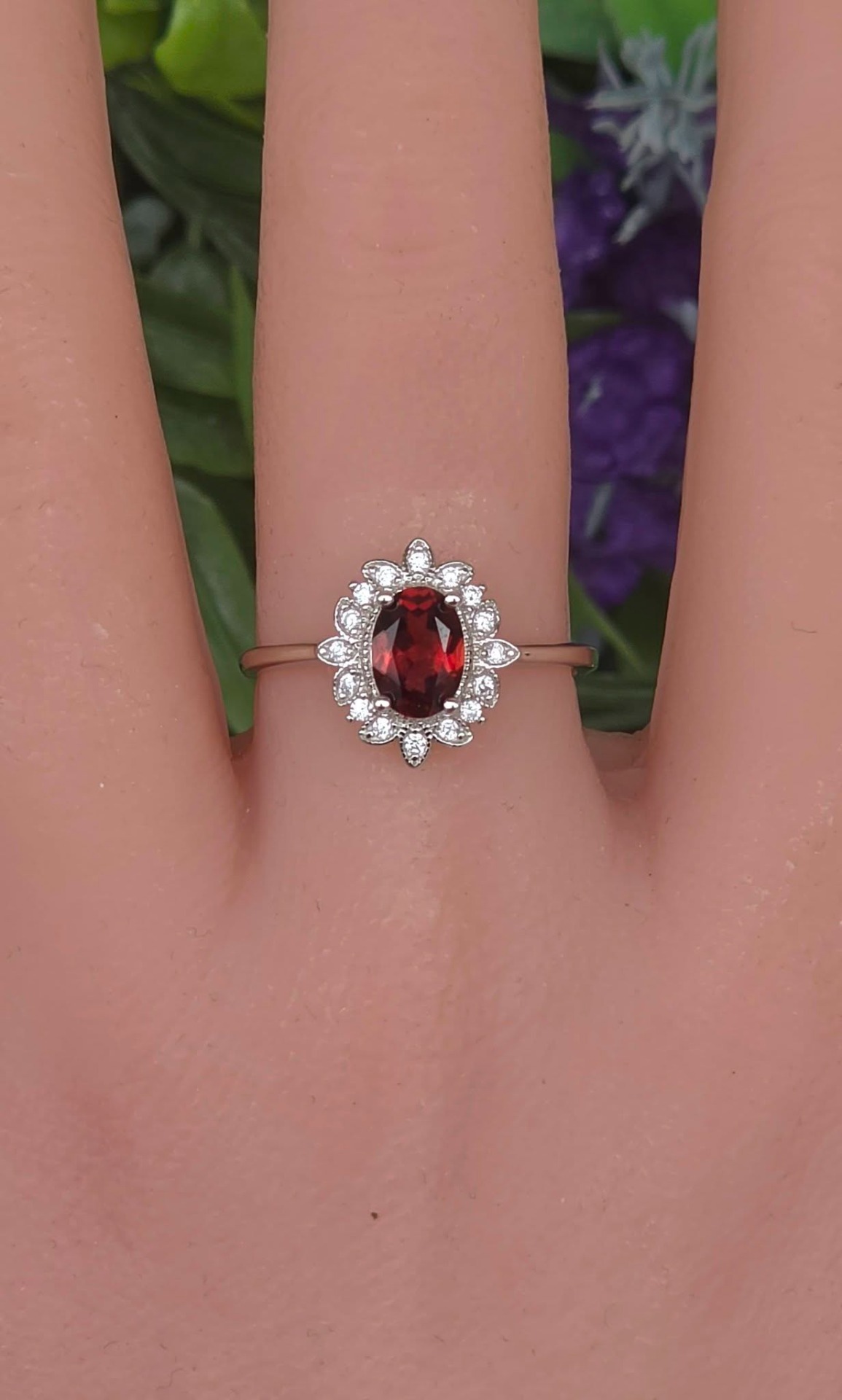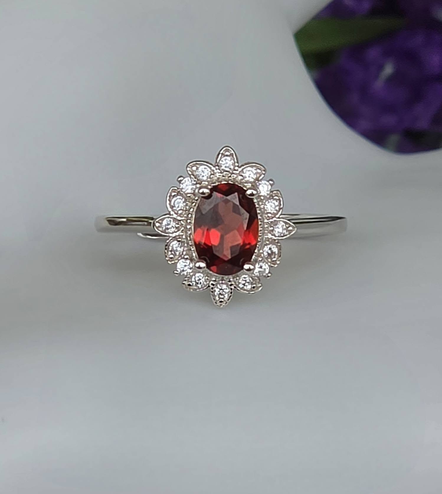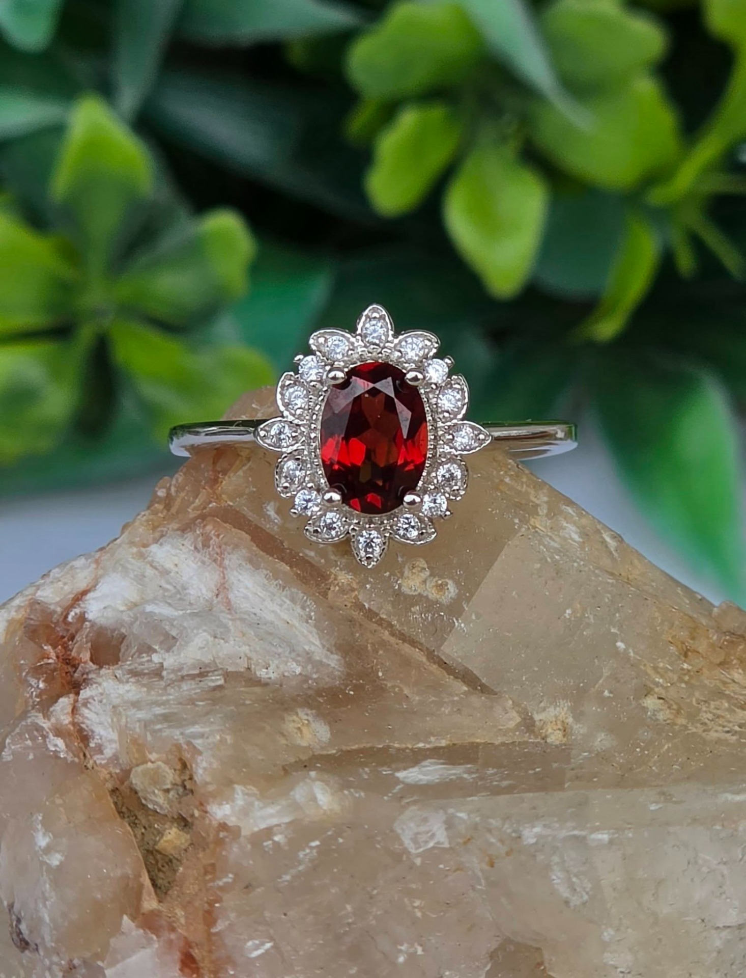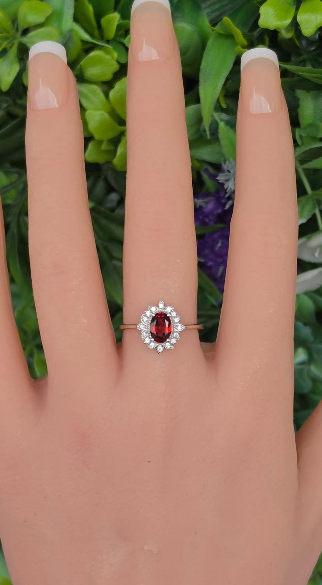 Inel contemporan deosebit, din argint platinat, cu un superb granat natural și pietre cubic zirconia.