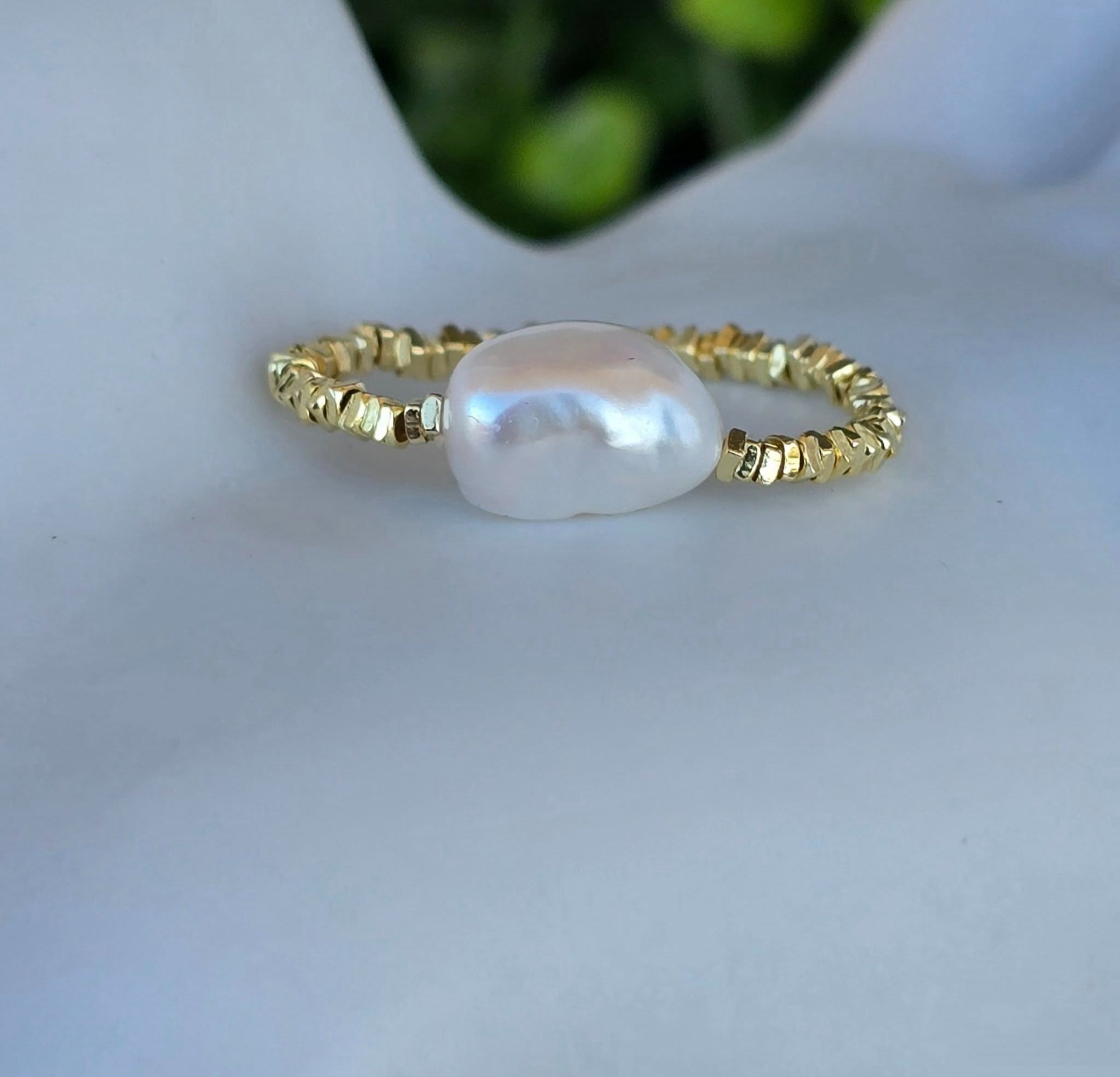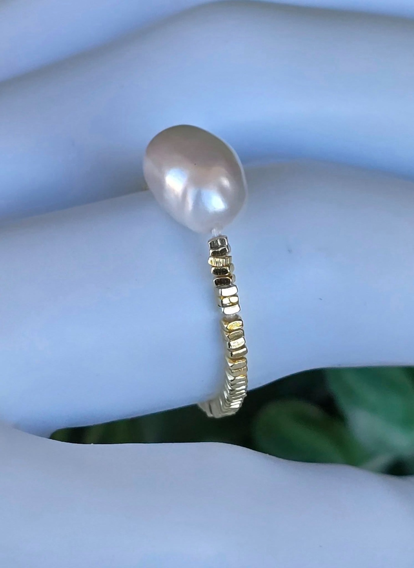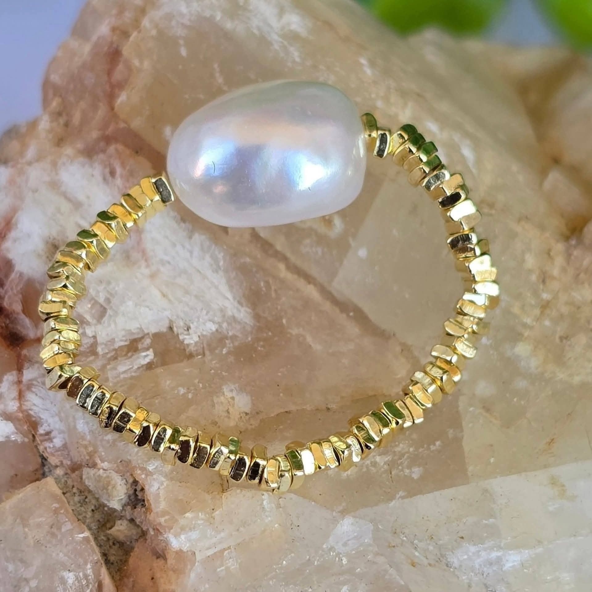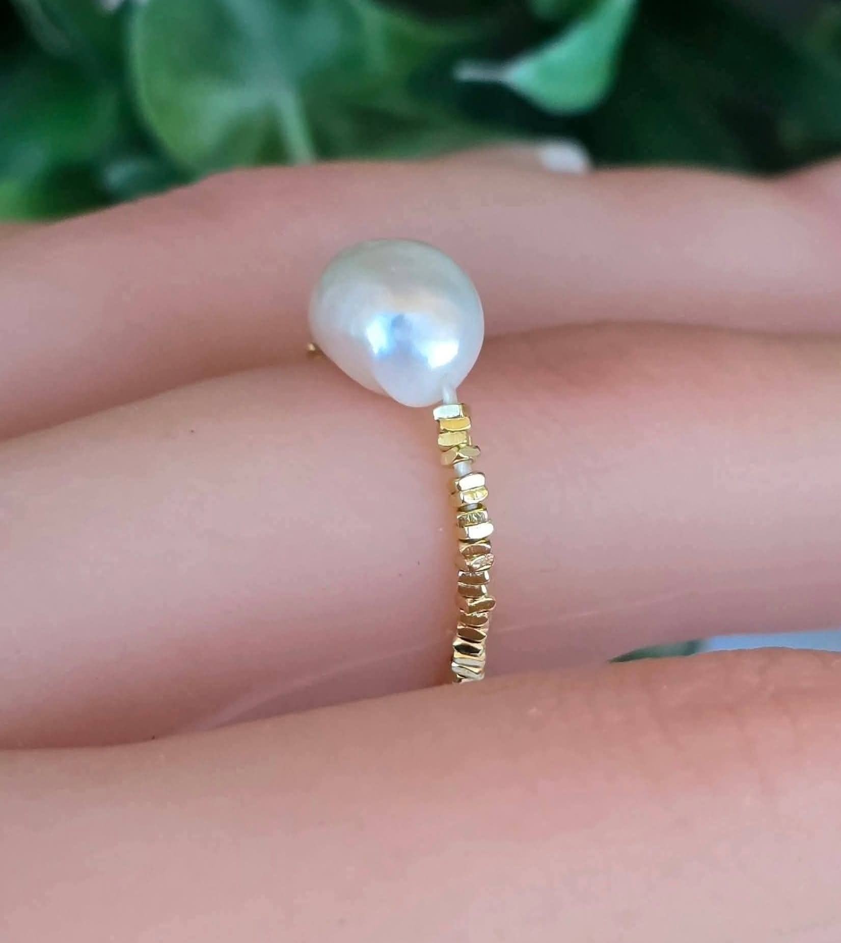 Inel contemporan special, cu pepite din argint aurit și perlă baroque naturală de cultură, dispuse pe fir elastic.