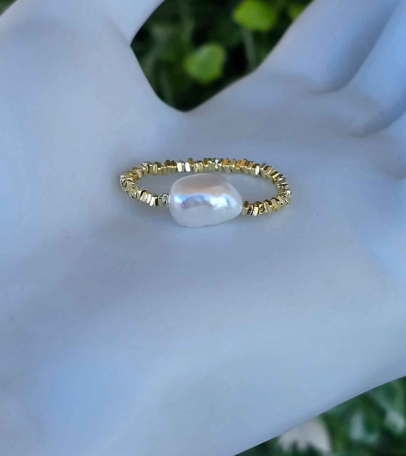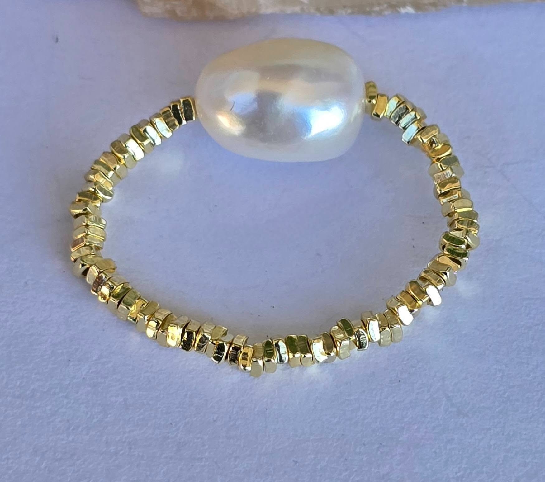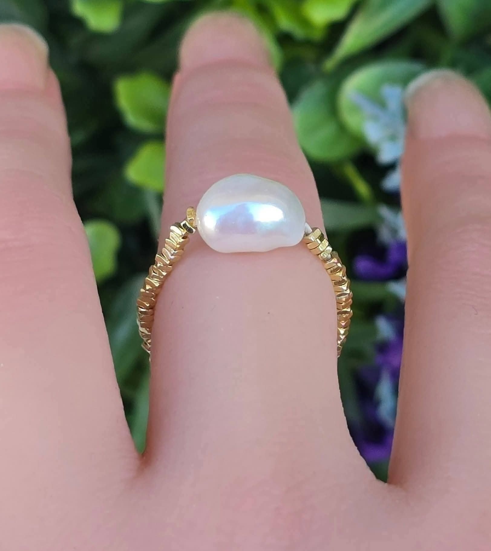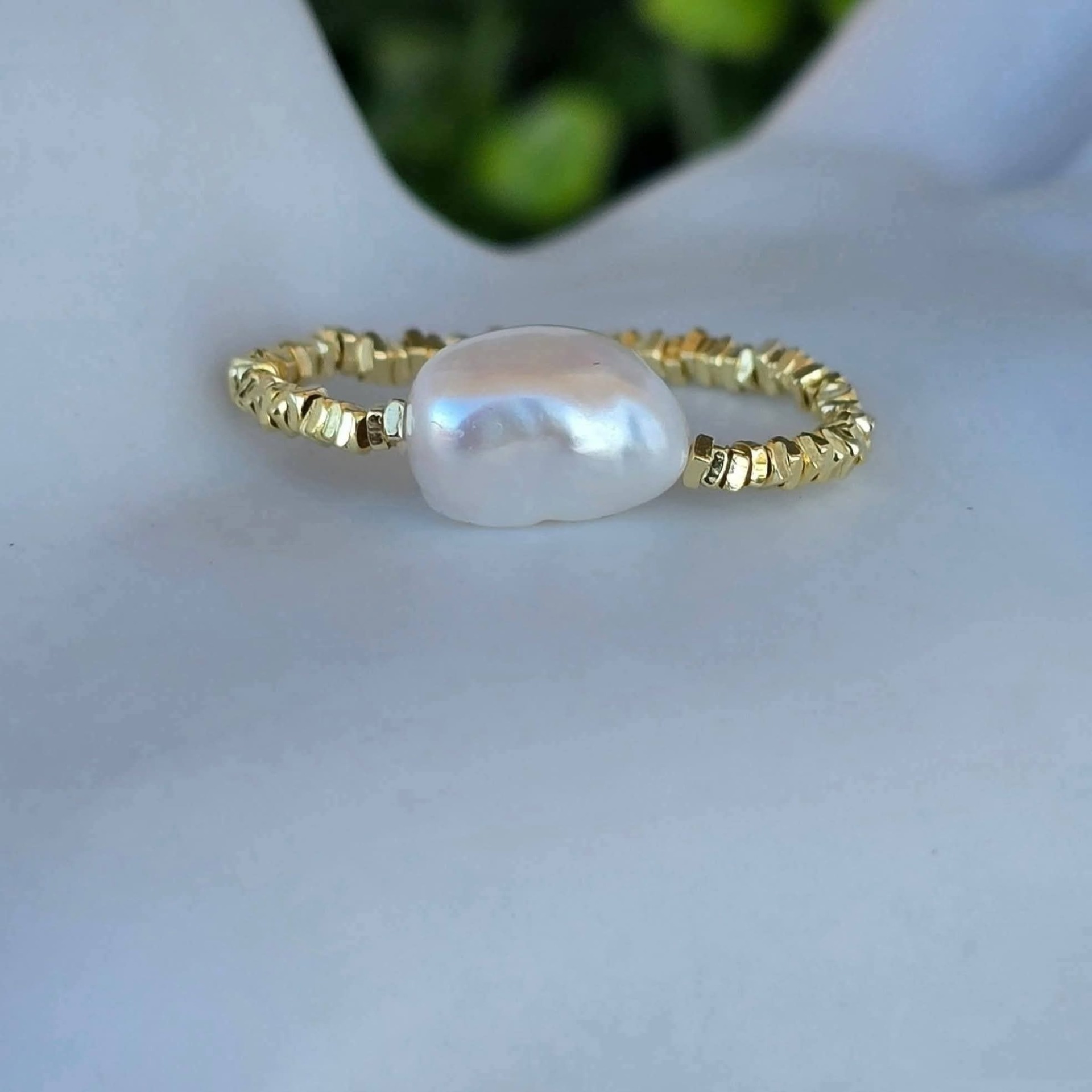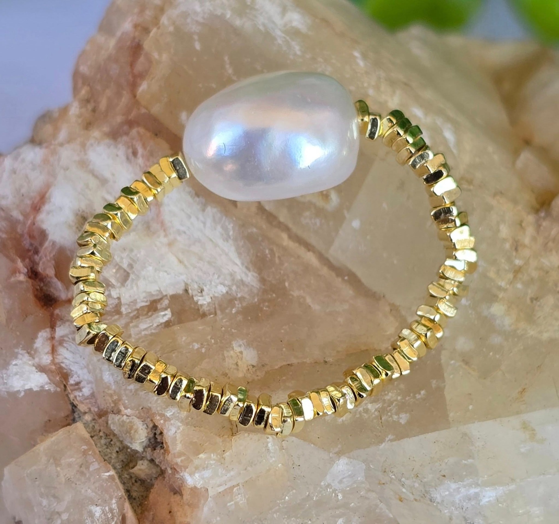 Inel contemporan special, cu pepite din argint aurit și perlă baroque naturală de cultură, dispuse pe fir elastic.