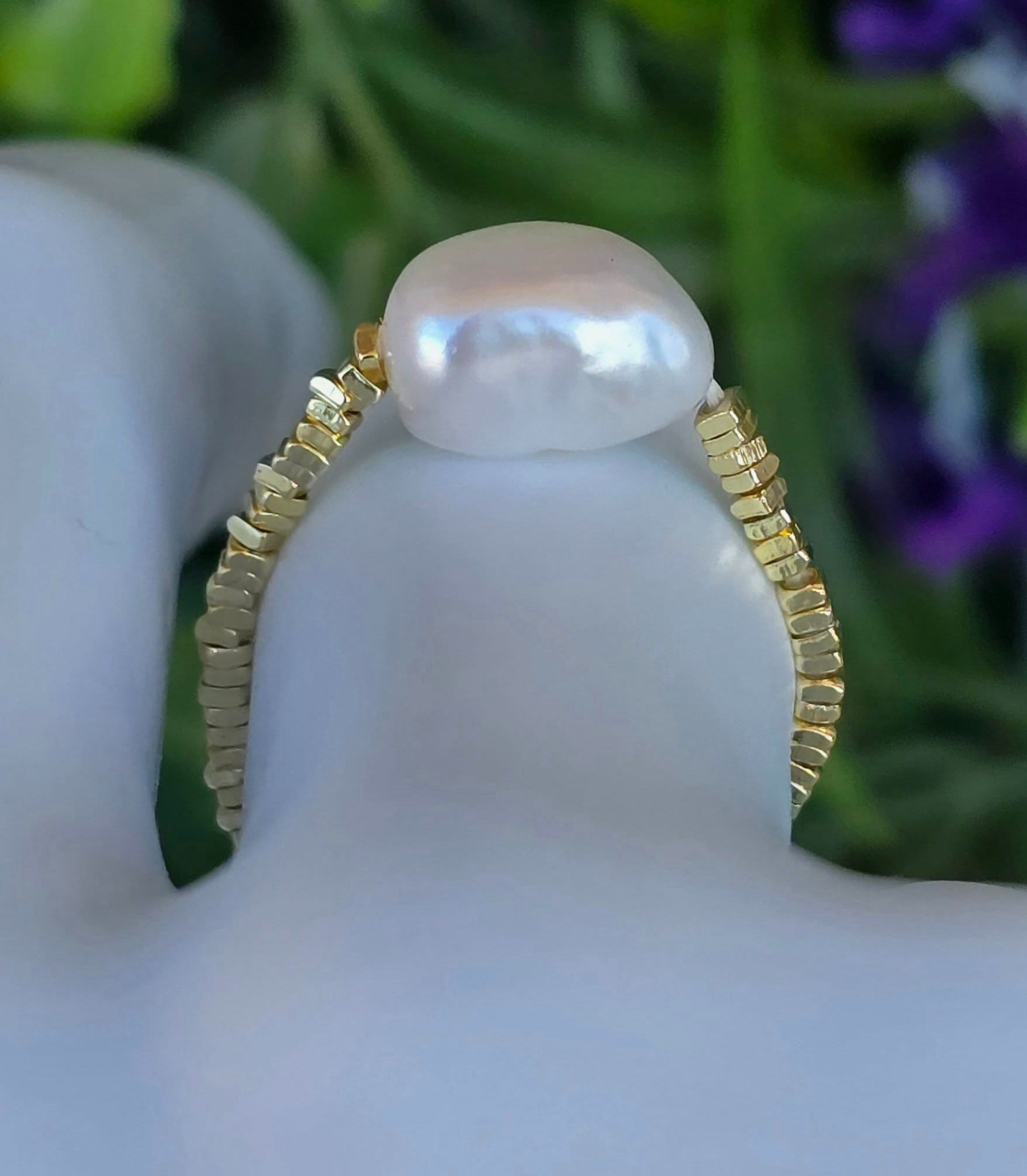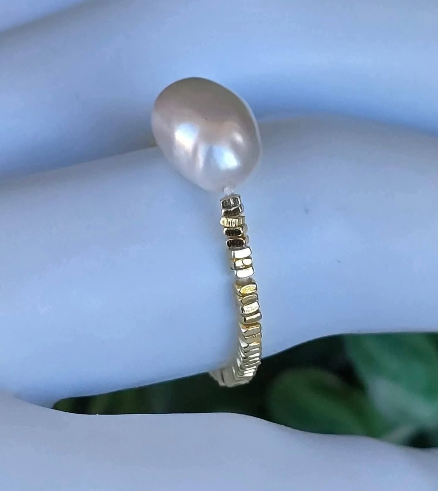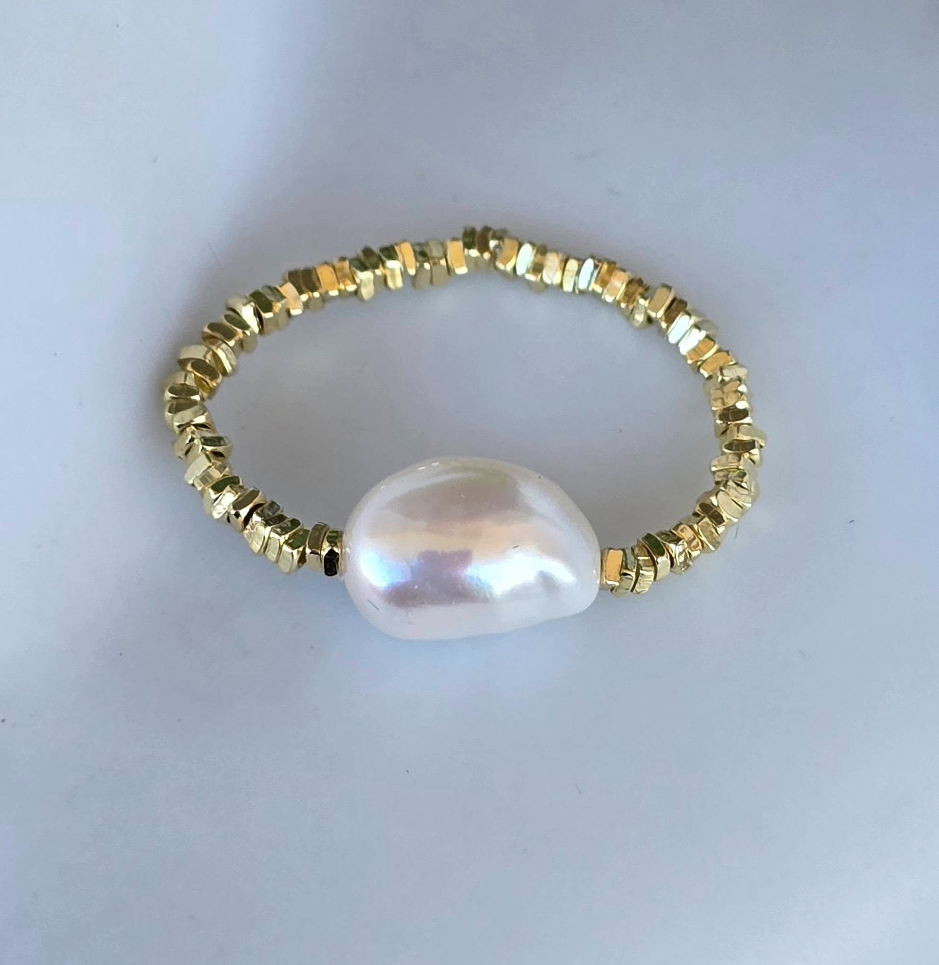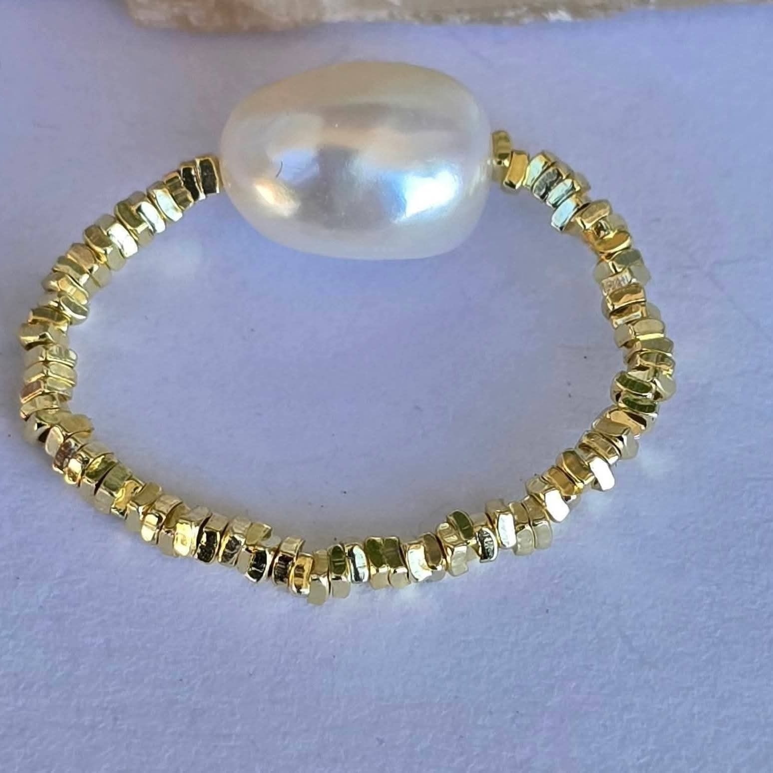 Inel contemporan special, cu pepite din argint aurit și perlă baroque naturală de cultură, dispuse pe fir elastic.