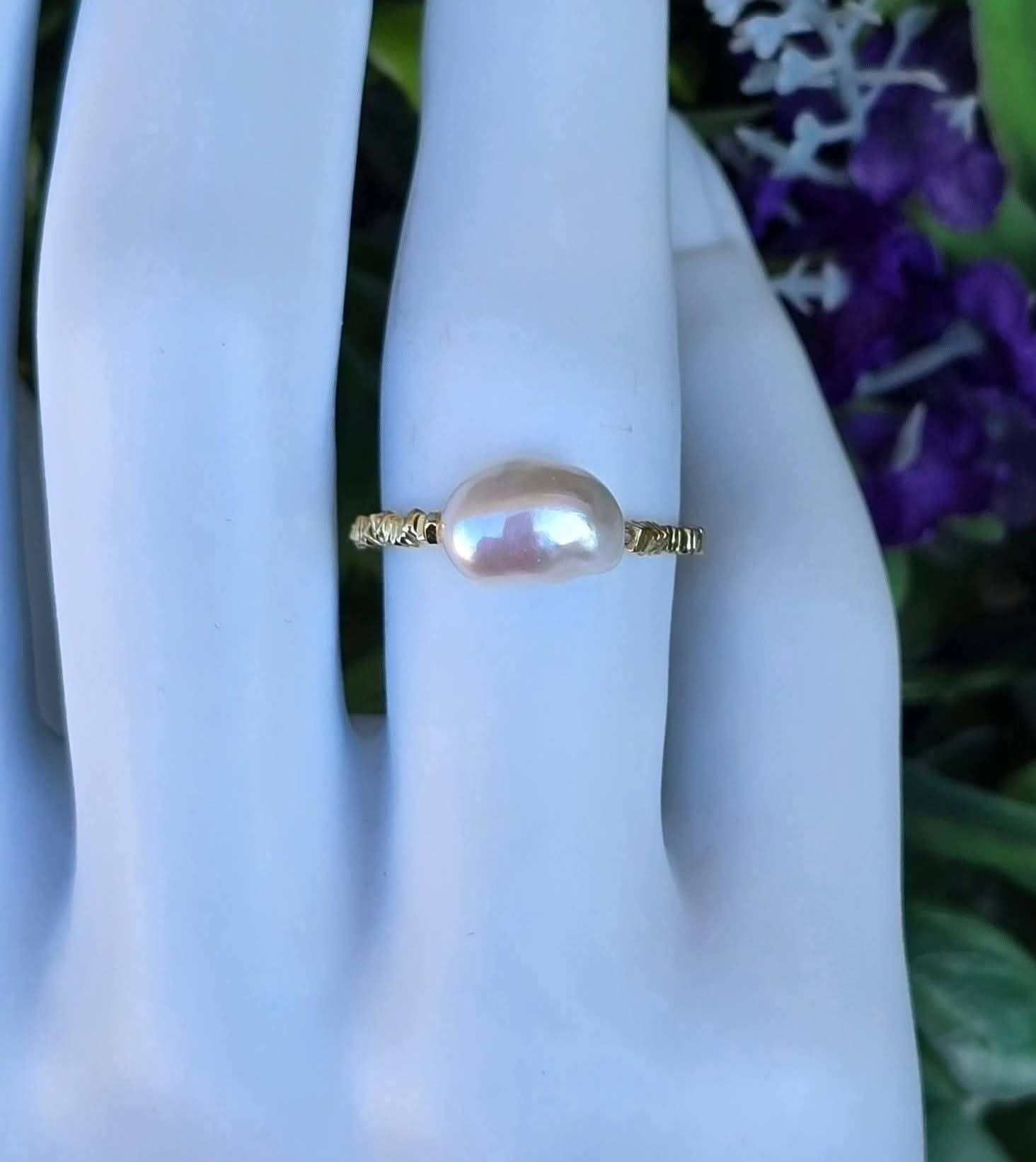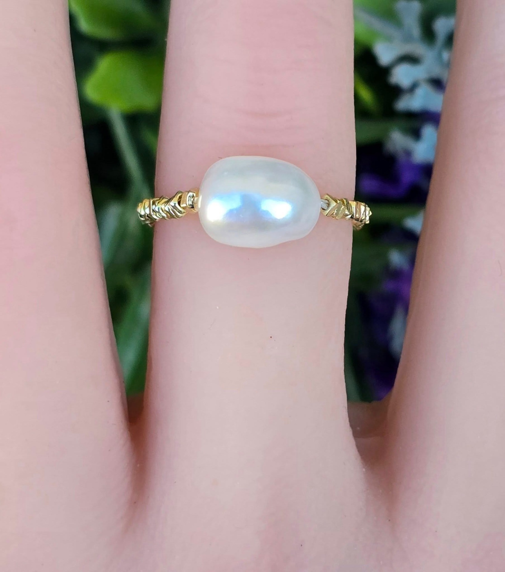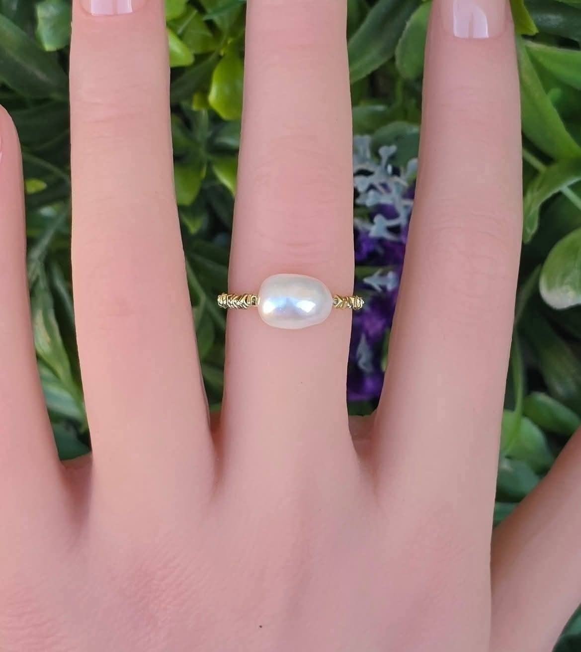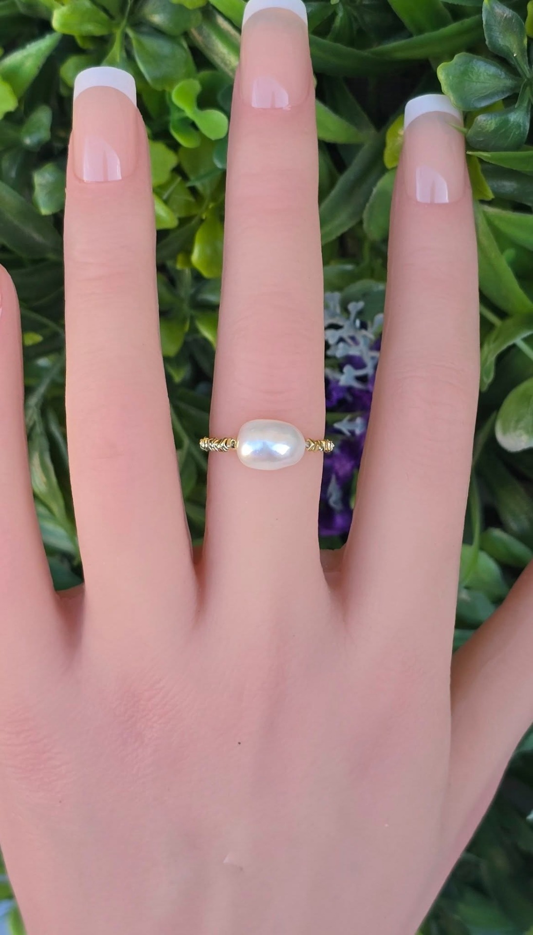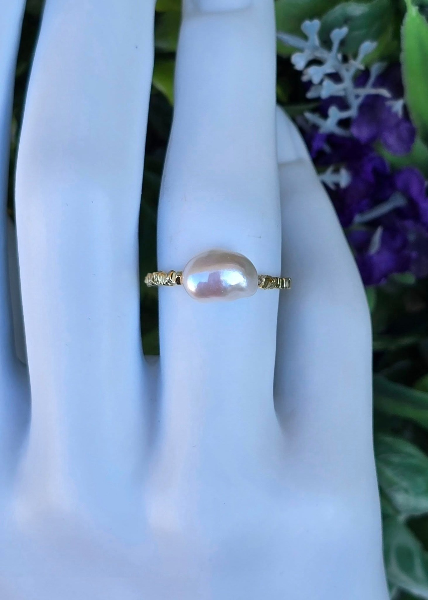 Inel contemporan special, cu pepite din argint aurit și perlă baroque naturală de cultură, dispuse pe fir elastic.