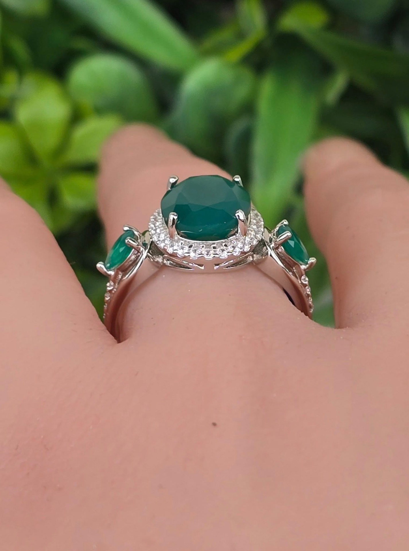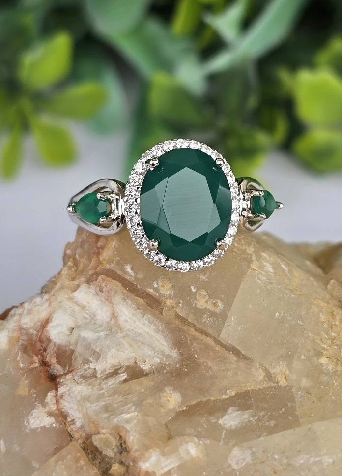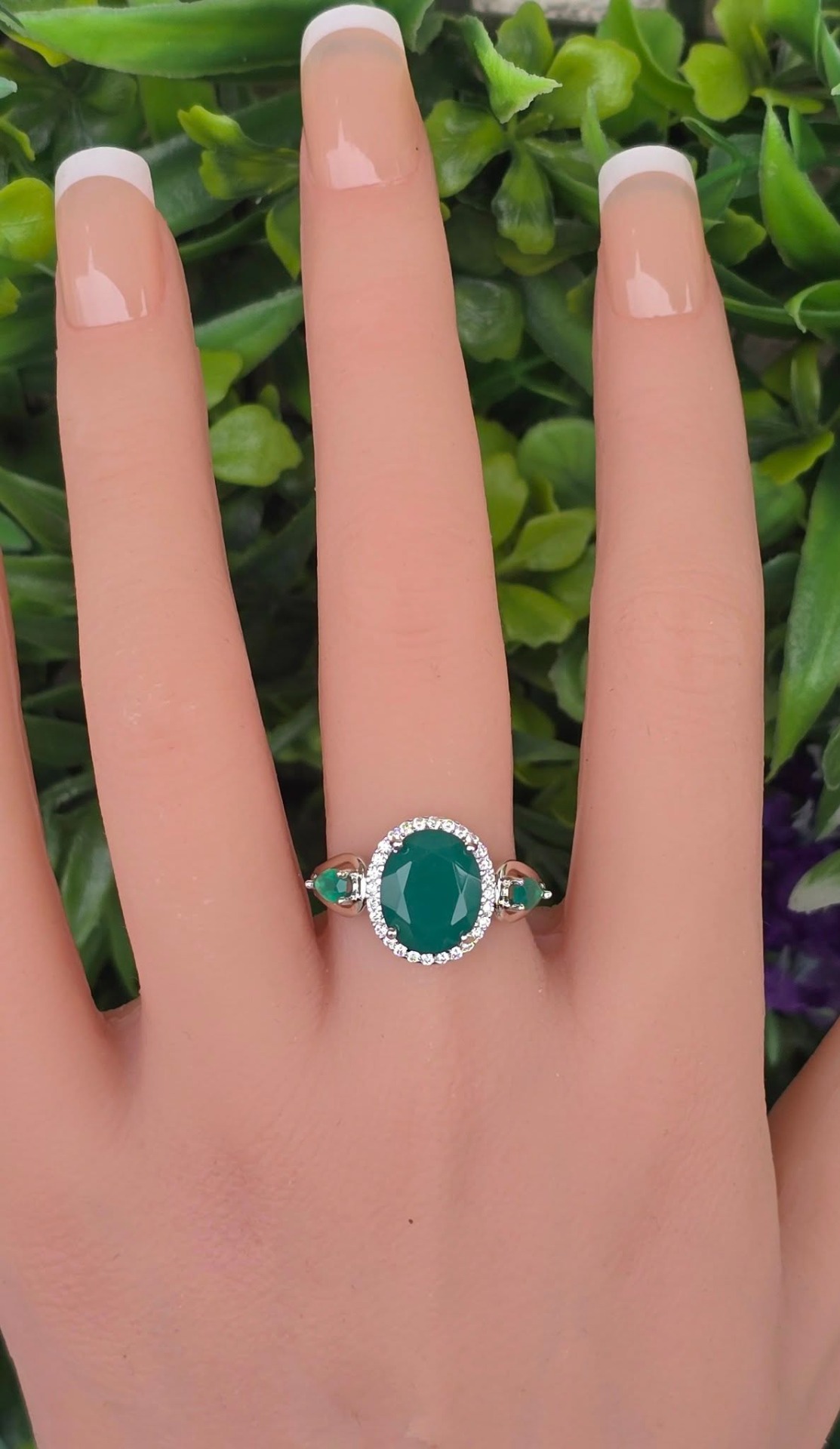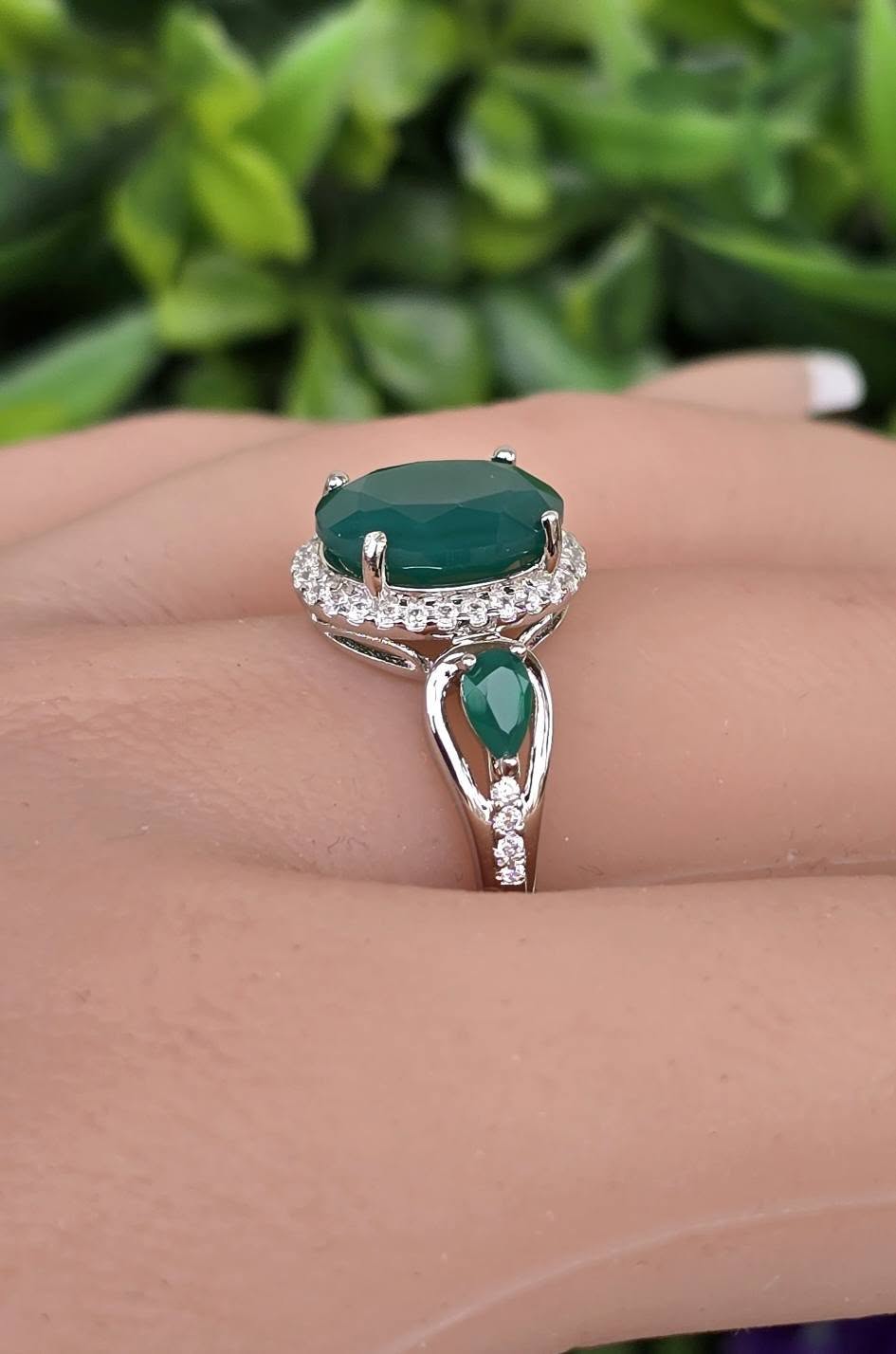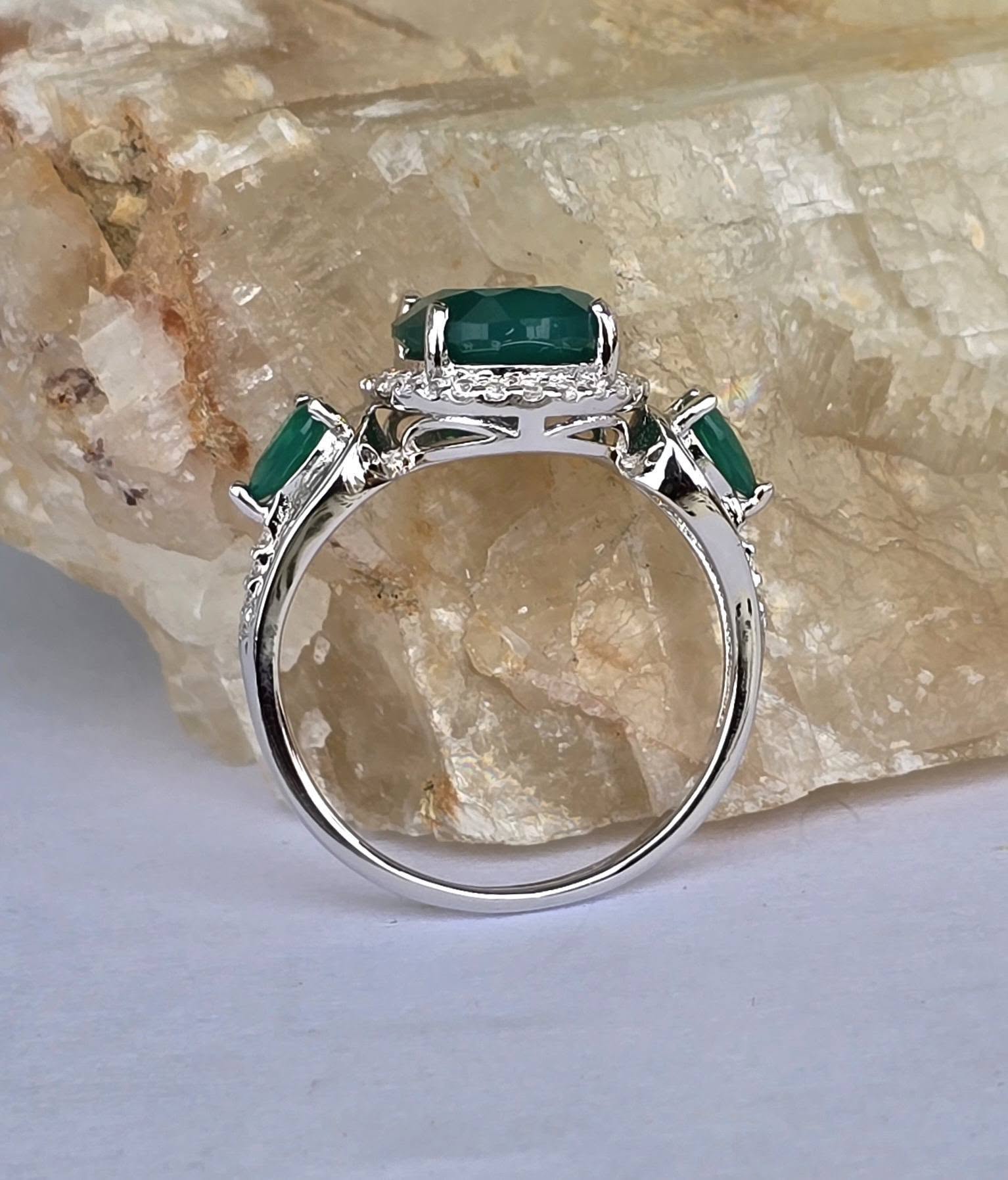 Inel contemporan spectaculos, din argint platinat, cu calcedonie verde naturală și pietre cubic zirconia.