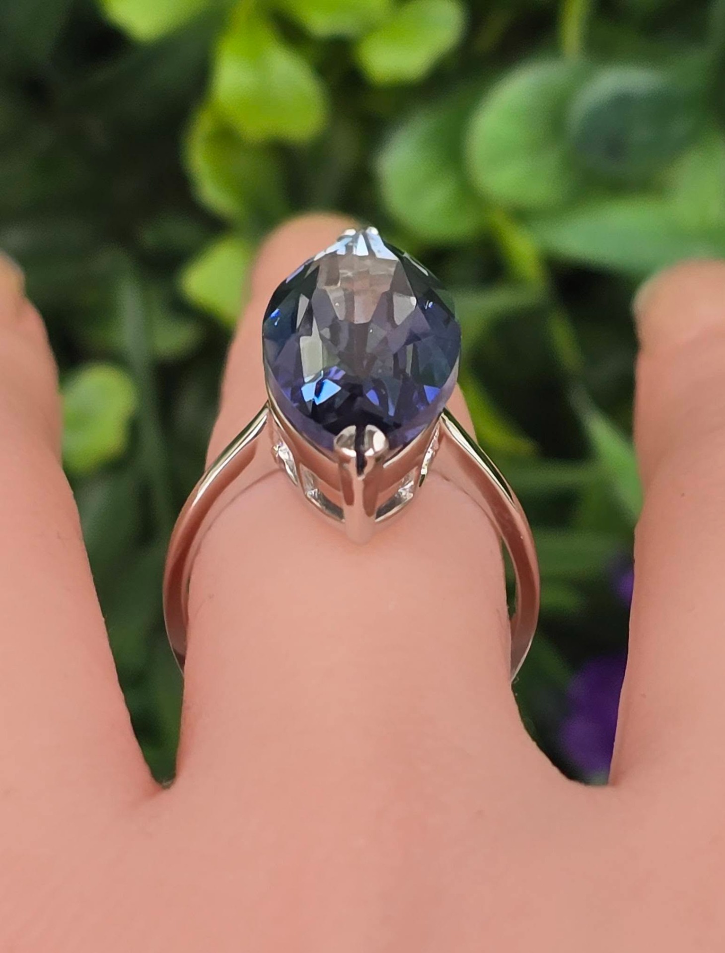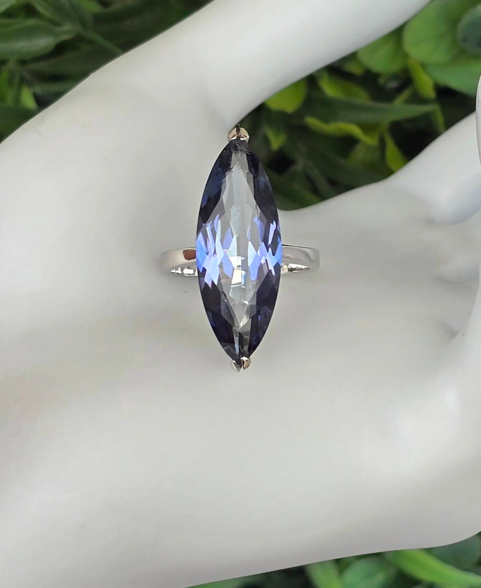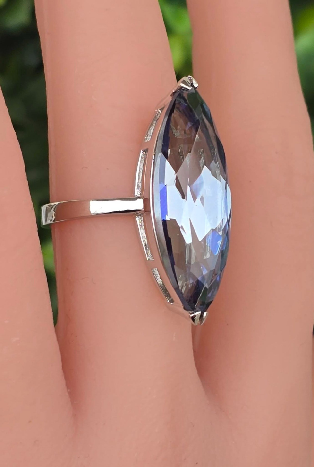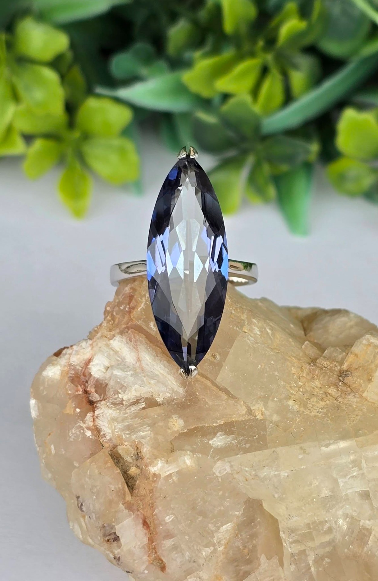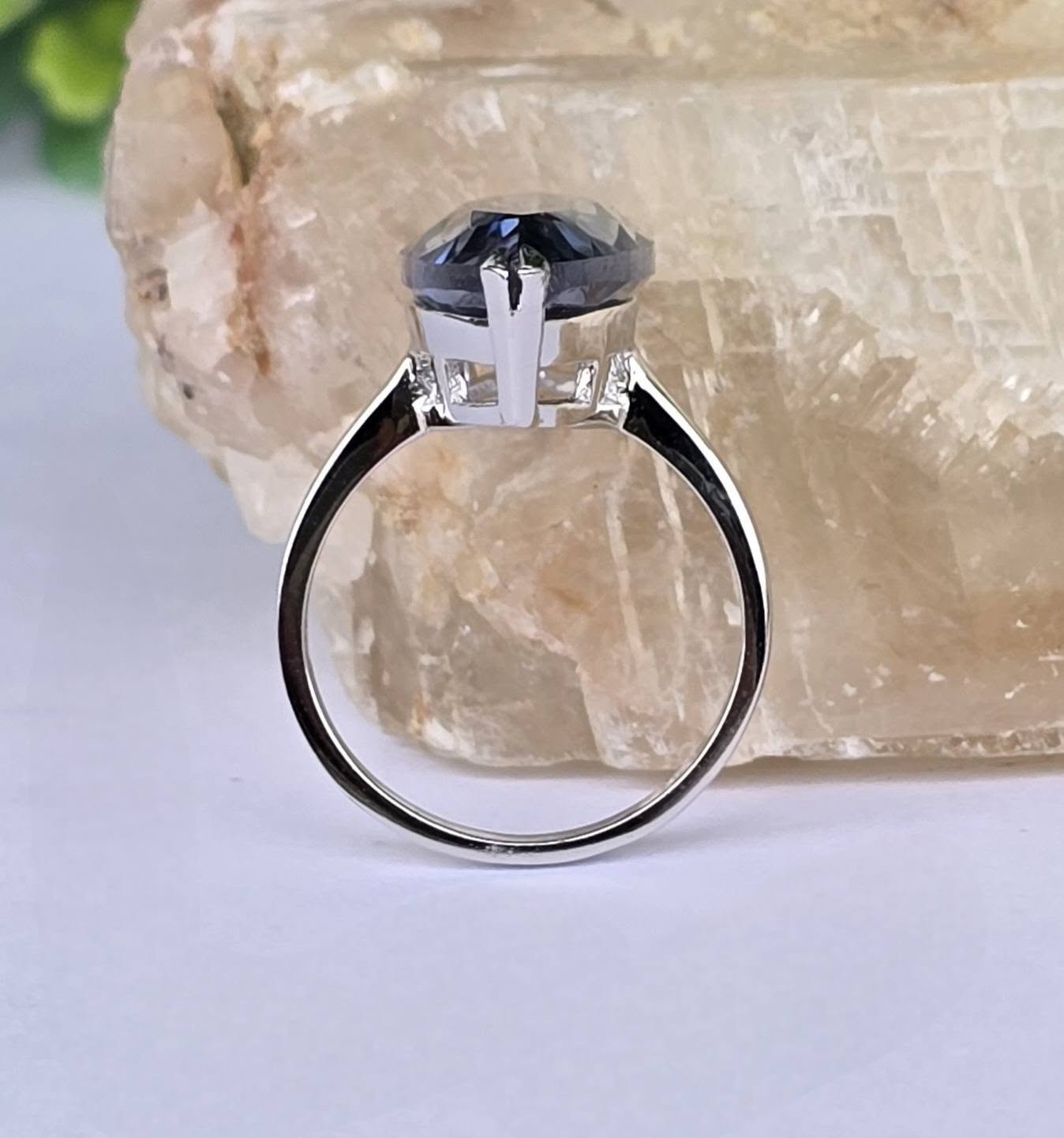 Inel contemporan spectaculos, din argint platinat, cu un superb safir de apă (iolit) natural.