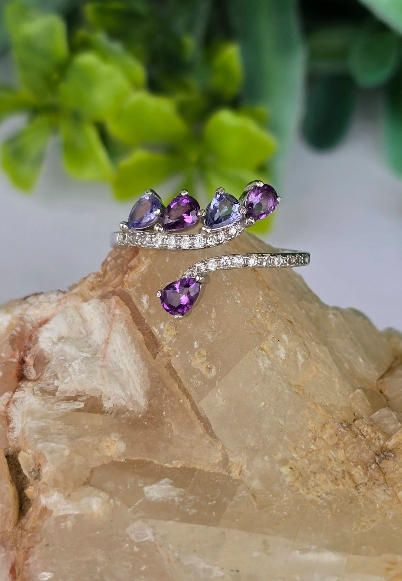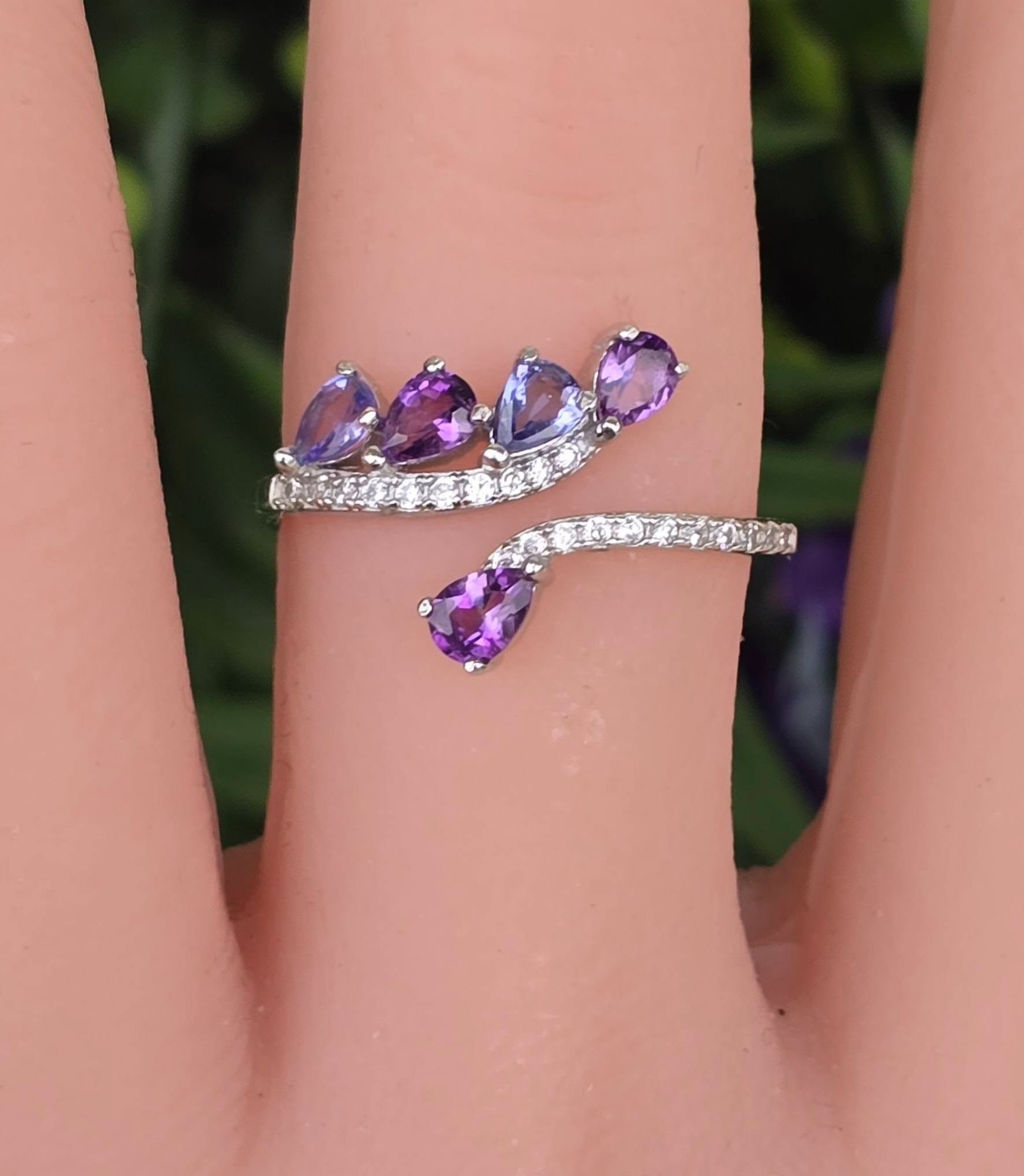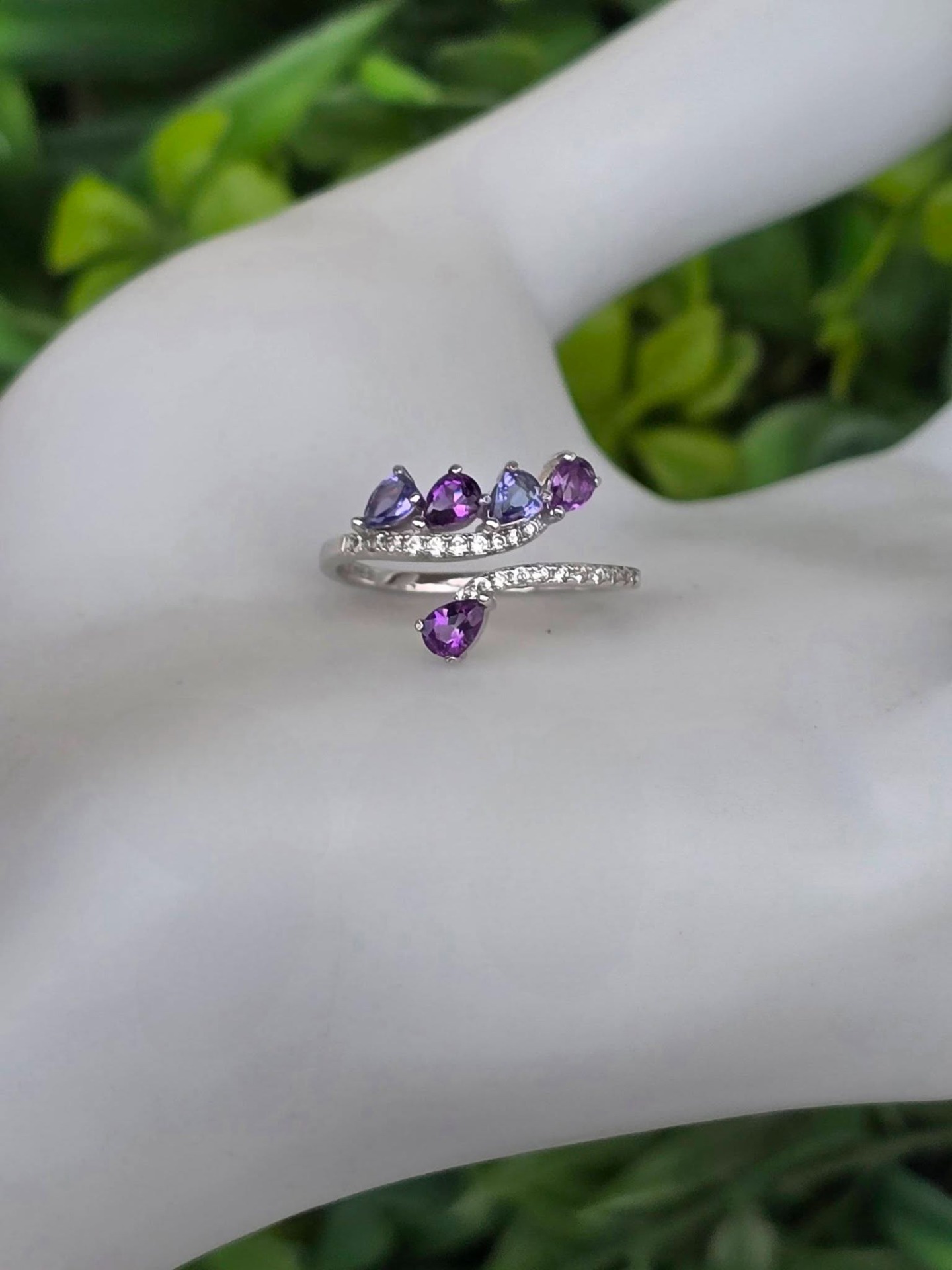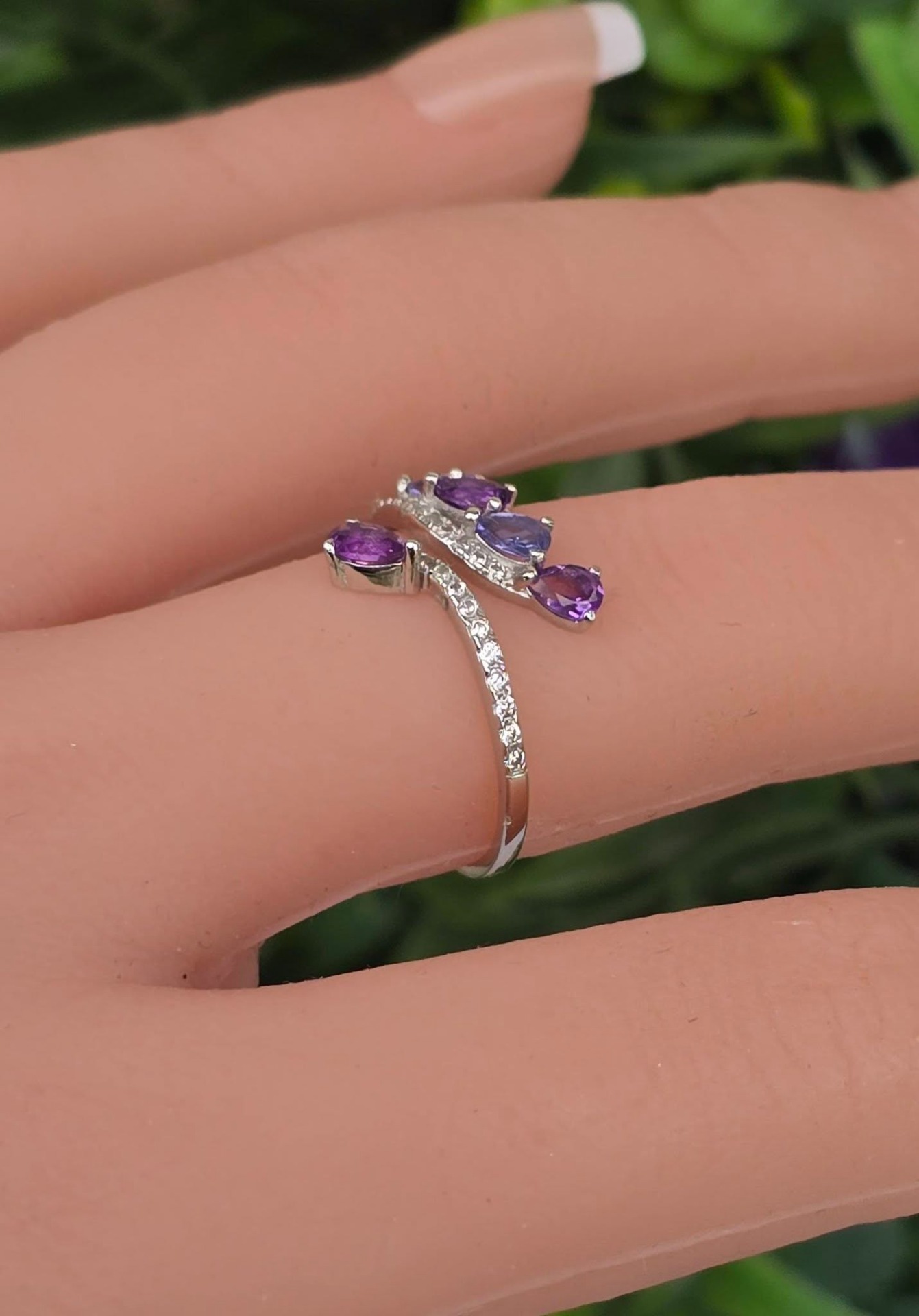 Inel contemporan superb, din argint platinat, cu 3 ametiste și 2 tanzanite naturale și pietre cubic zirconia.