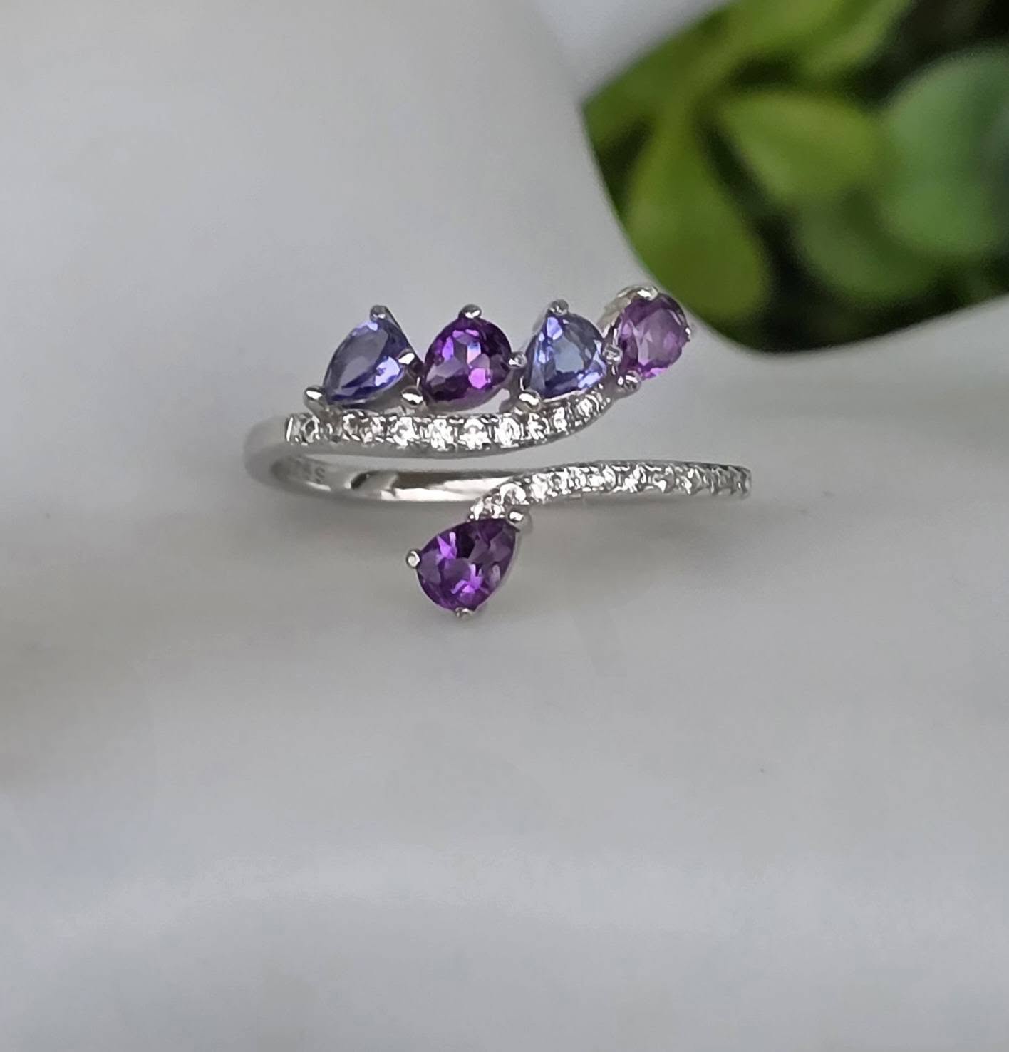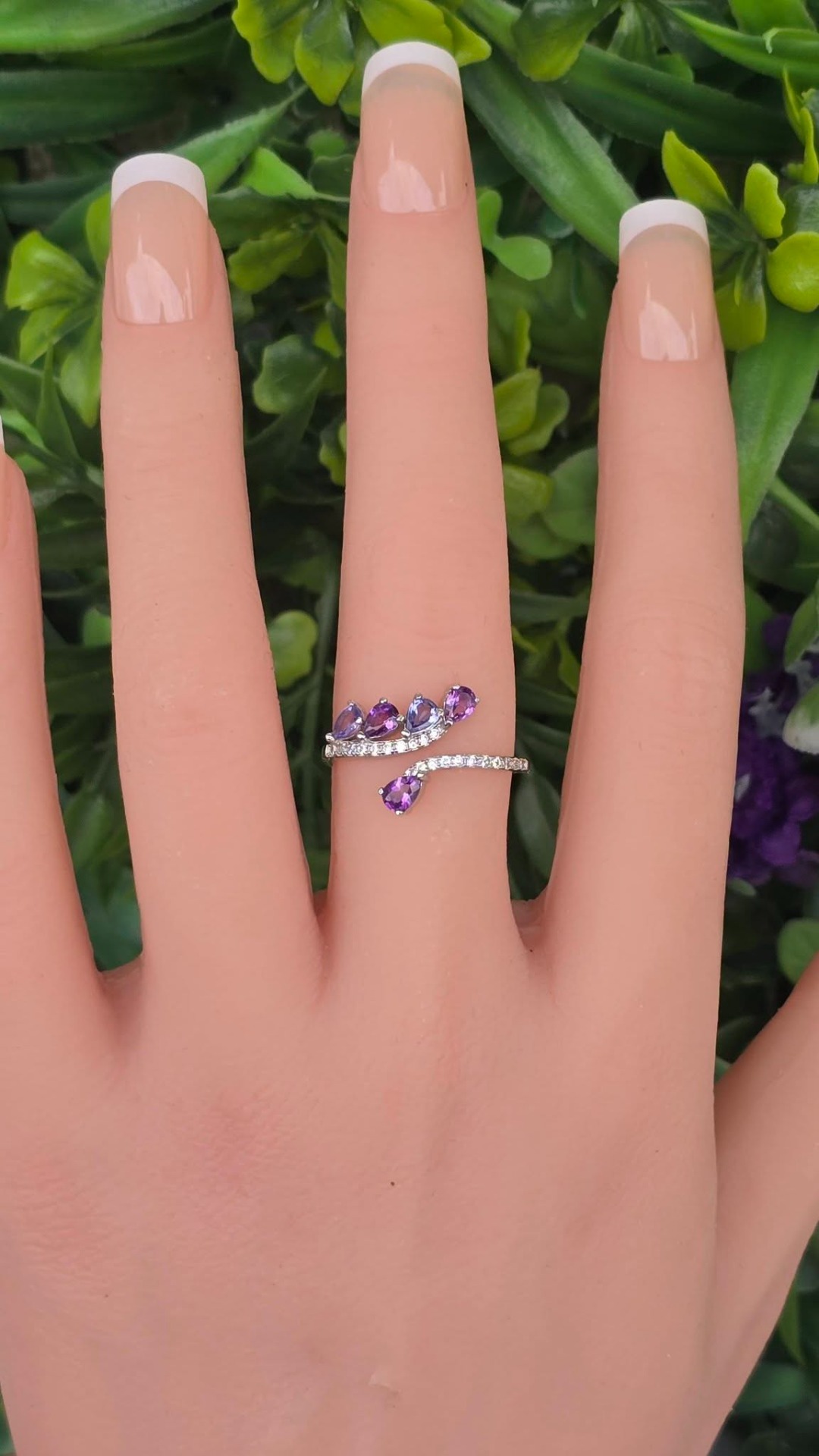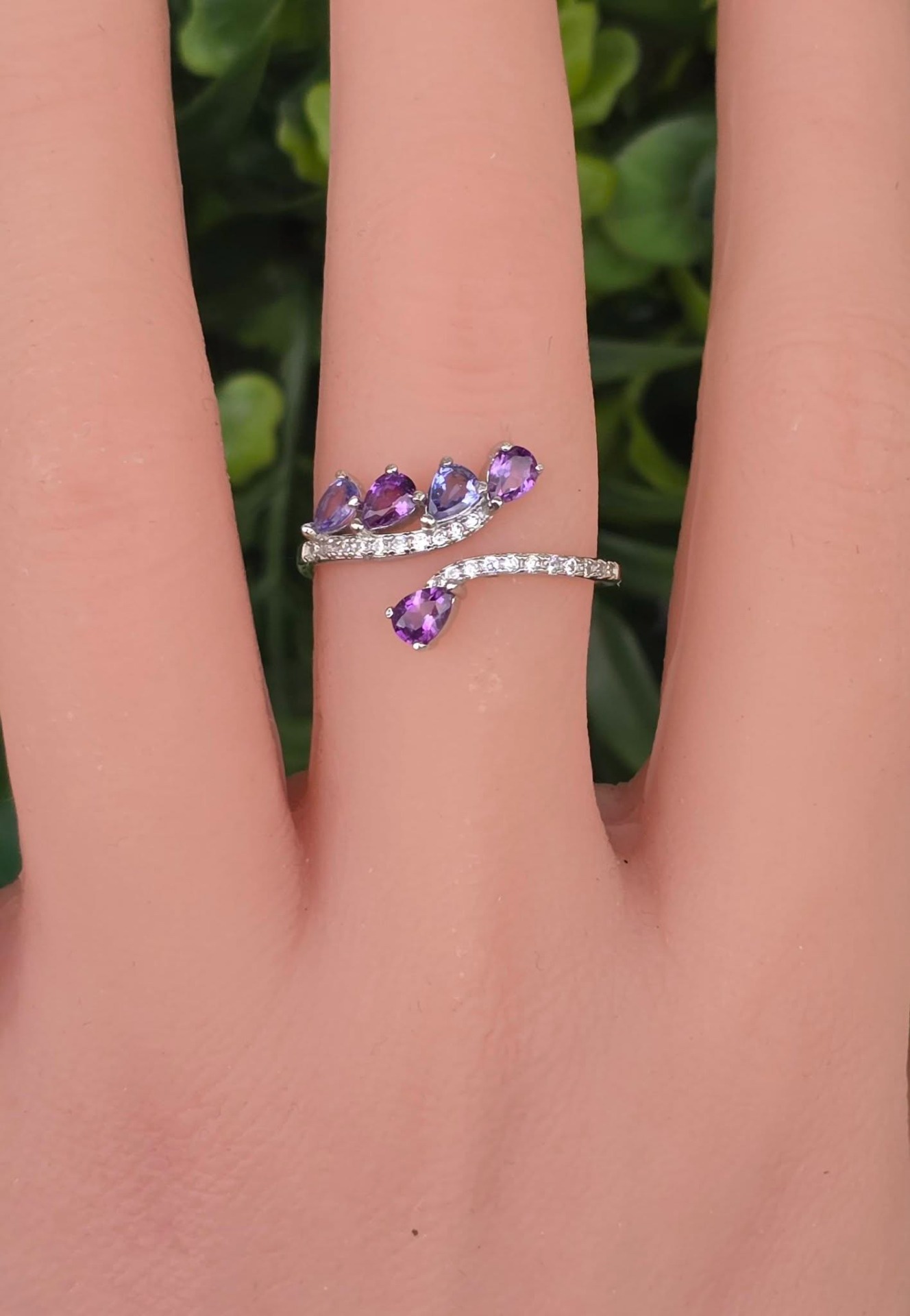 Inel contemporan superb, din argint platinat, cu 3 ametiste și 2 tanzanite naturale și pietre cubic zirconia.
