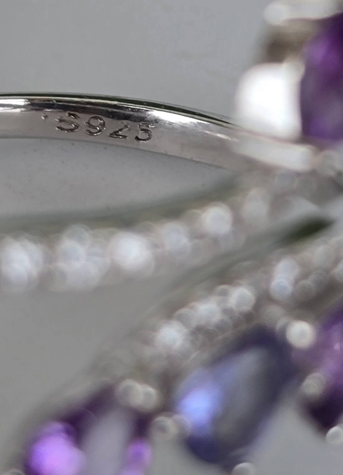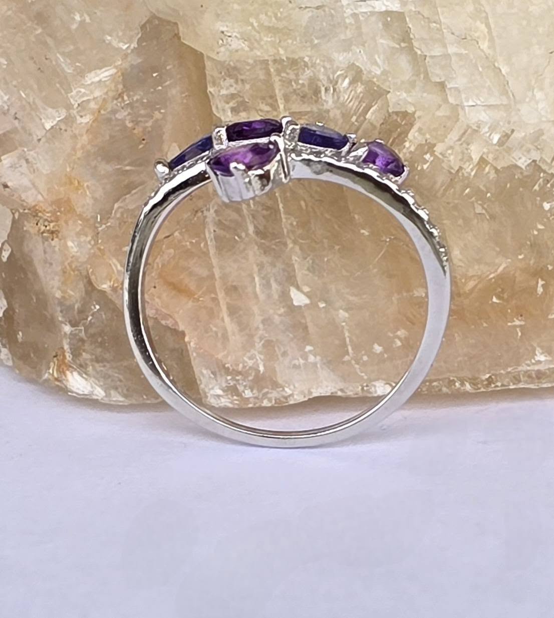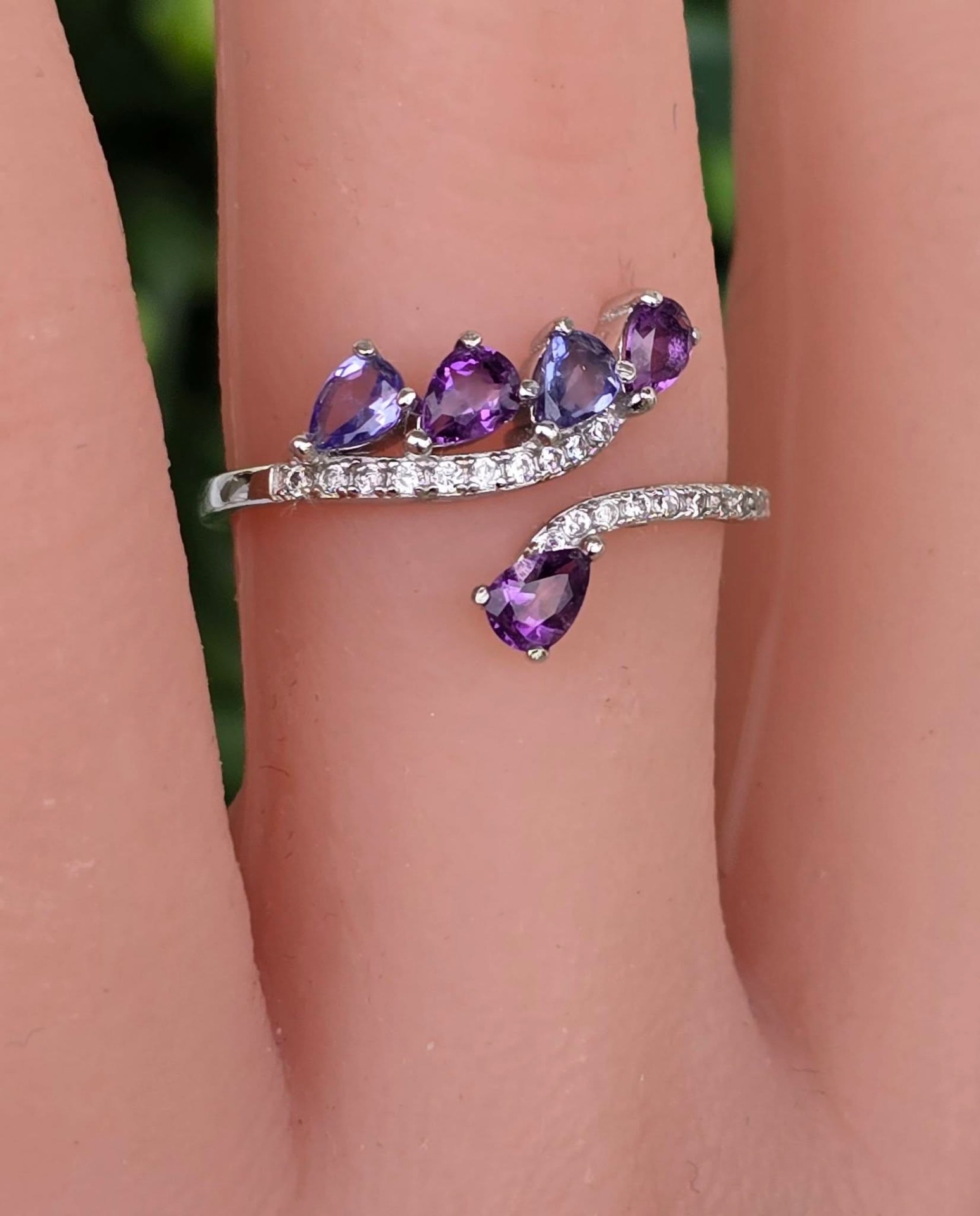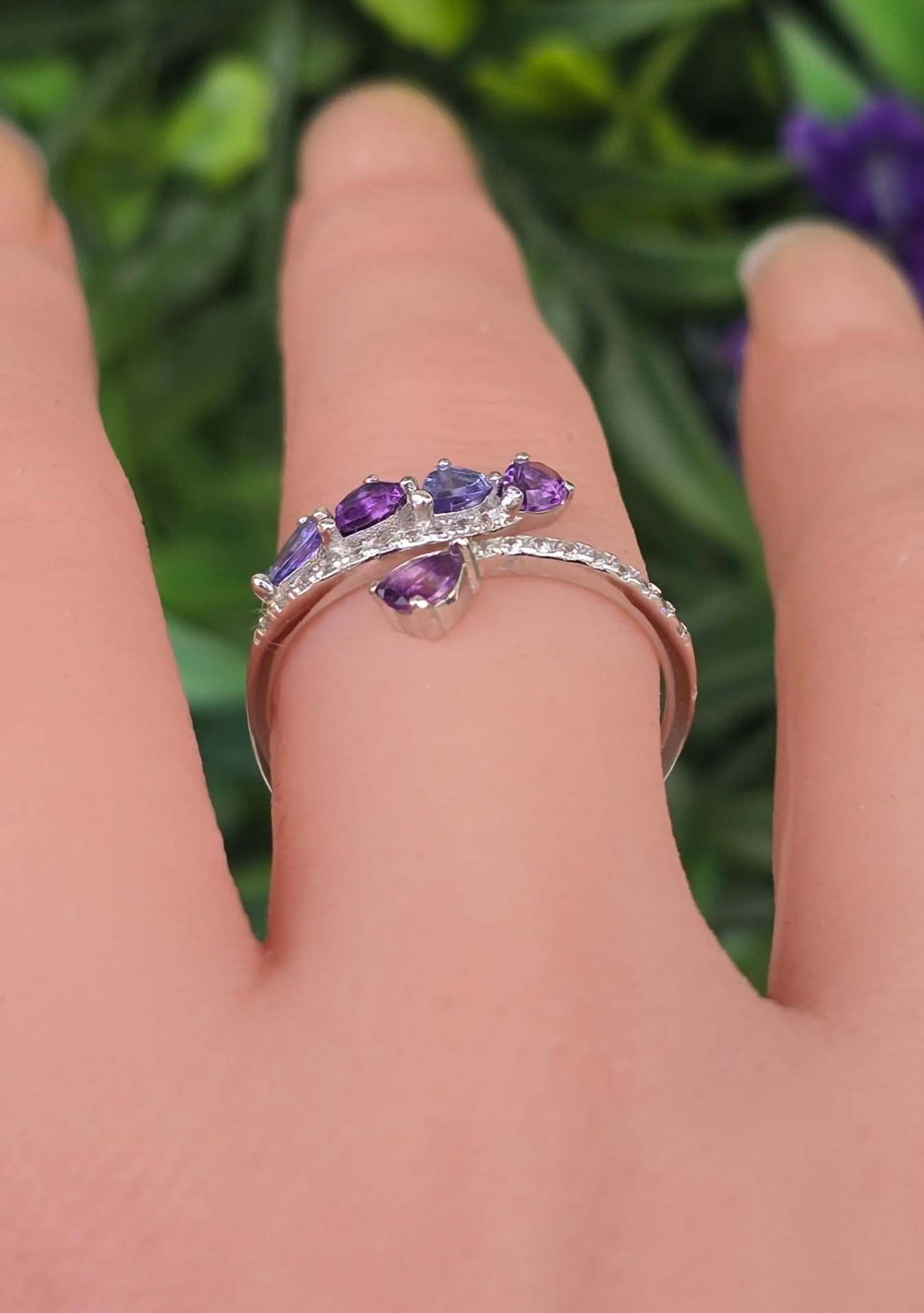 Inel contemporan superb, din argint platinat, cu 3 ametiste și 2 tanzanite naturale și pietre cubic zirconia.