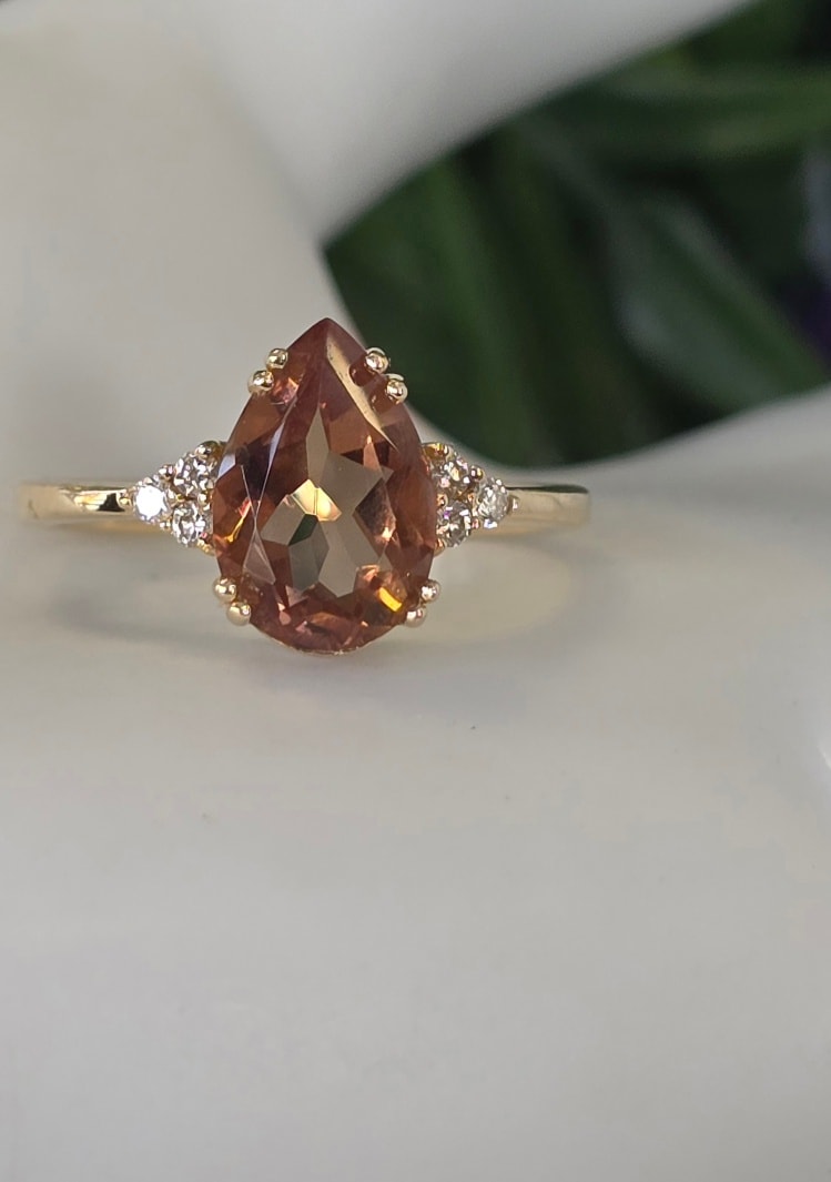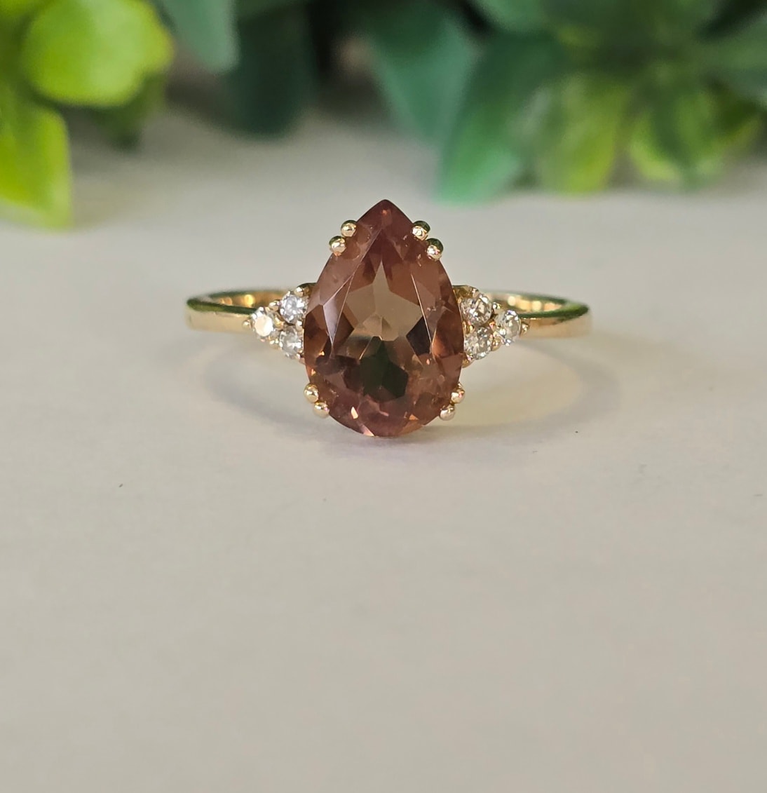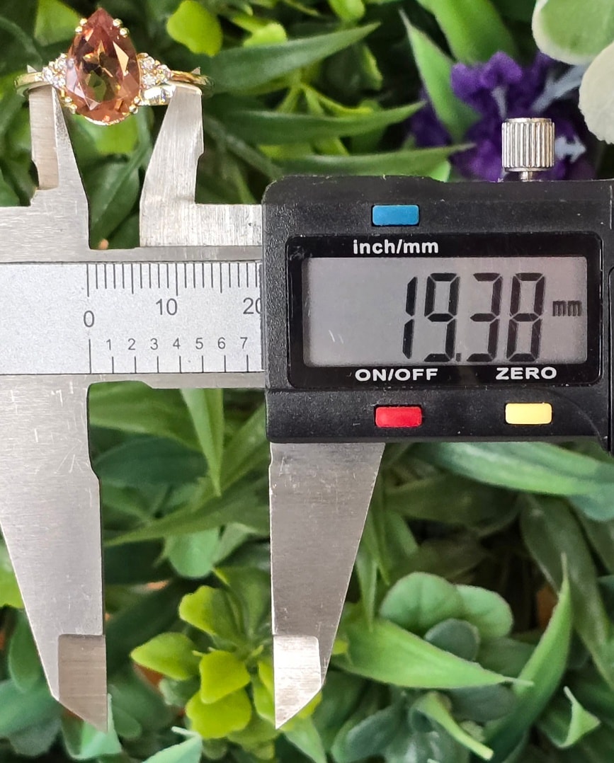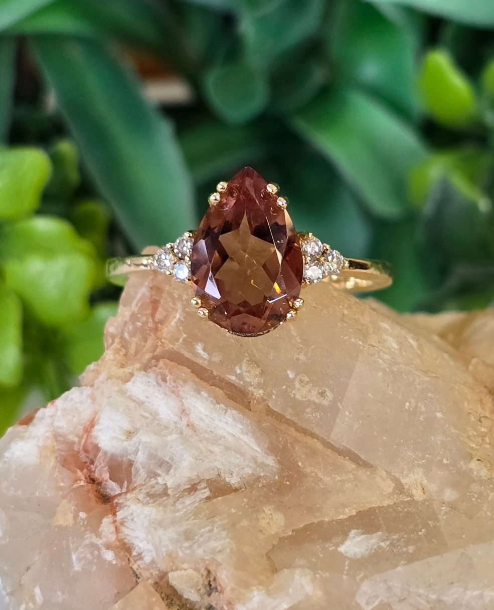 Inel deosebit din aur de 14K, cu zultanit de sinteză, piatră care își schimbă culoarea în funcție de lumină, între galben-verzui și mov-rozaliu și 6 diamante