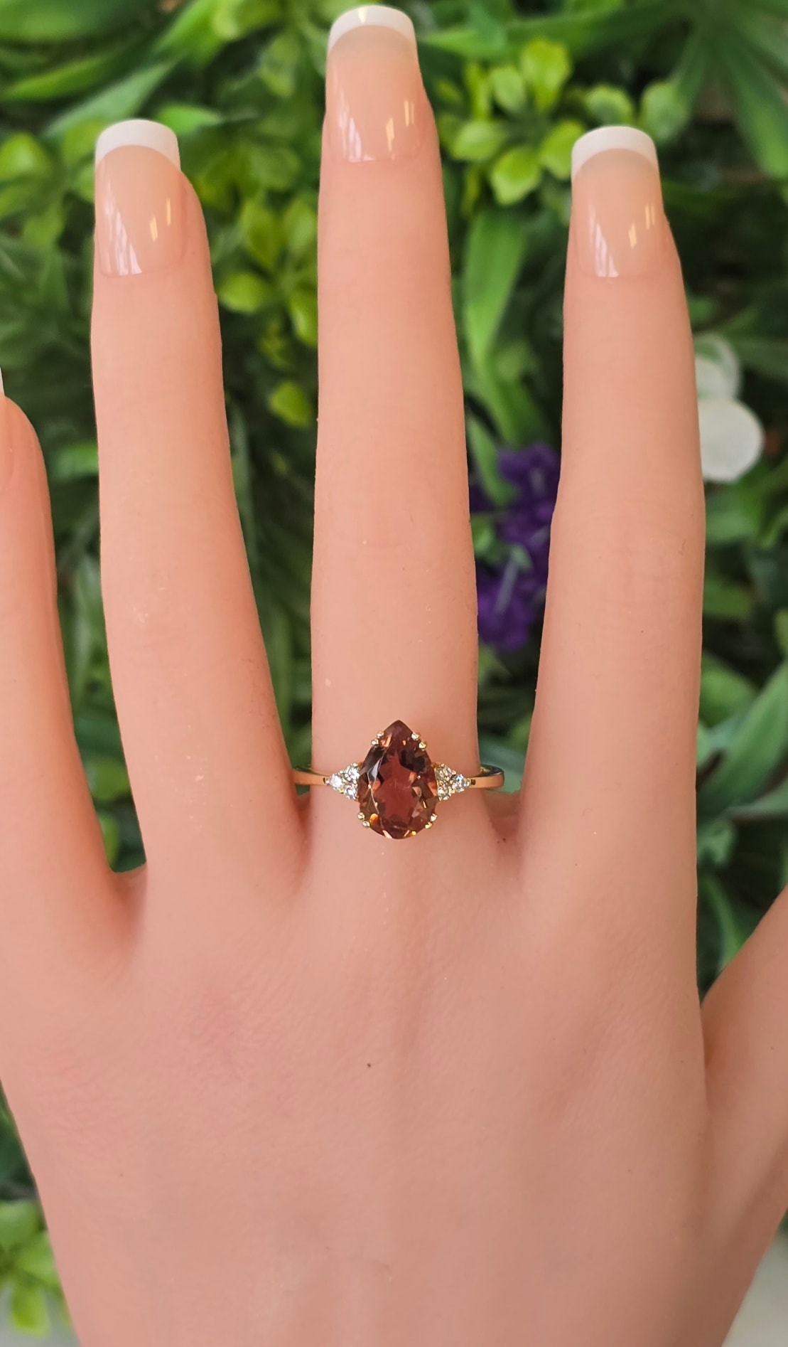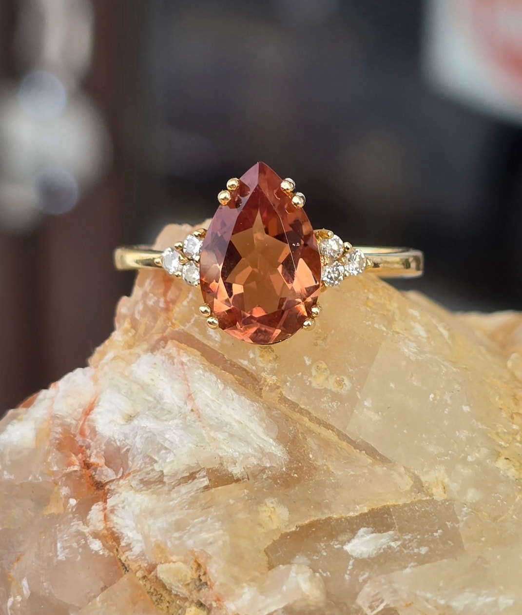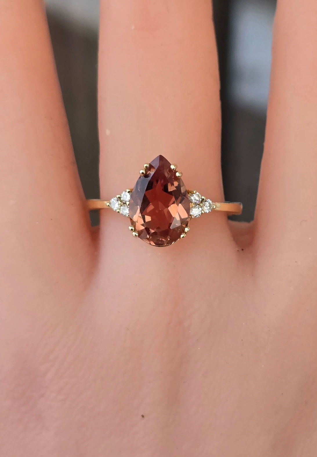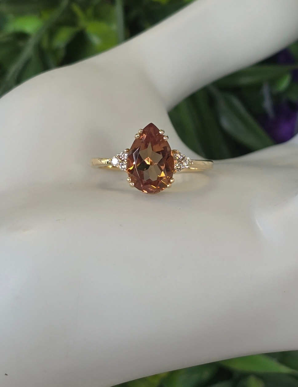 Inel deosebit din aur de 14K, cu zultanit de sinteză, piatră care își schimbă culoarea în funcție de lumină, între galben-verzui și mov-rozaliu și 6 diamante