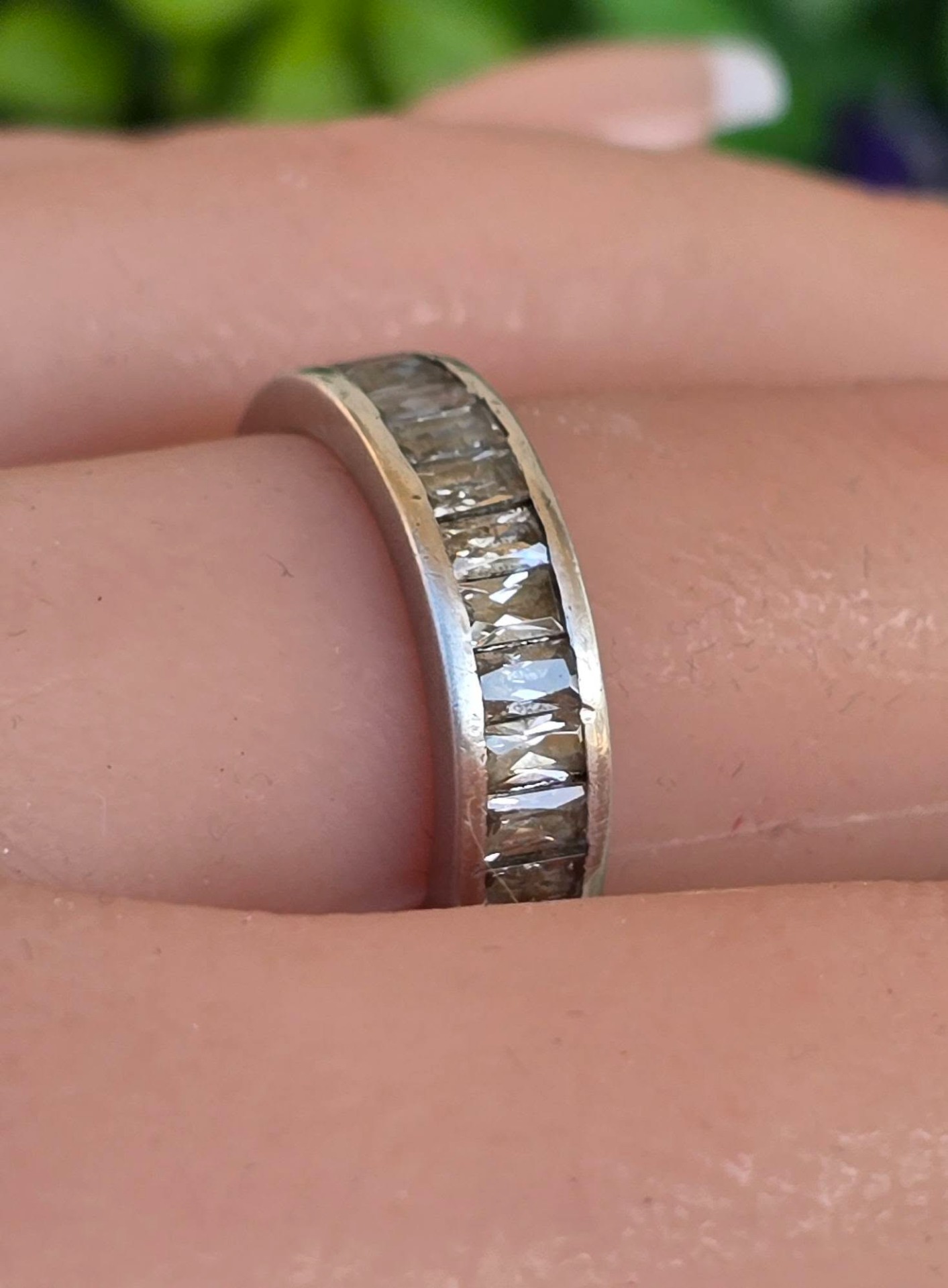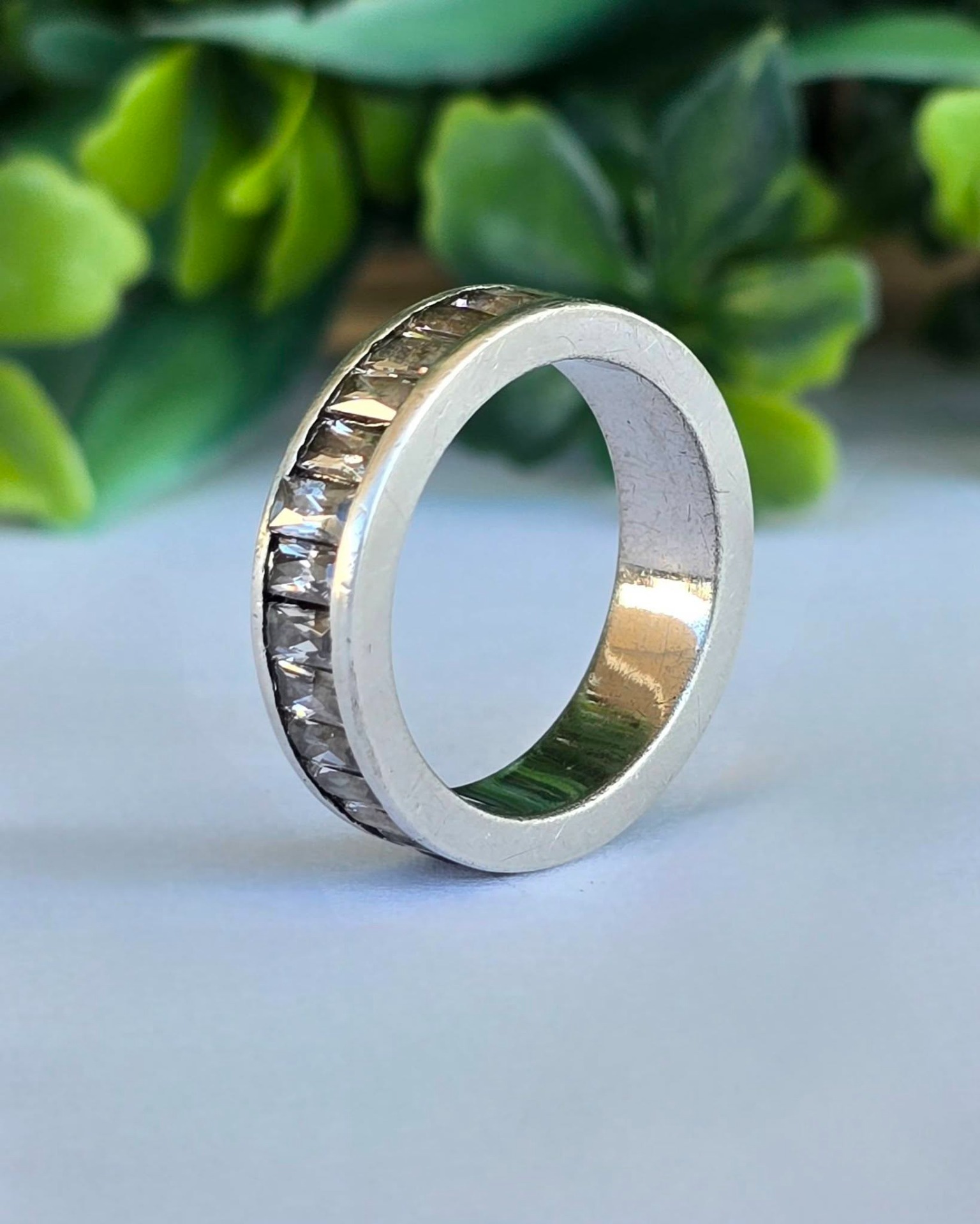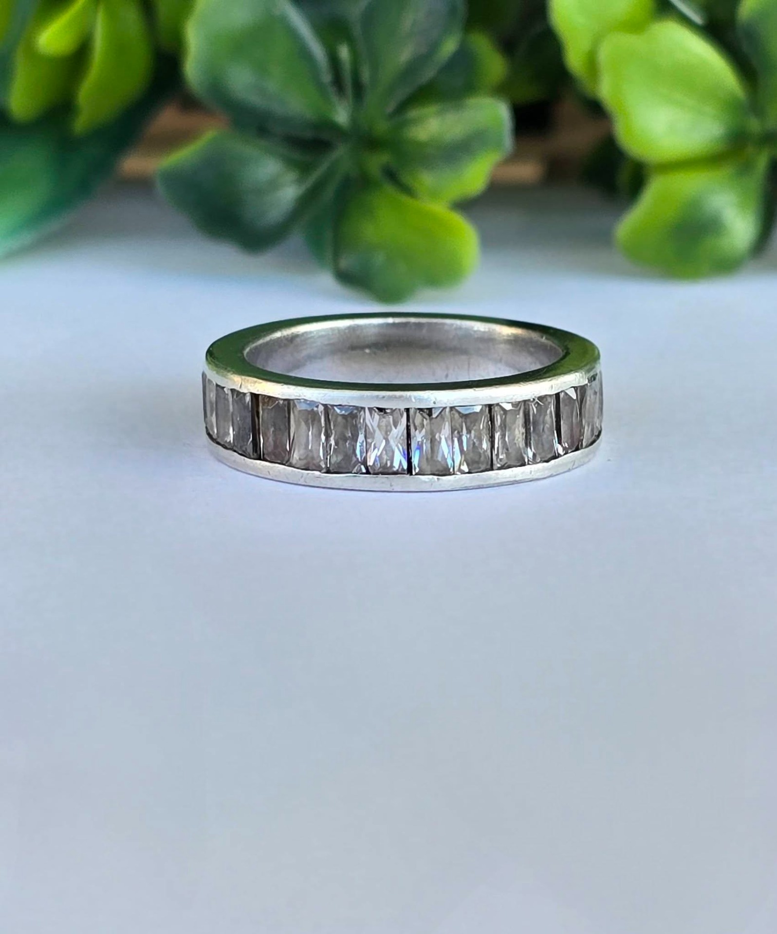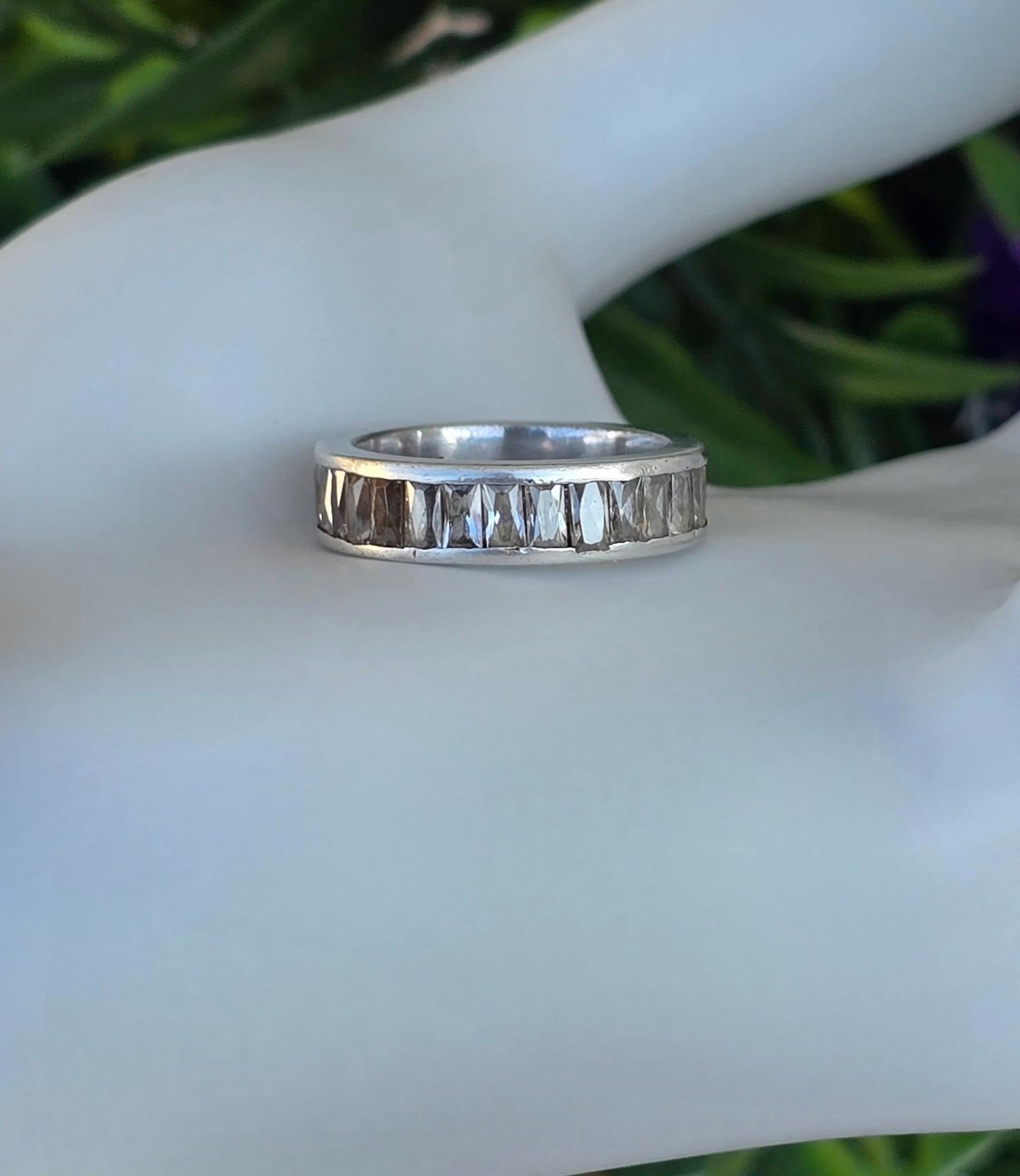 Inel "eternity" vechi, din argint, cu baghete din cuarț alb (cristal de stâncă) natural.