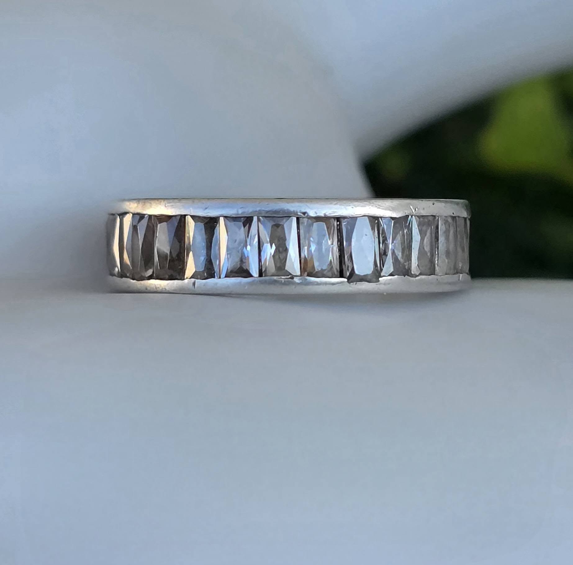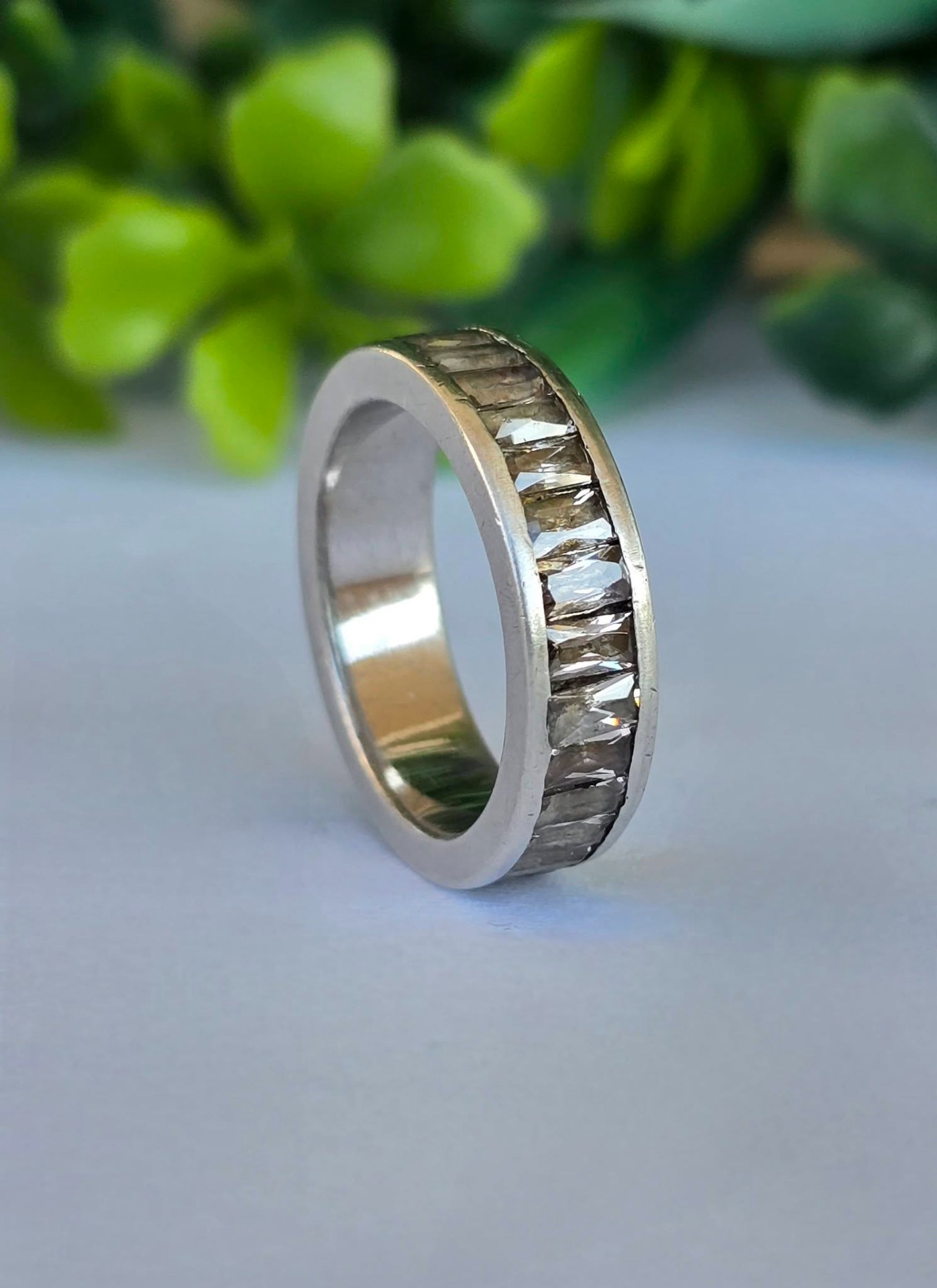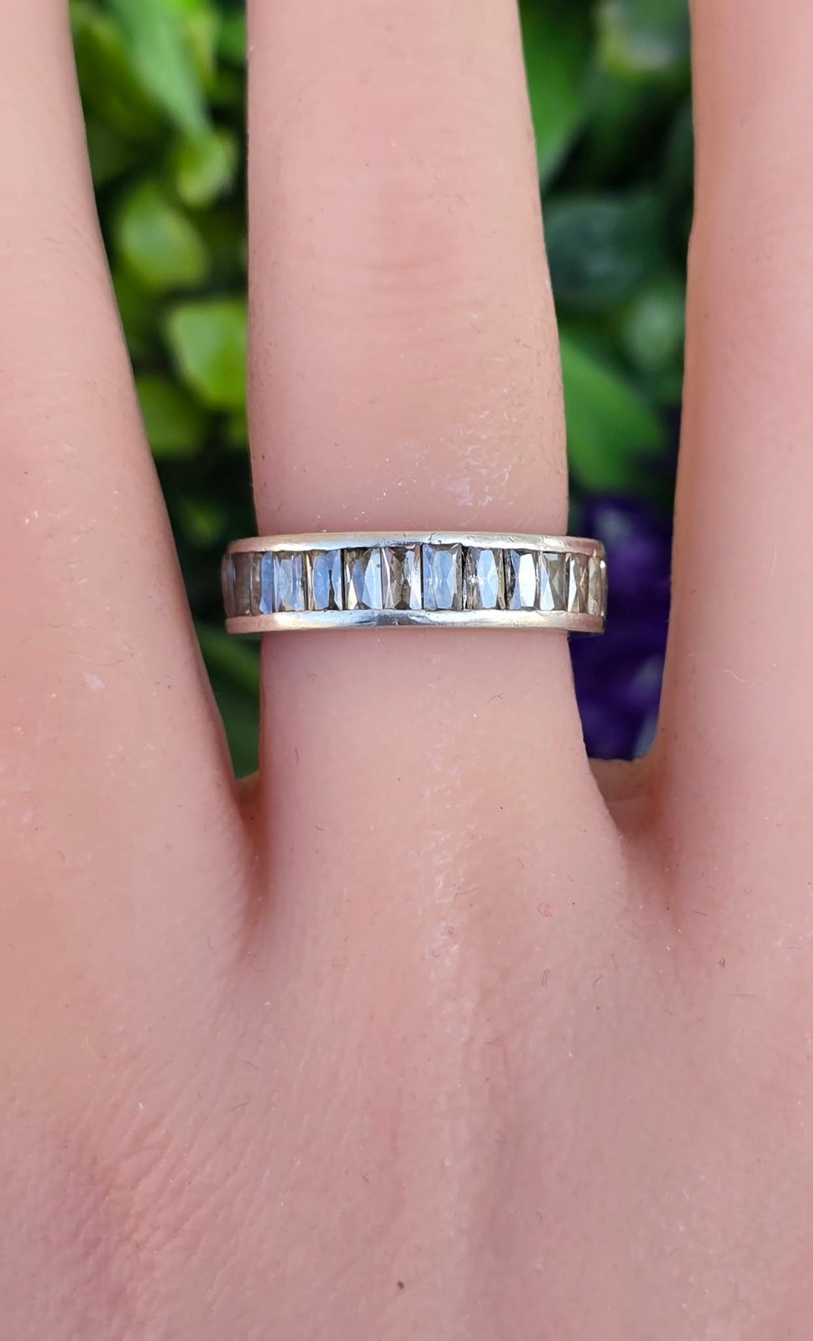 Inel "eternity" vechi, din argint, cu baghete din cuarț alb (cristal de stâncă) natural.