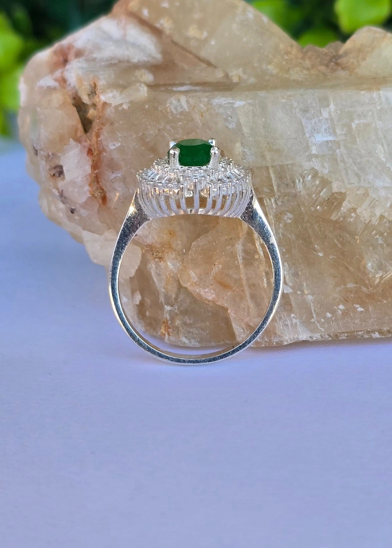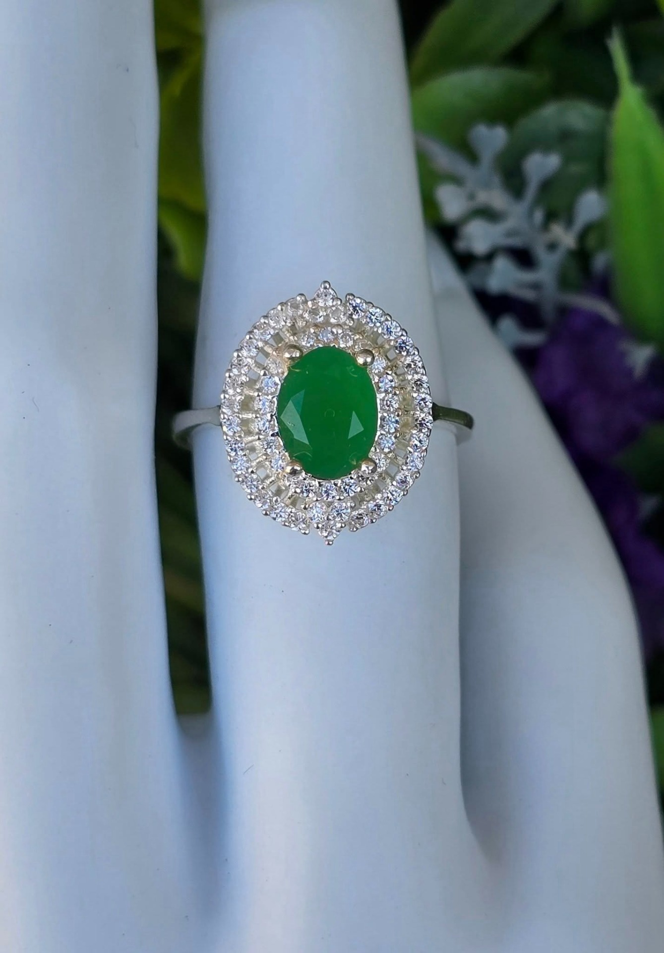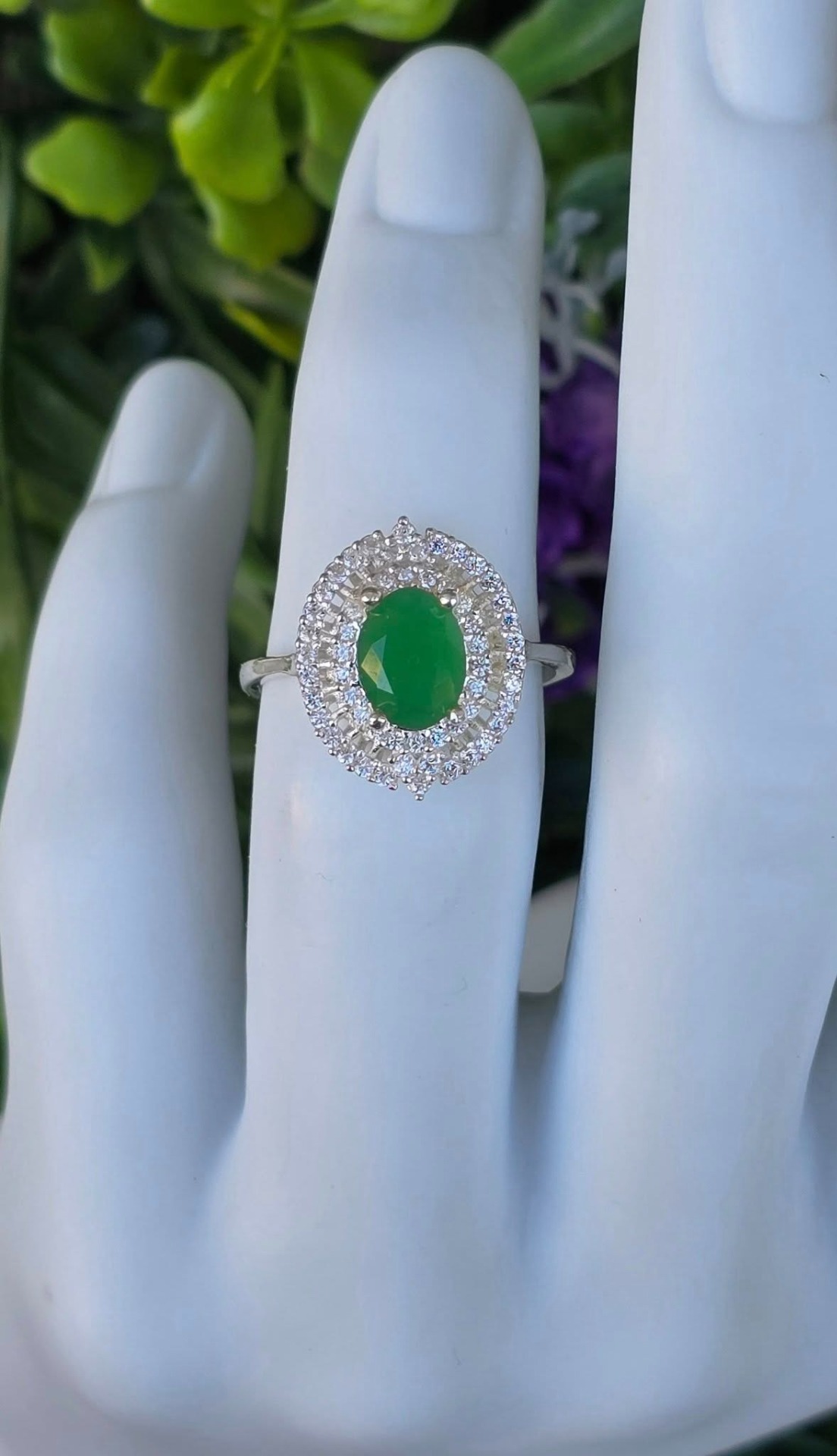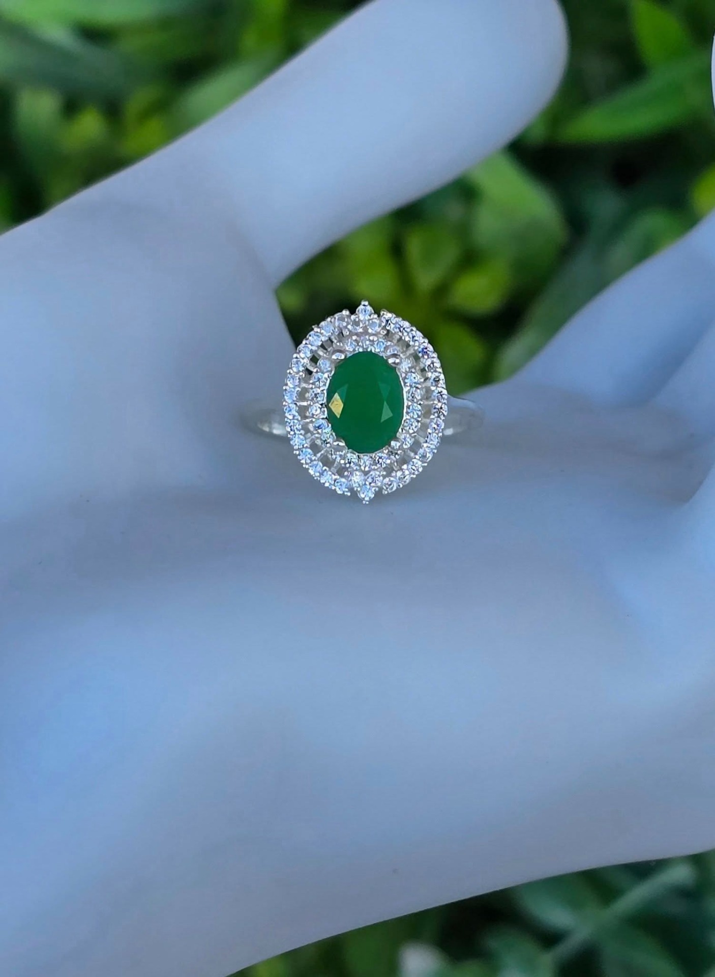 Inel modernist din argint, cu calcedonie verde și pietre cubic zirconia.