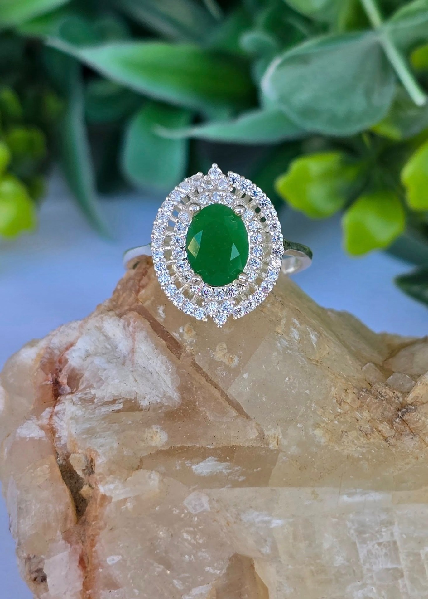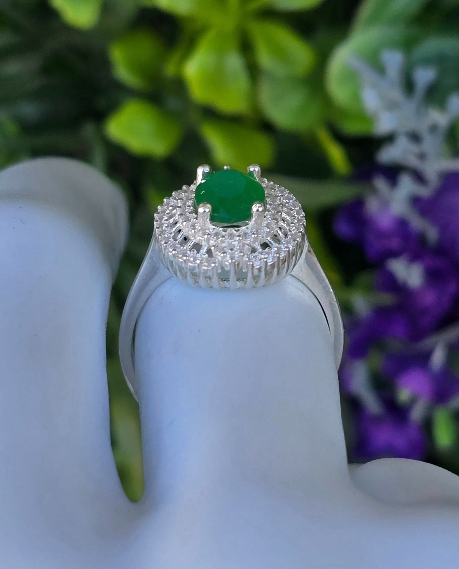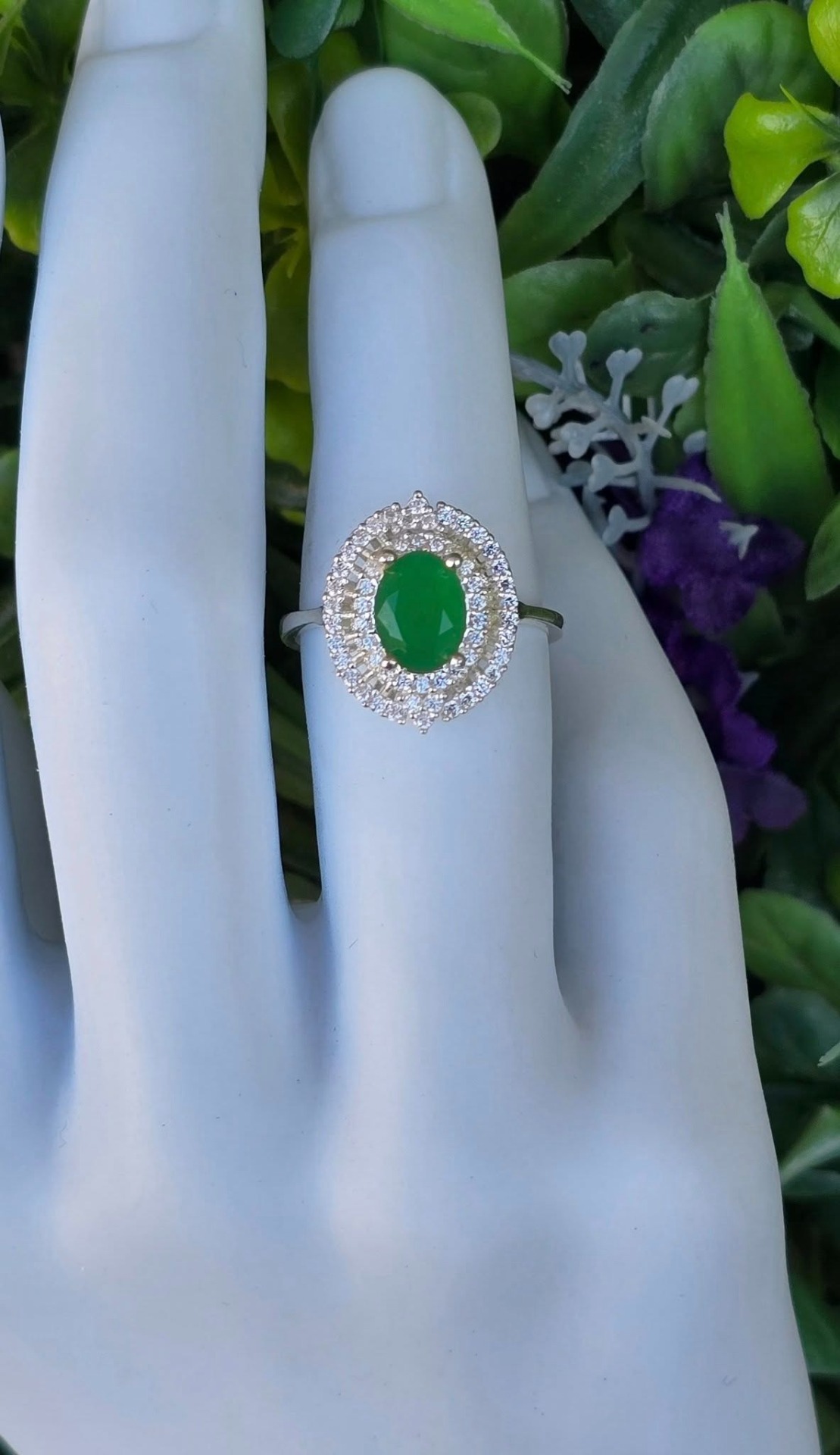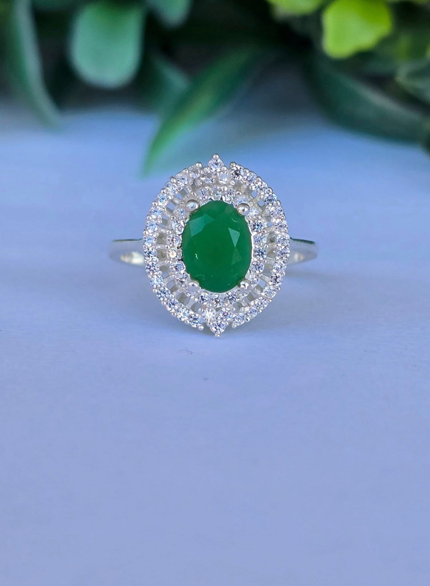 Inel modernist din argint, cu calcedonie verde și pietre cubic zirconia.