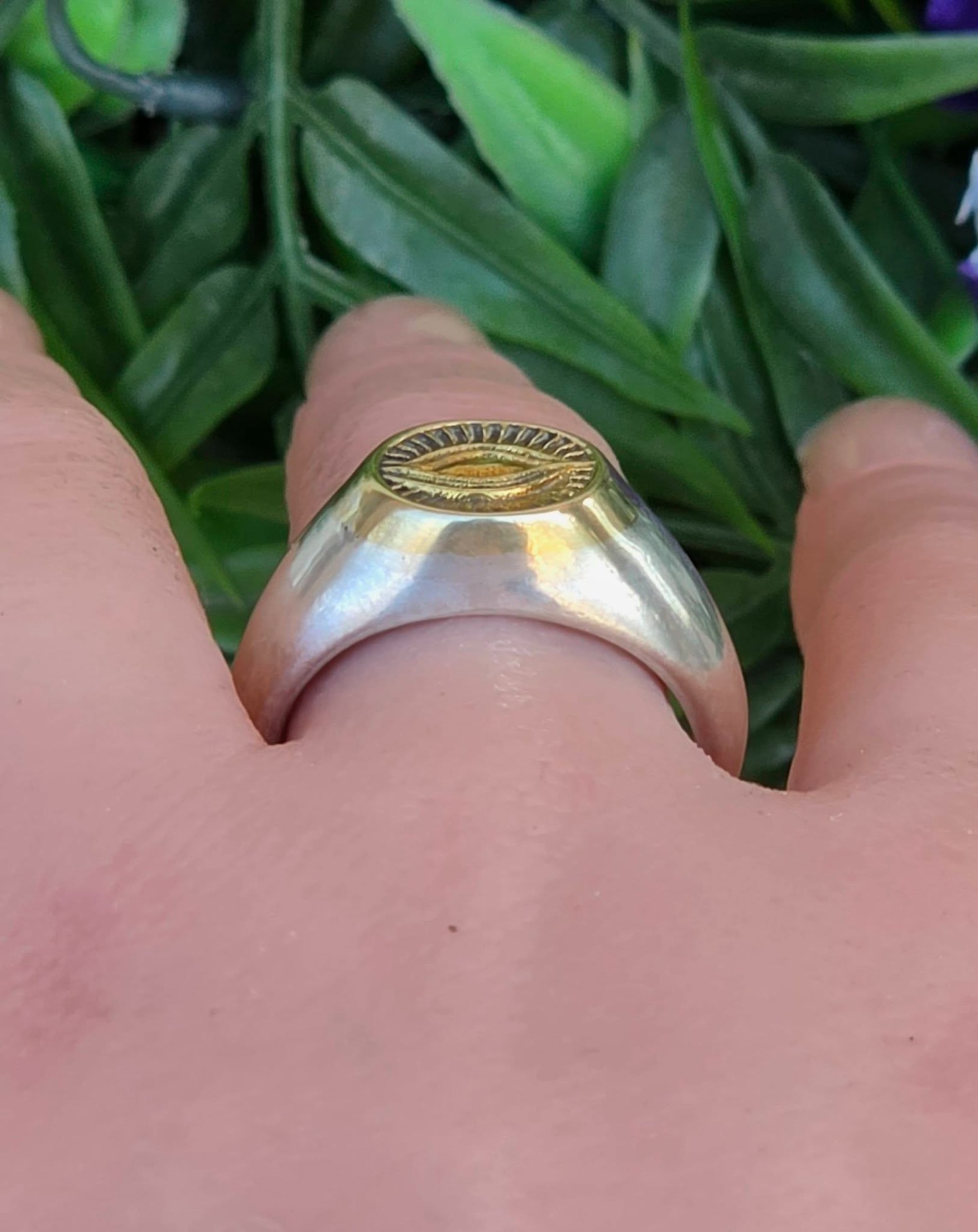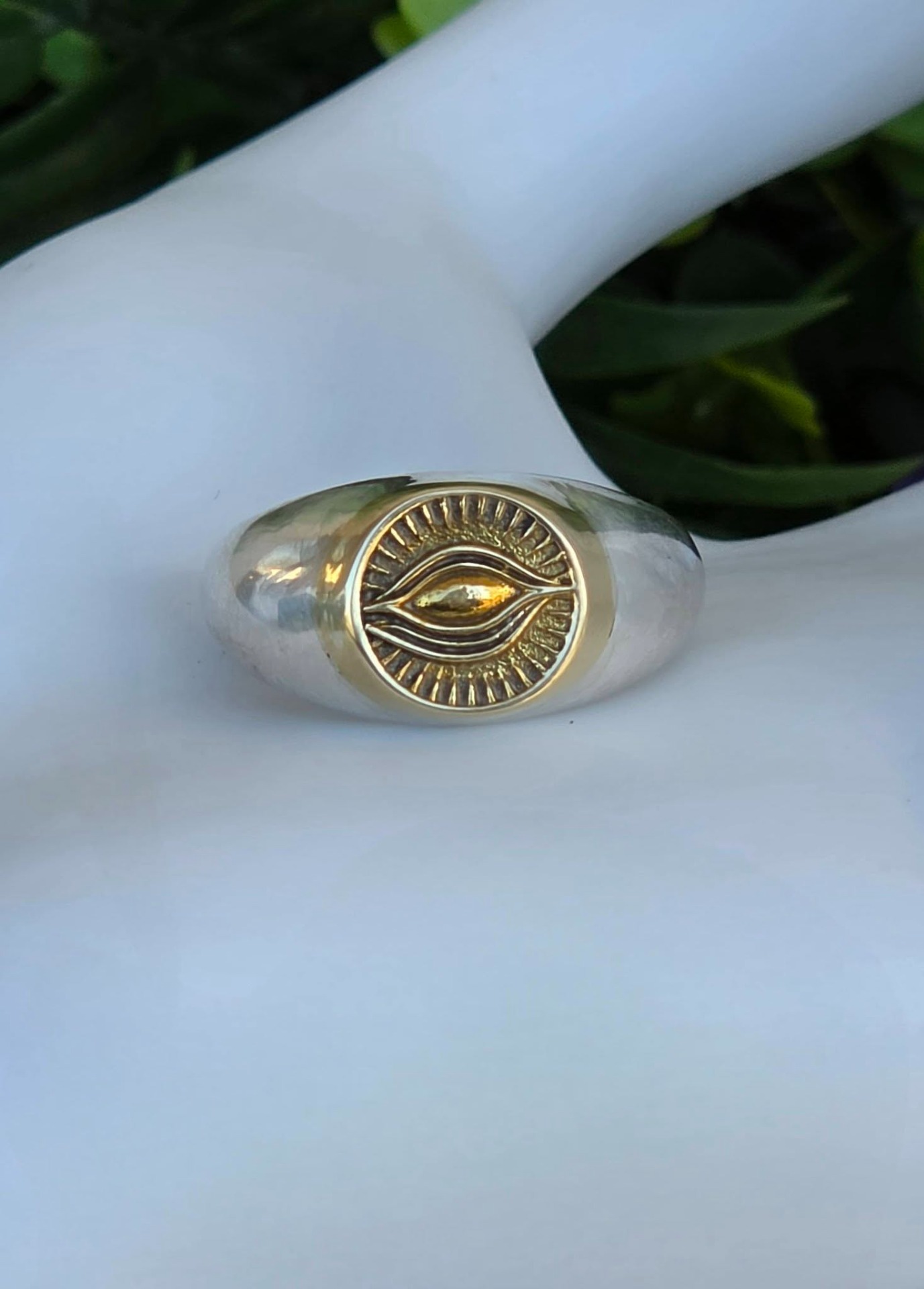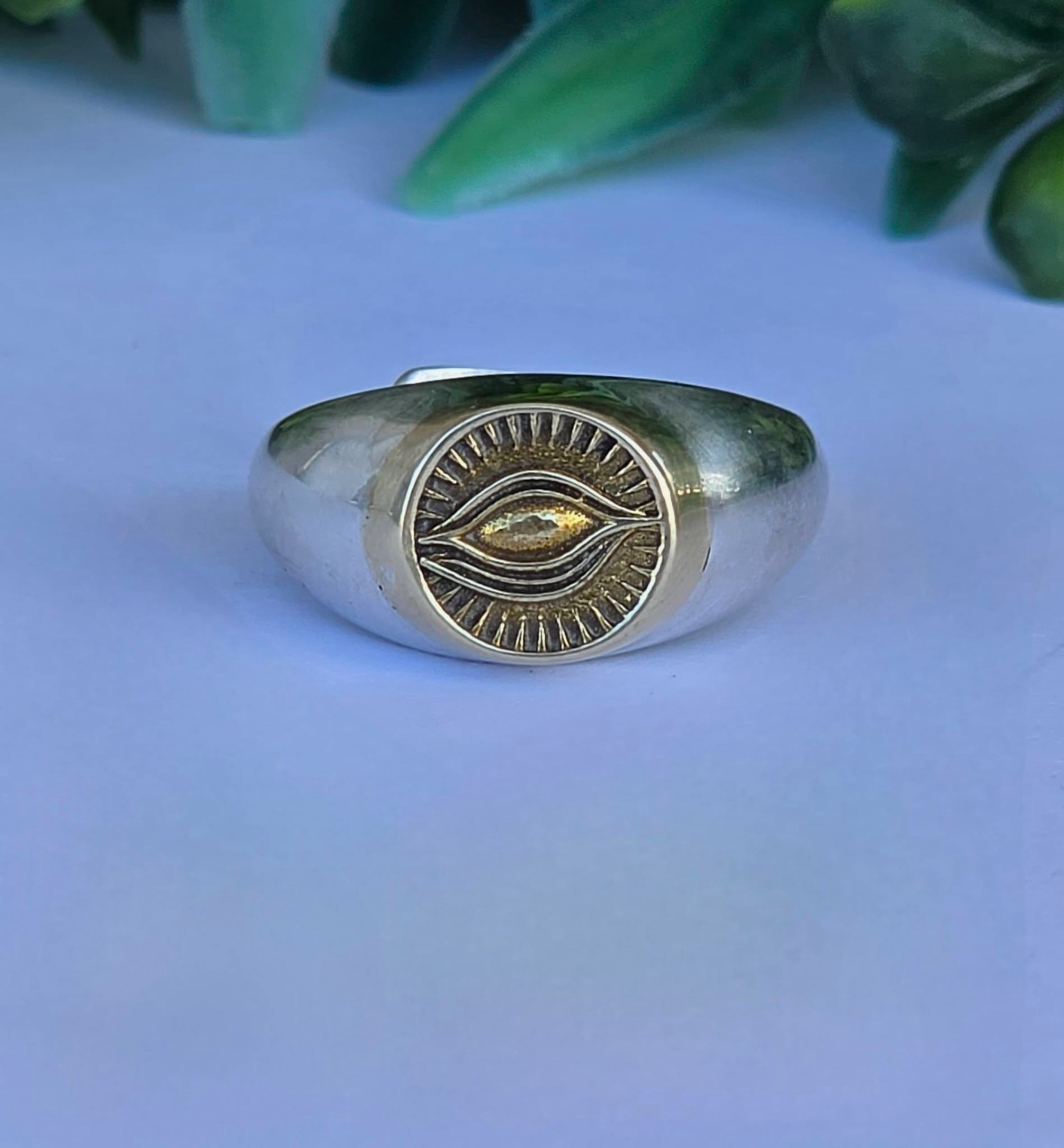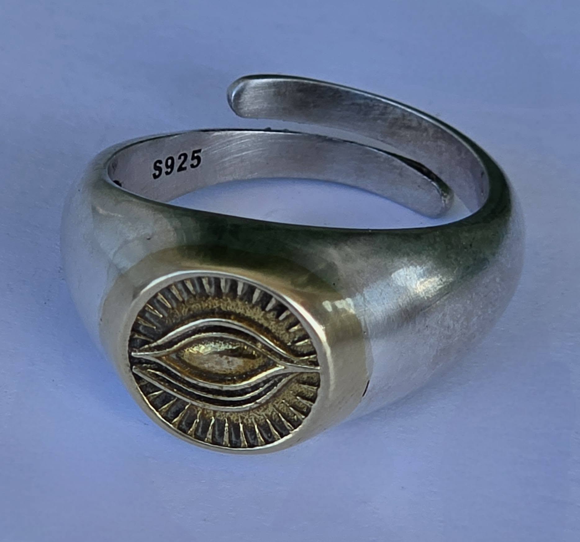 Inel modernist din argint și argint aurit, de tip "sigiliu", cu simbol masonic "Ochiul Providenței" (Ochiul Atotvăzător sau Ochiul lui Dumnezeu).