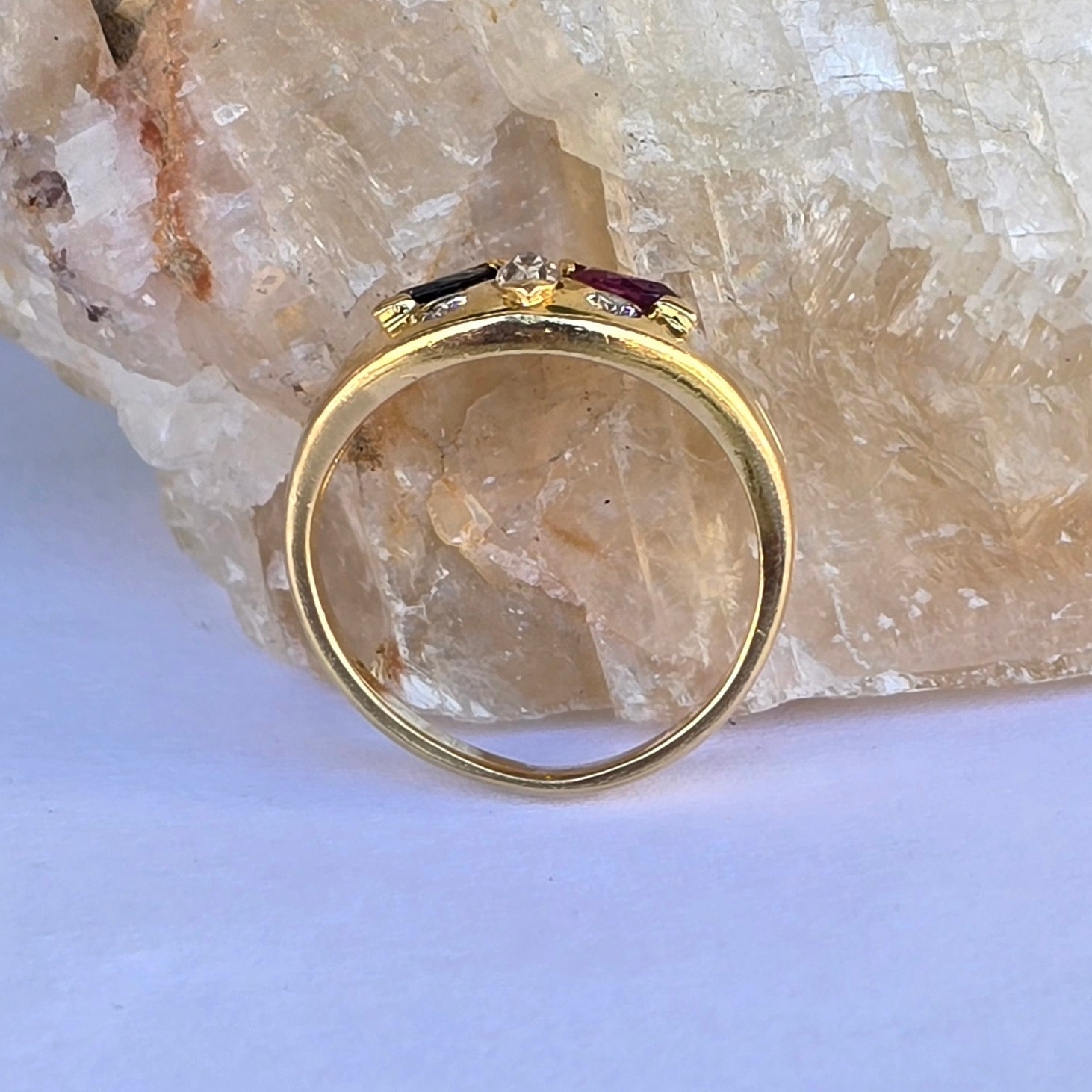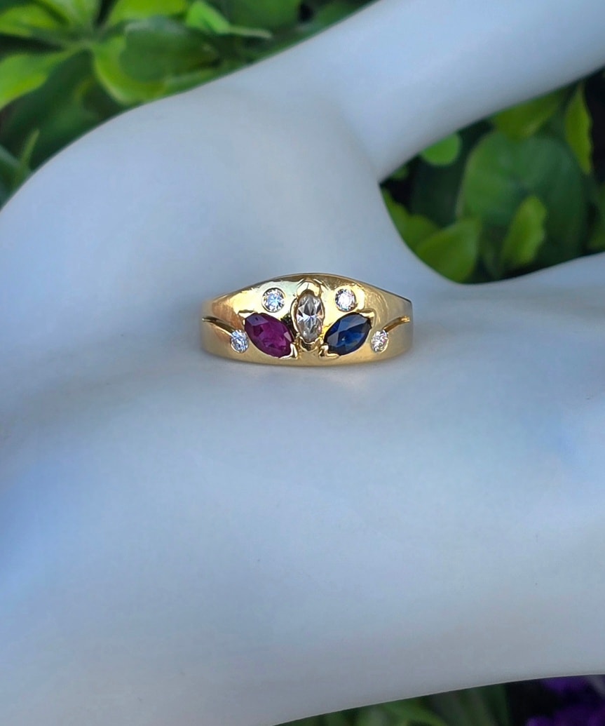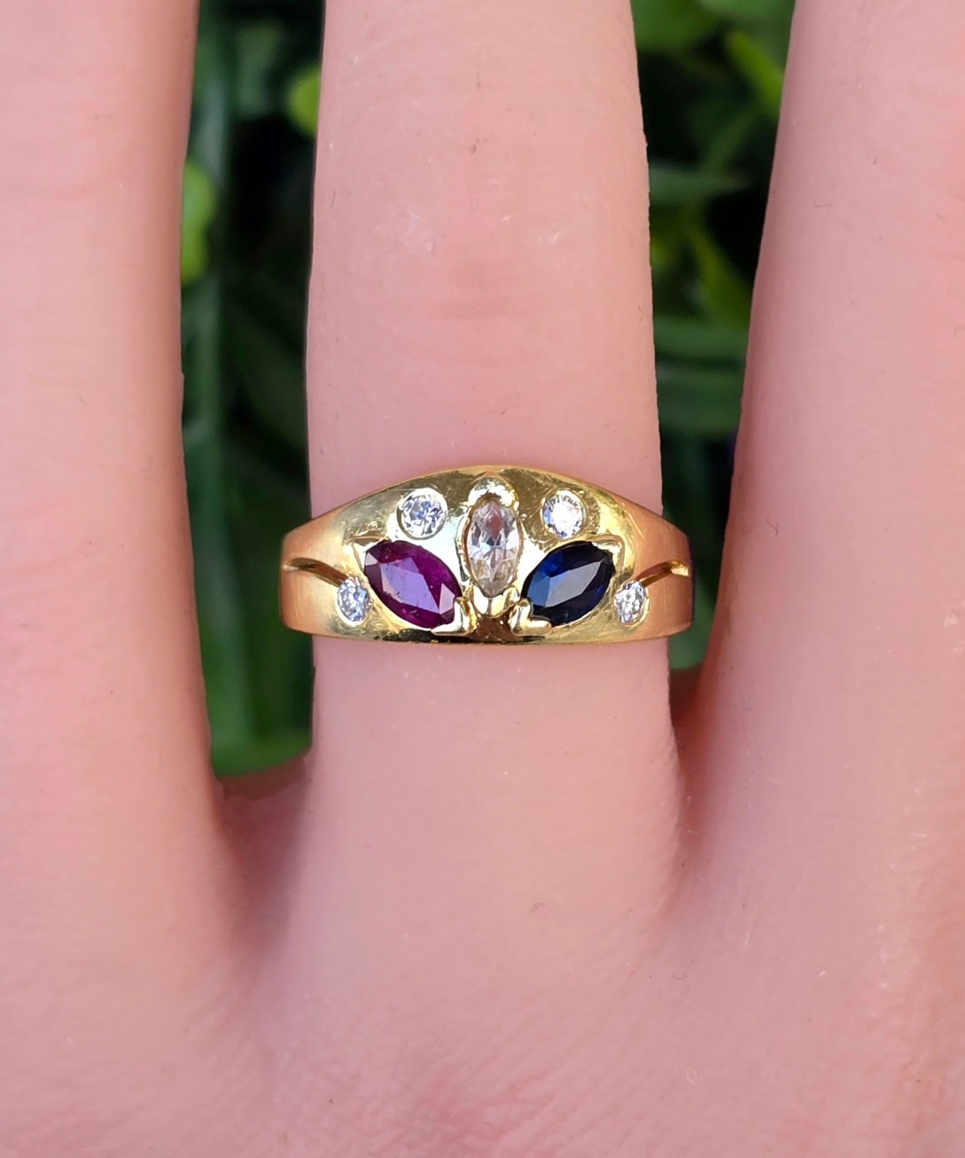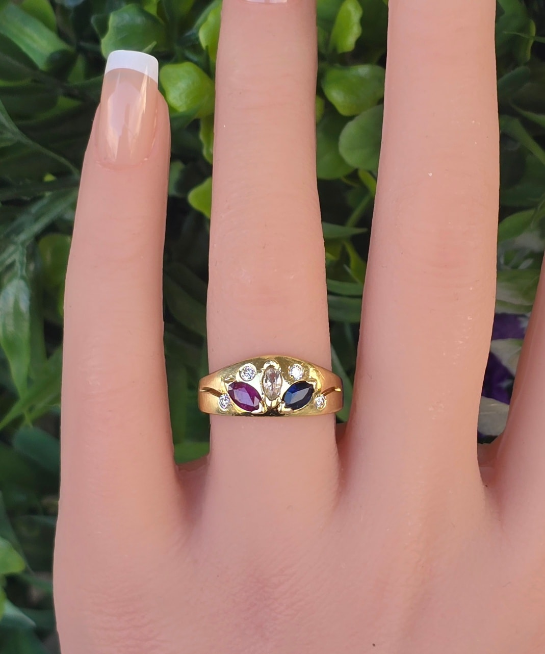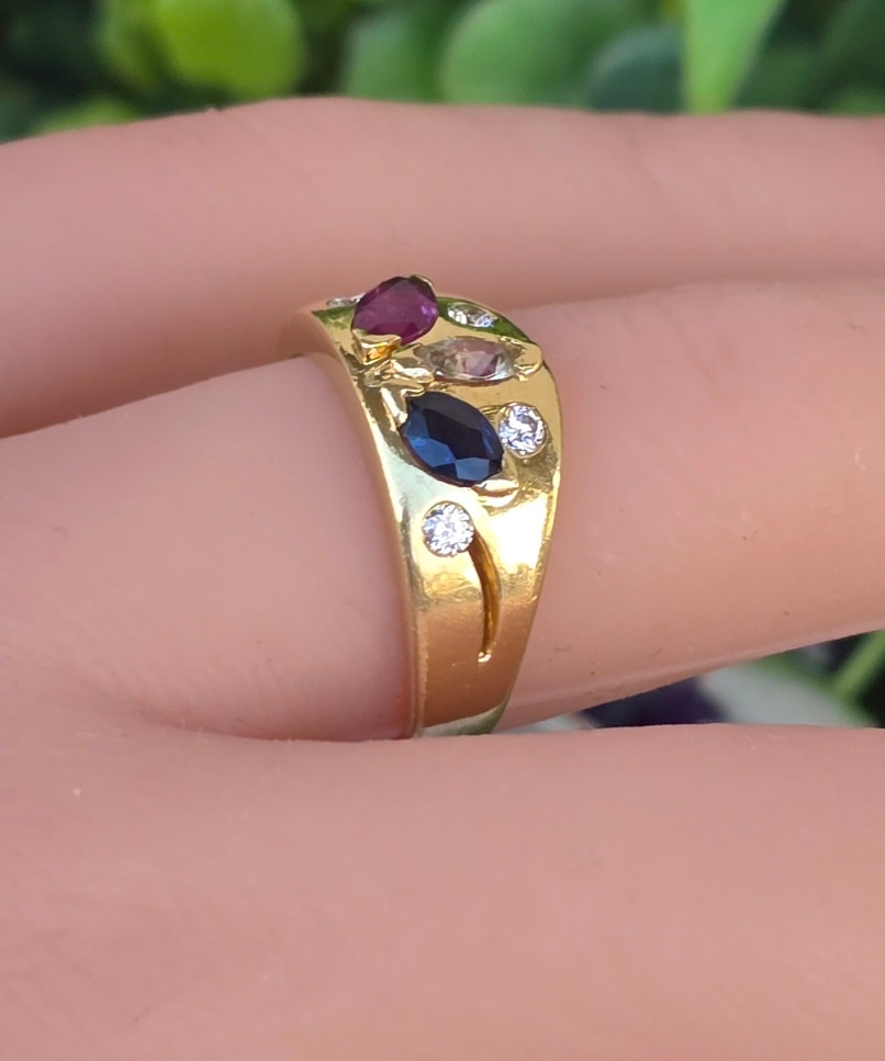 Inel "multigem", din aur de 18K, cu 4 diamante, rubin, safir și cuarț alb naturale.