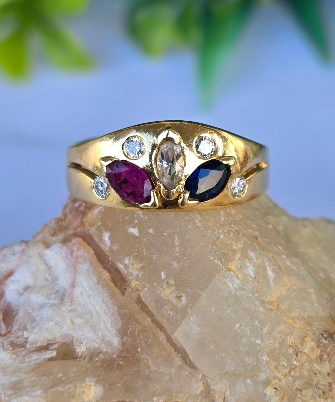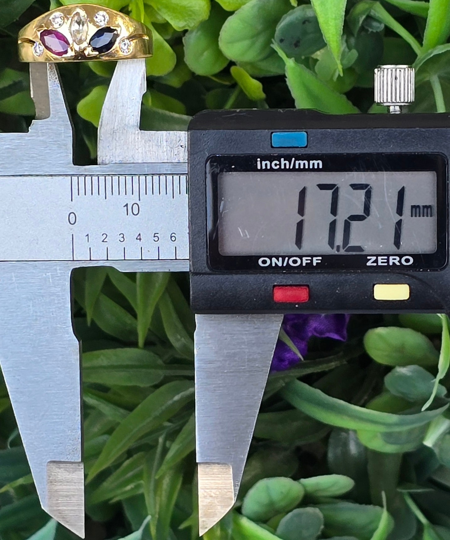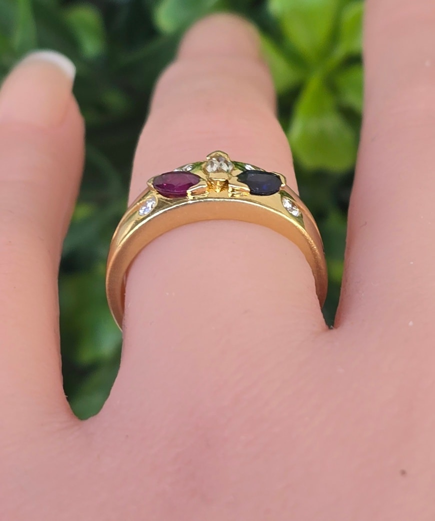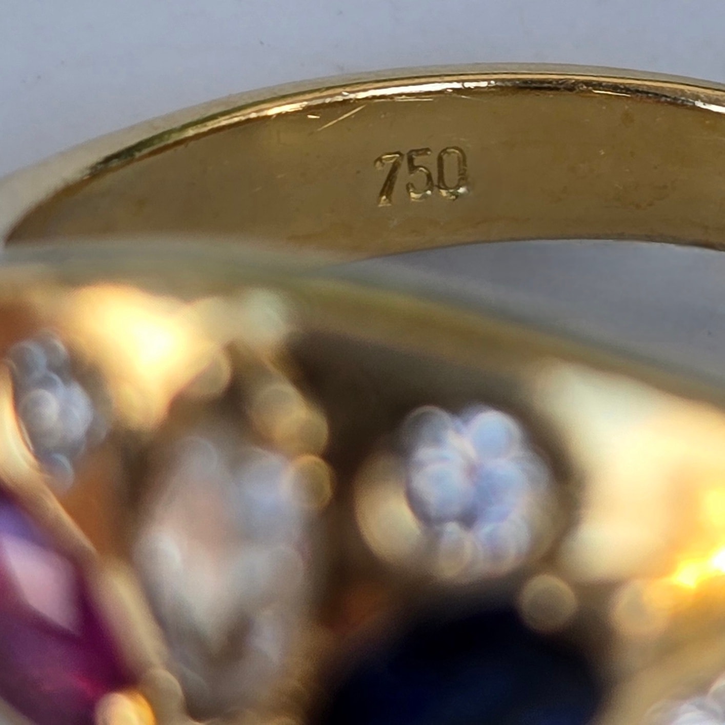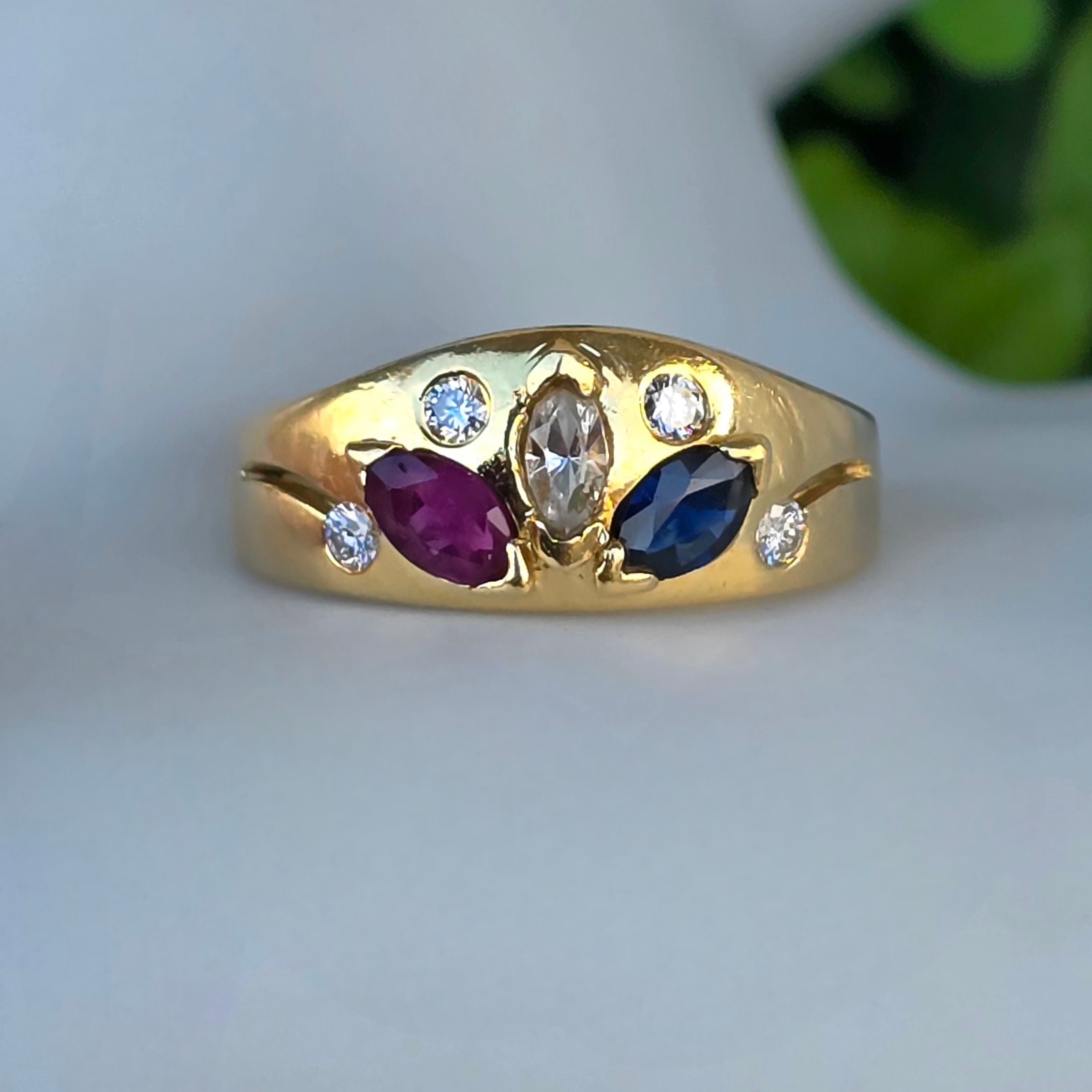 Inel "multigem", din aur de 18K, cu 4 diamante, rubin, safir și cuarț alb naturale.