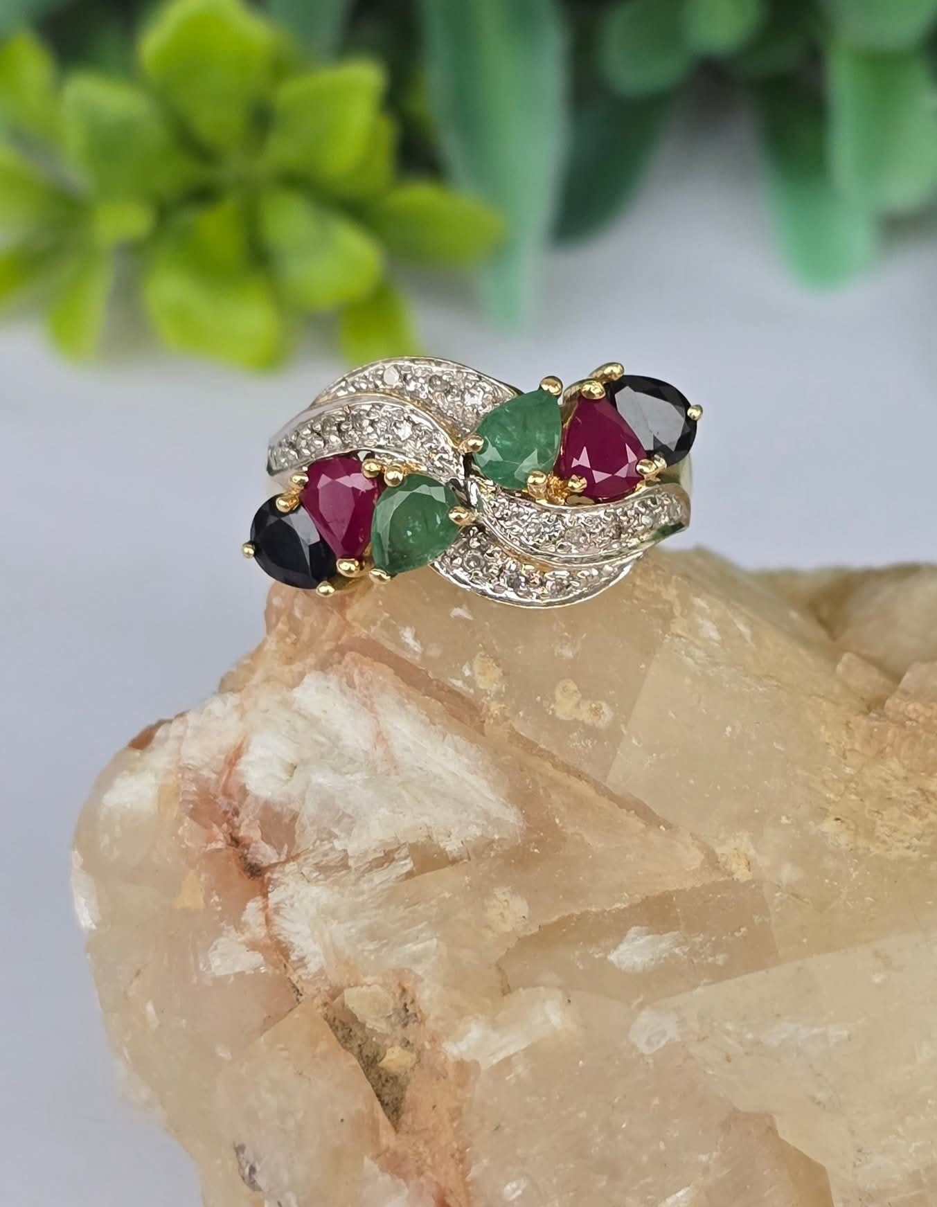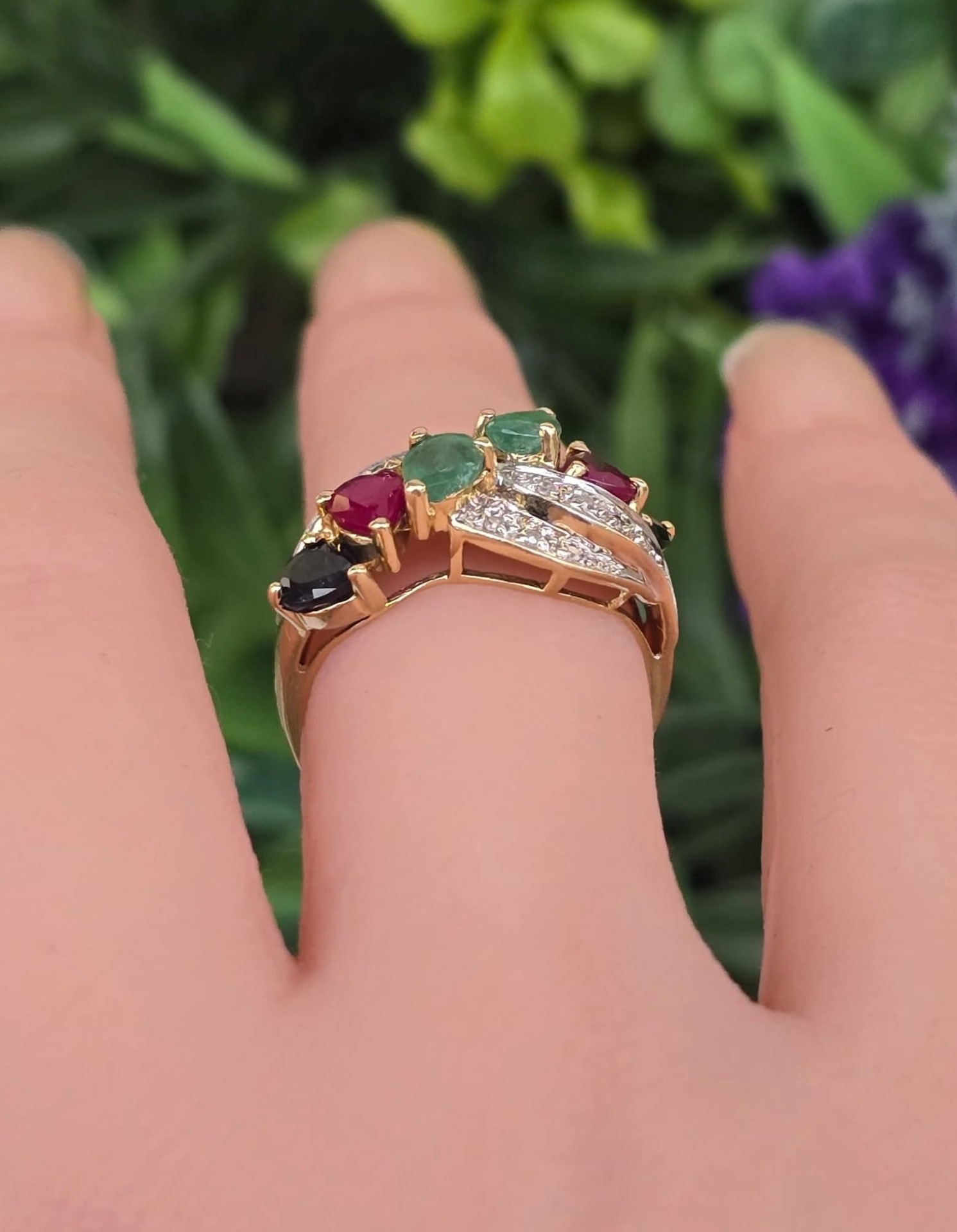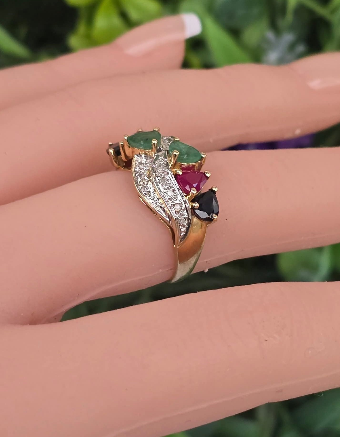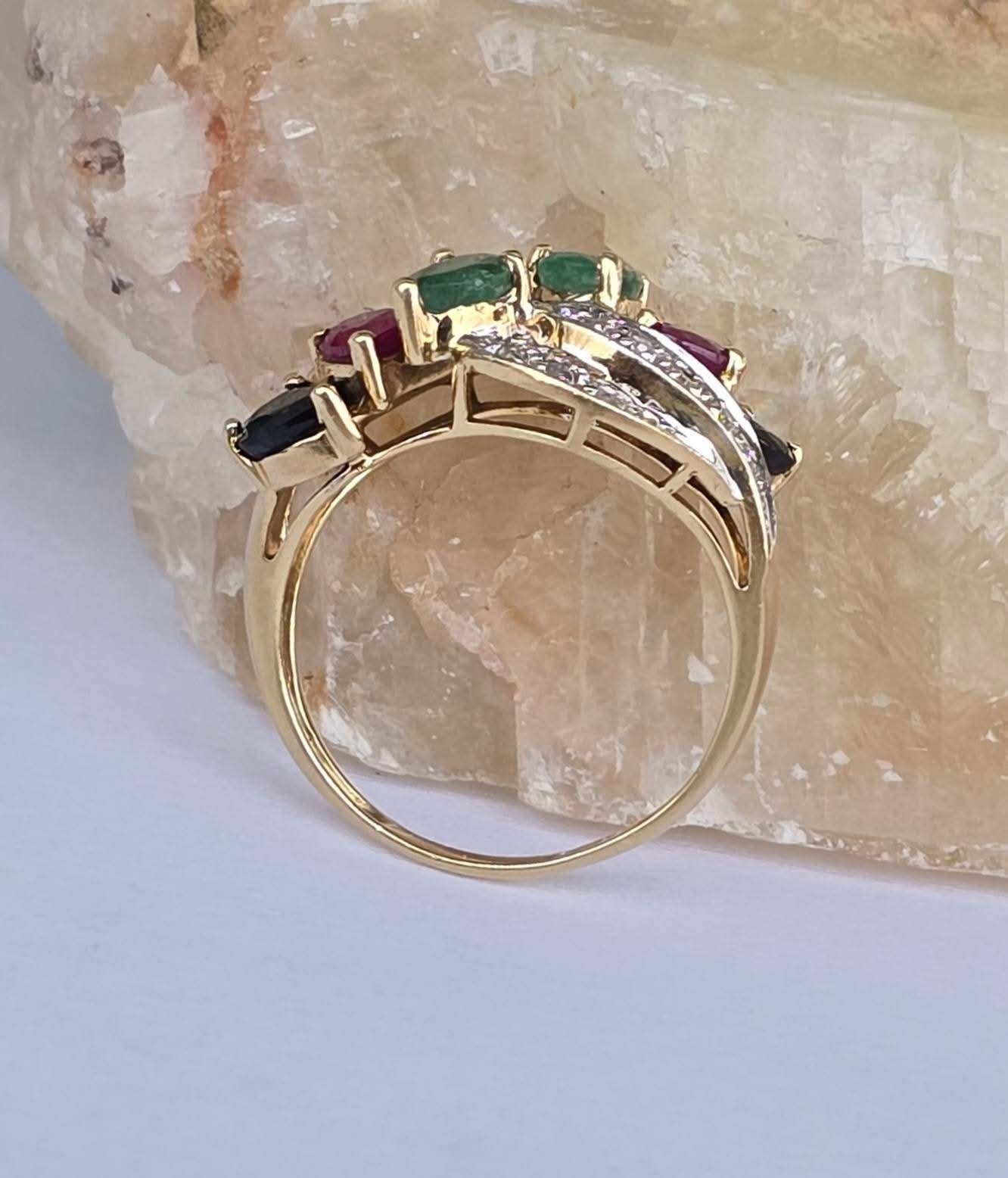 Inel "multigem" vechi spectaculos, din aur de 14K, cu 16 diamante, 2 rubine, 2 safire și 2 smaralde naturale.
