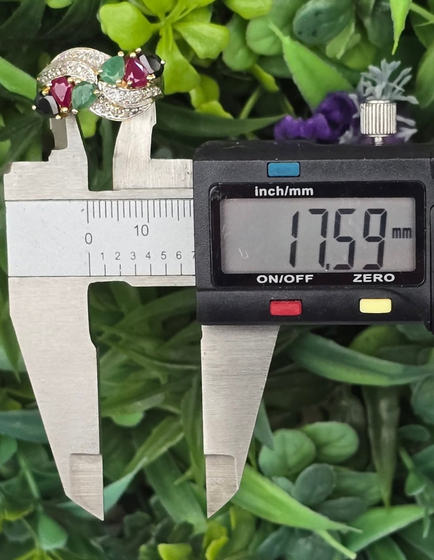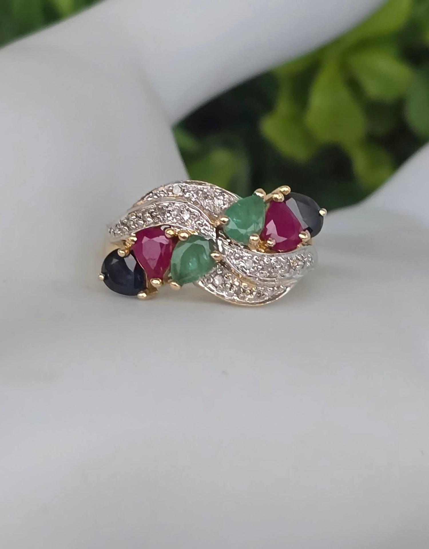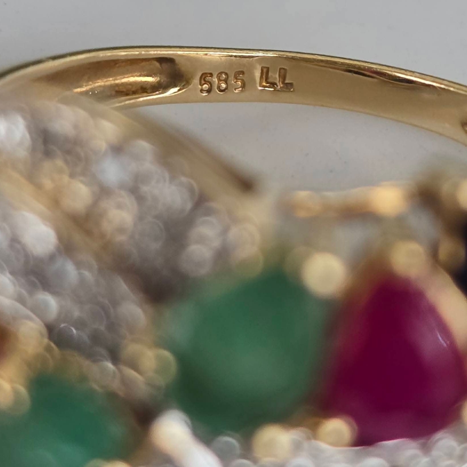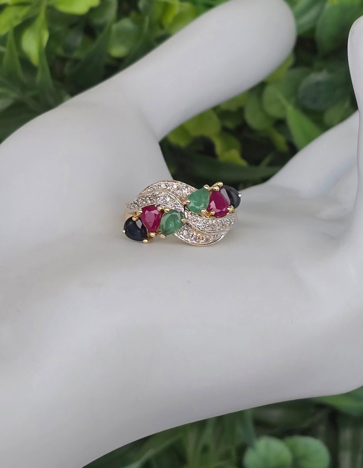 Inel "multigem" vechi spectaculos, din aur de 14K, cu 16 diamante, 2 rubine, 2 safire și 2 smaralde naturale.