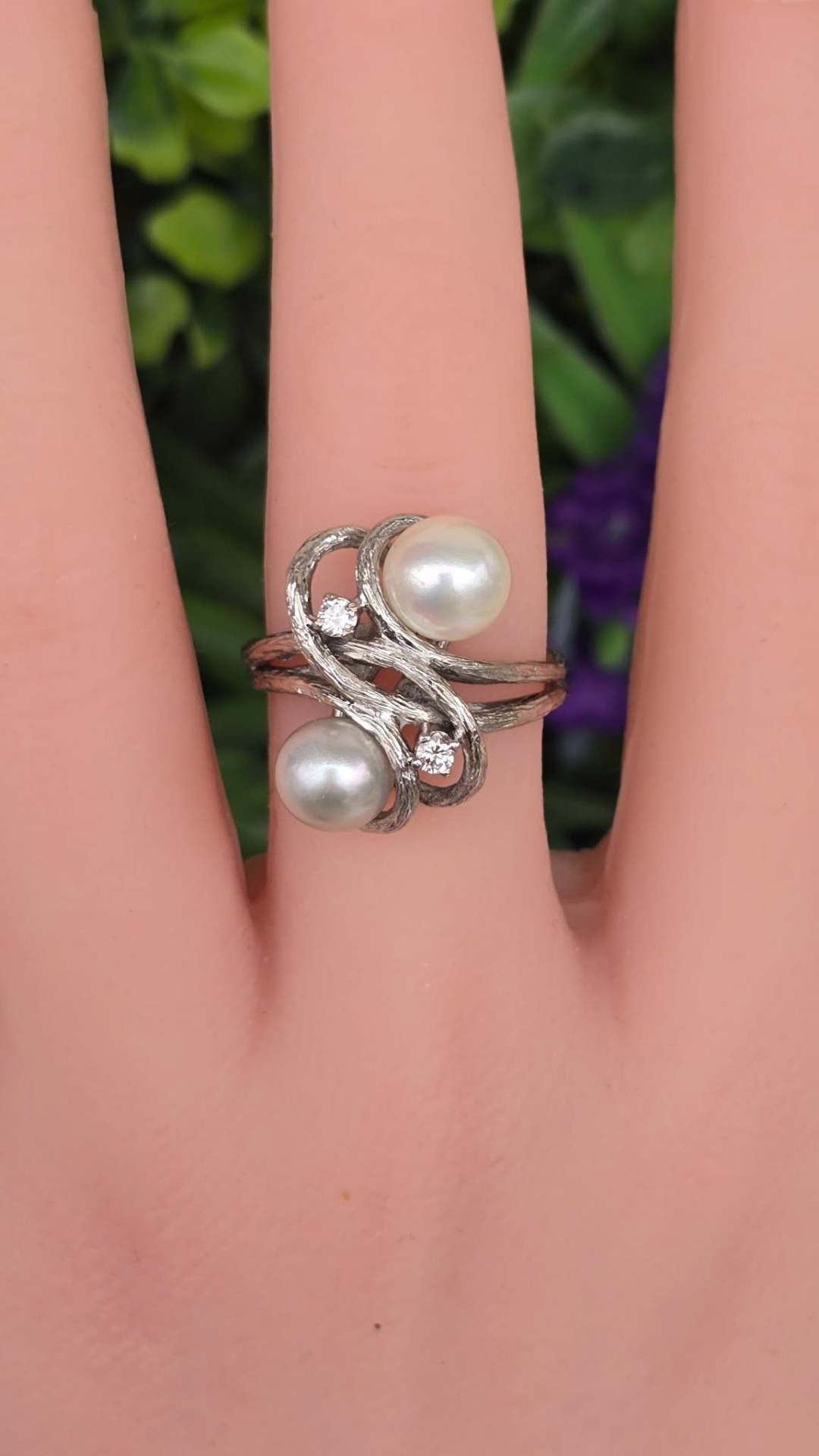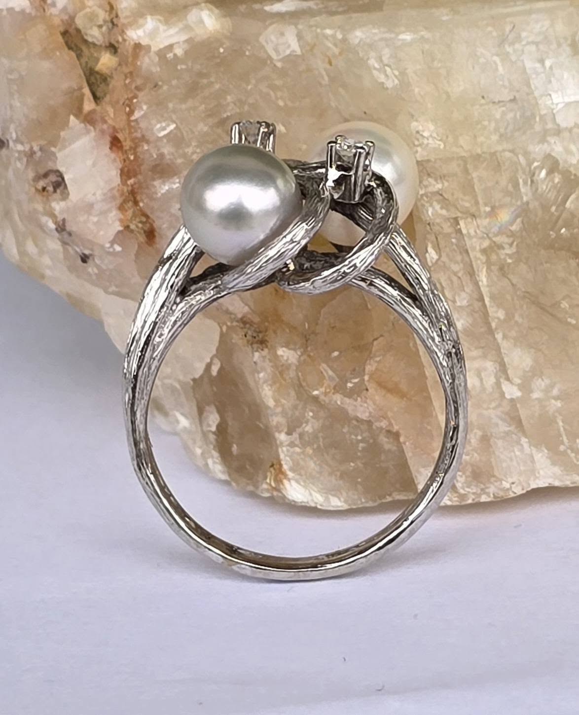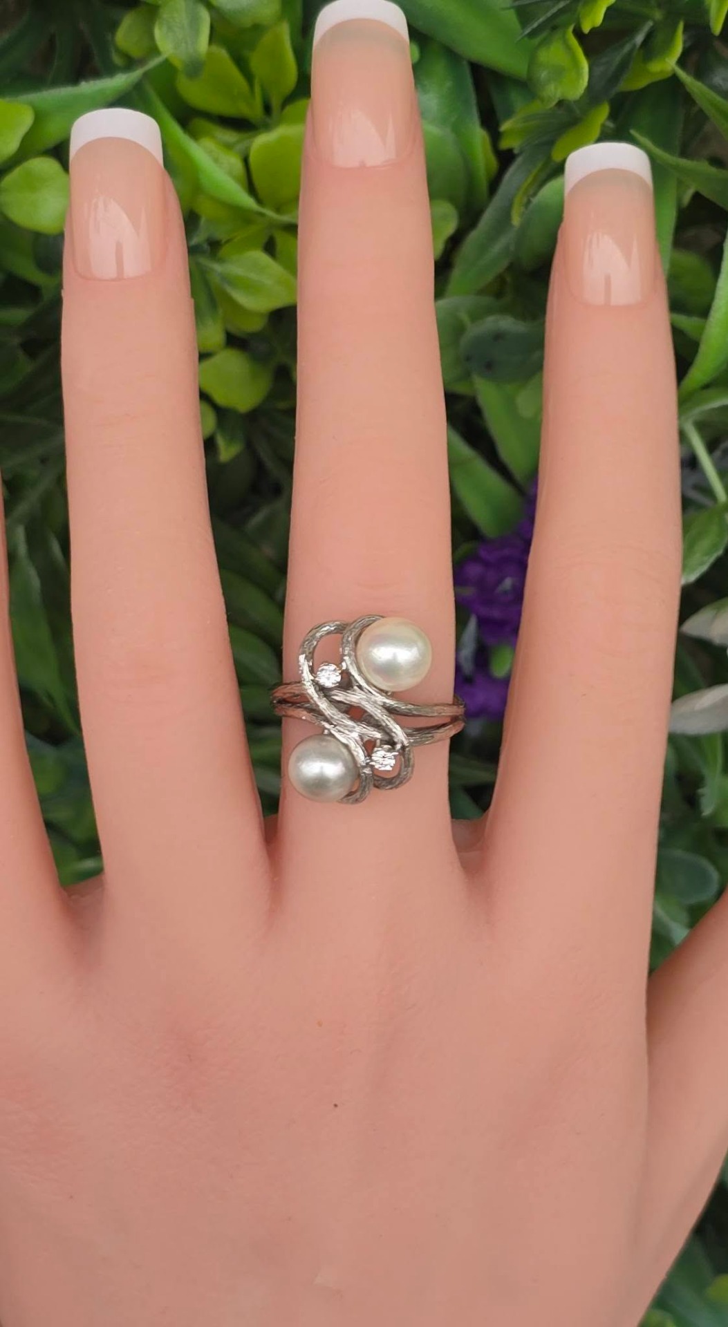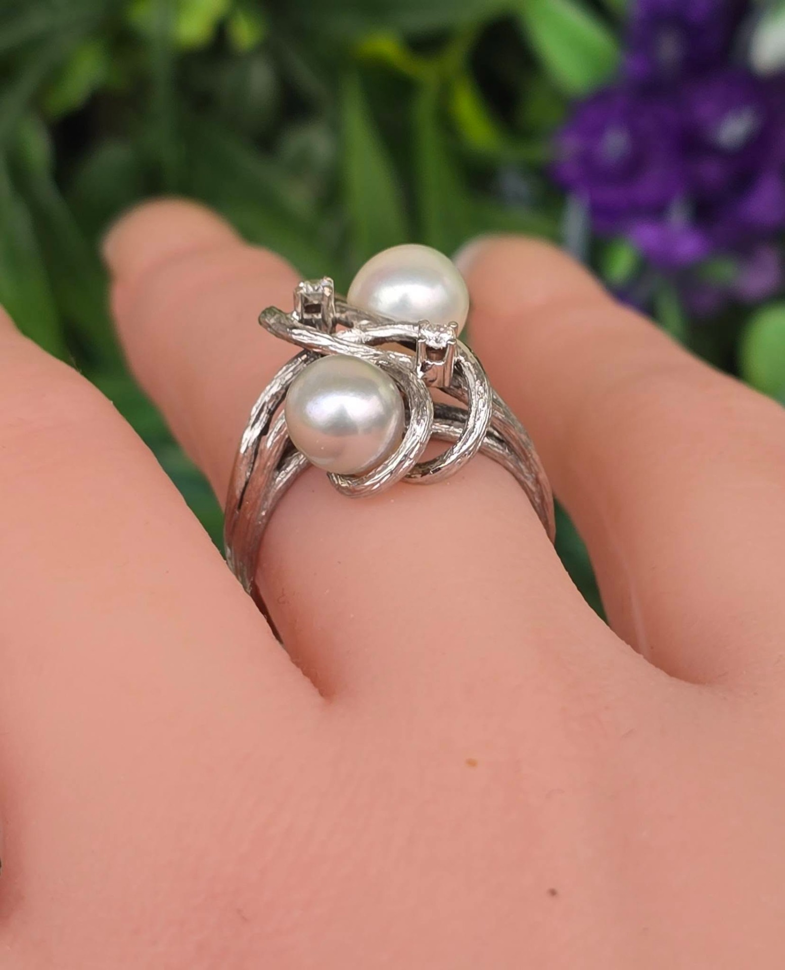 Inel "Toi et Moi" vechi, din aur de 18K, cu perle naturale de cultură și 2 diamante naturale, manufactură cu design texturat care imită scoarța unui copac (anii