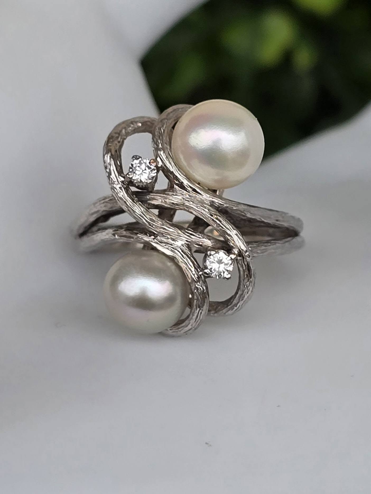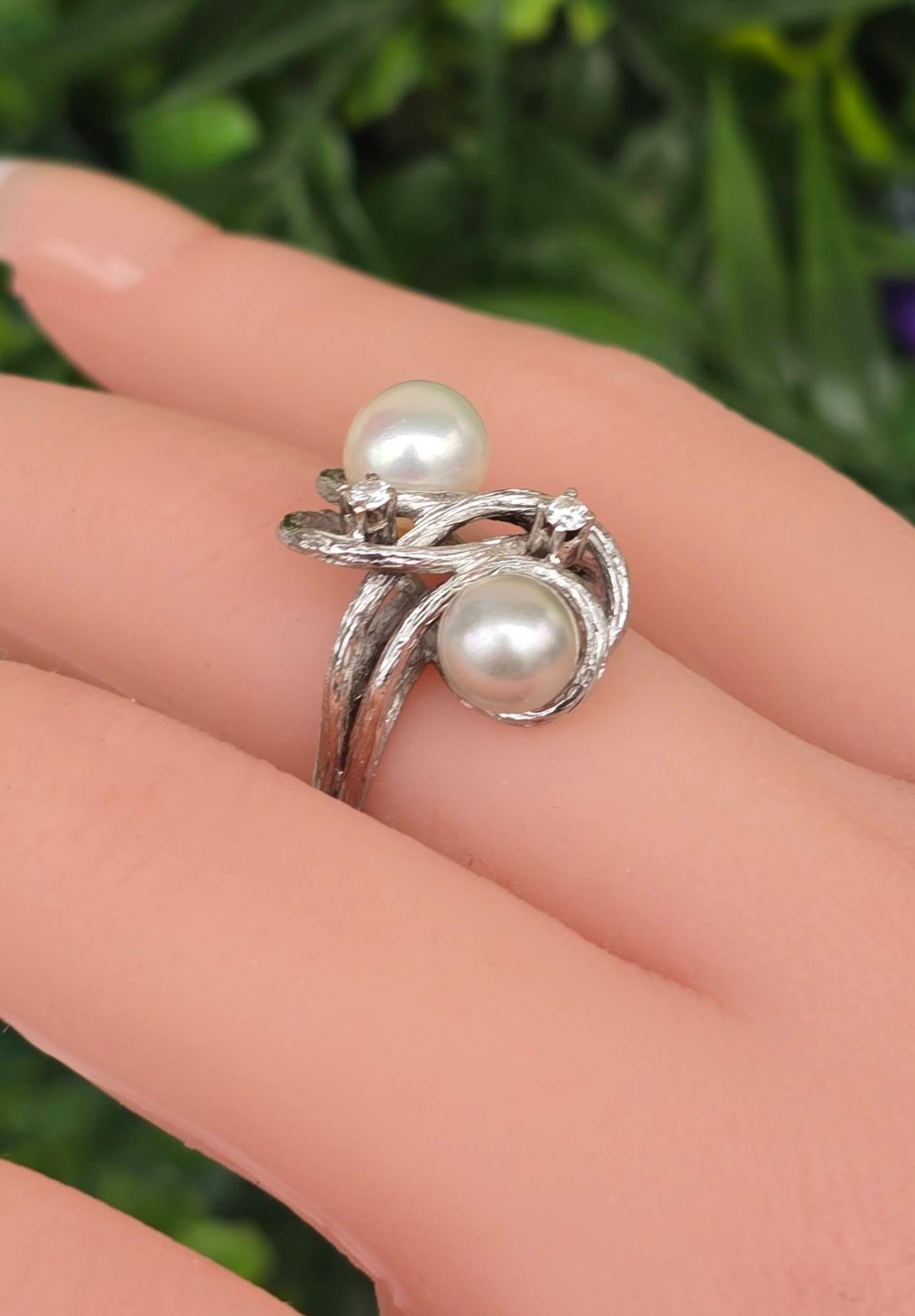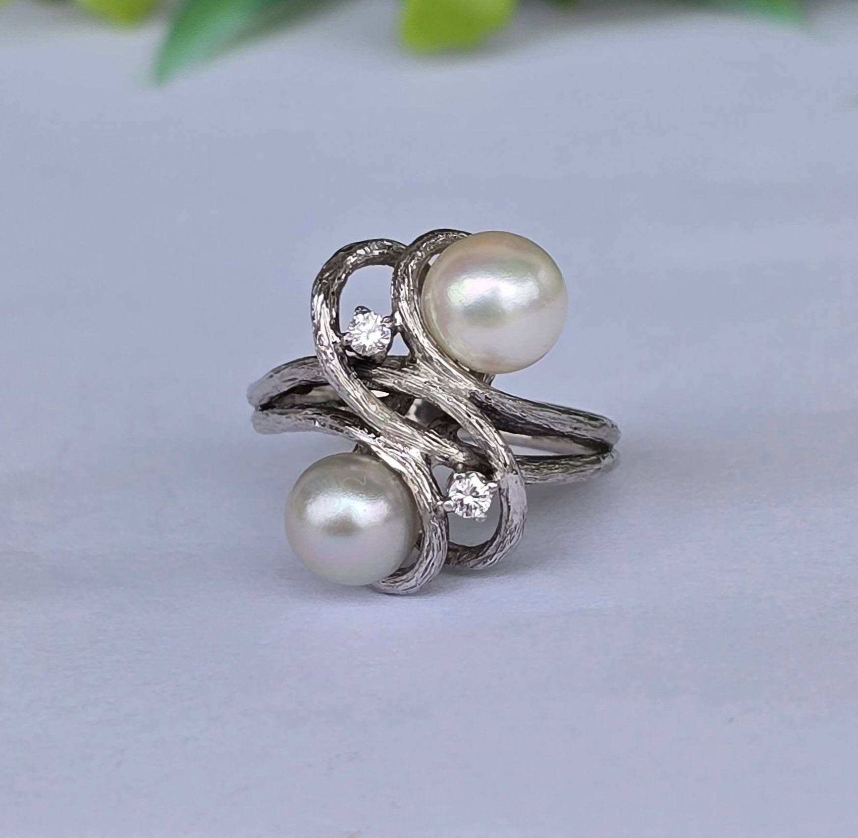 Inel "Toi et Moi" vechi, din aur de 18K, cu perle naturale de cultură și 2 diamante naturale, manufactură cu design texturat care imită scoarța unui copac (anii
