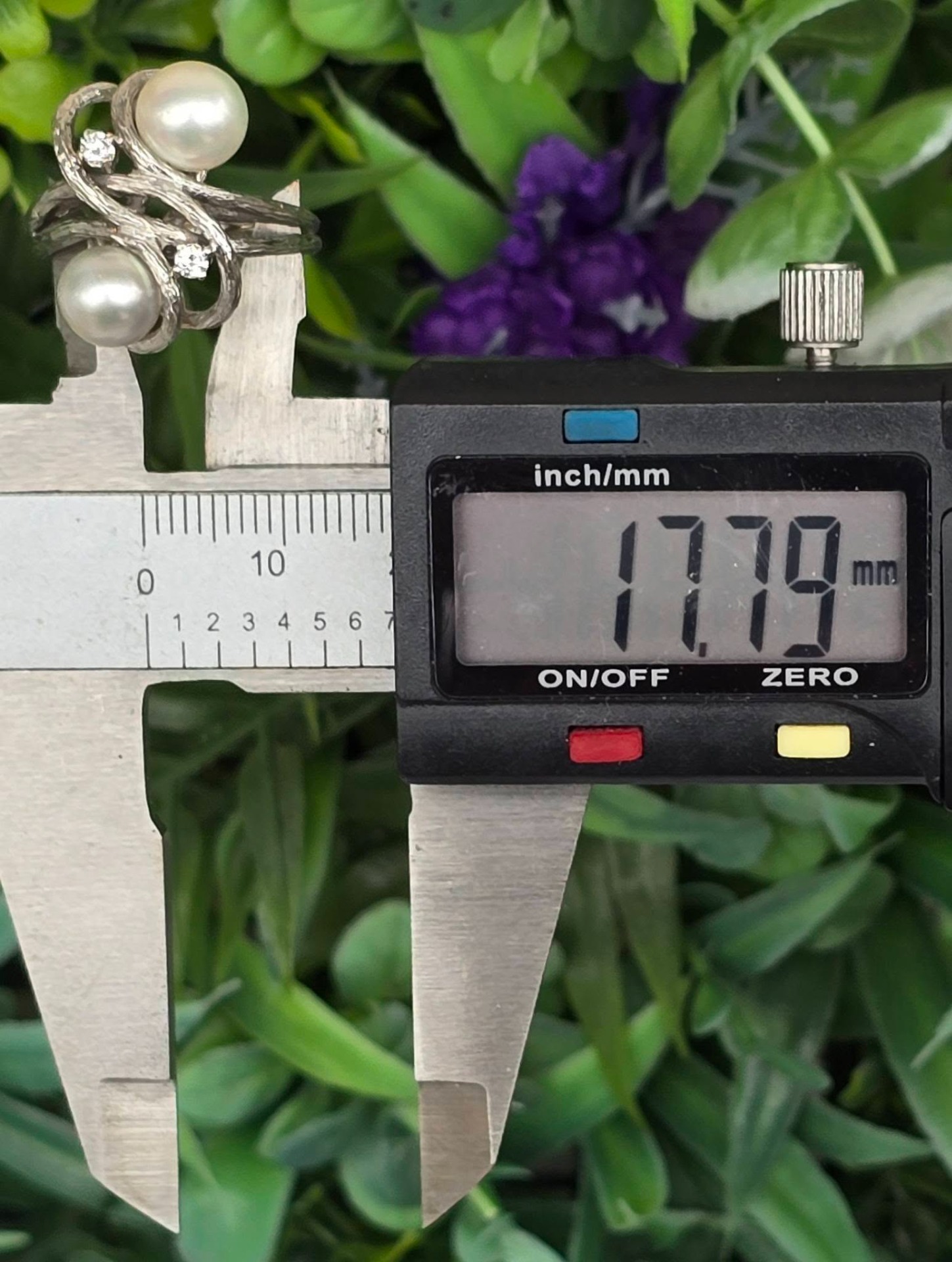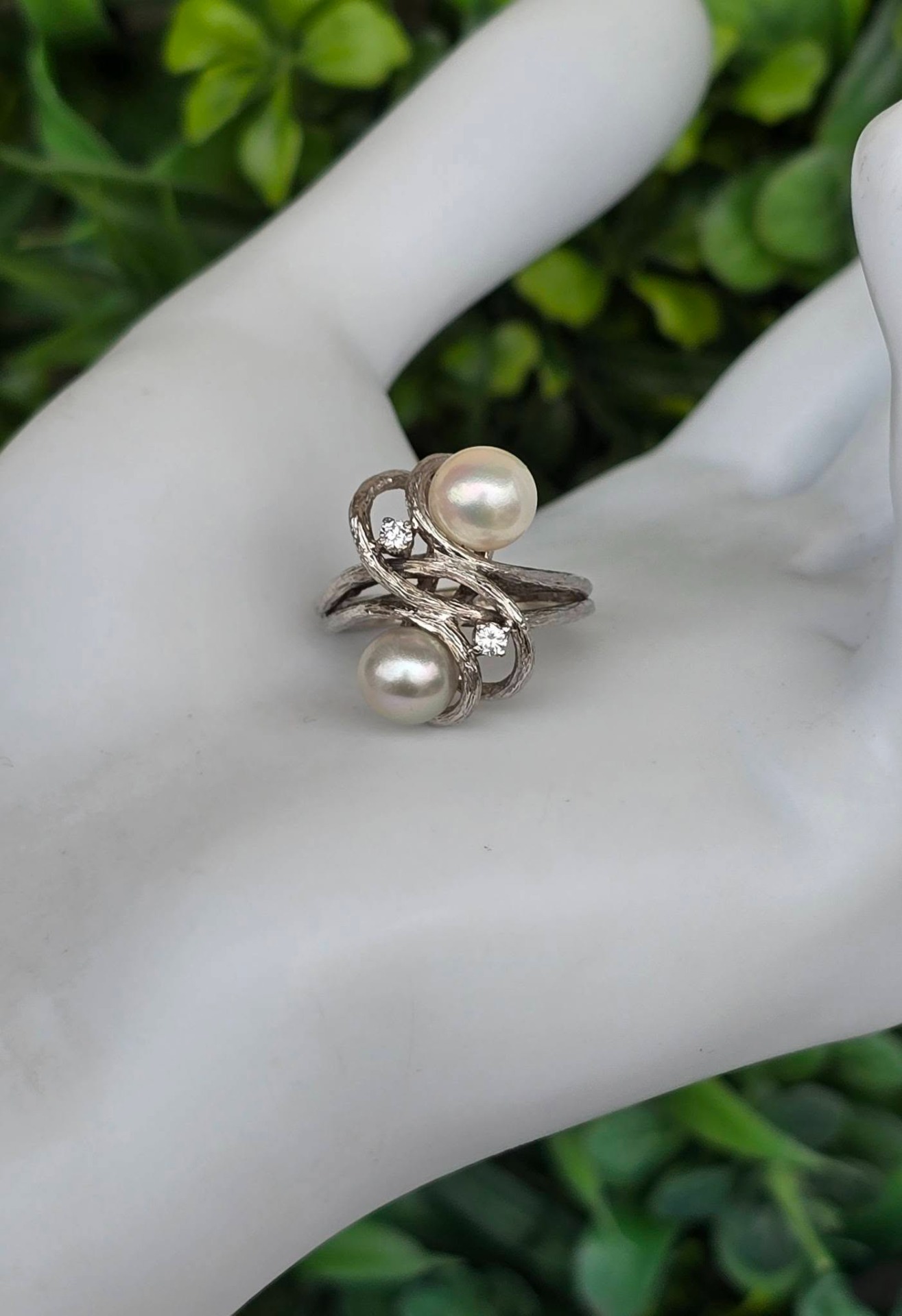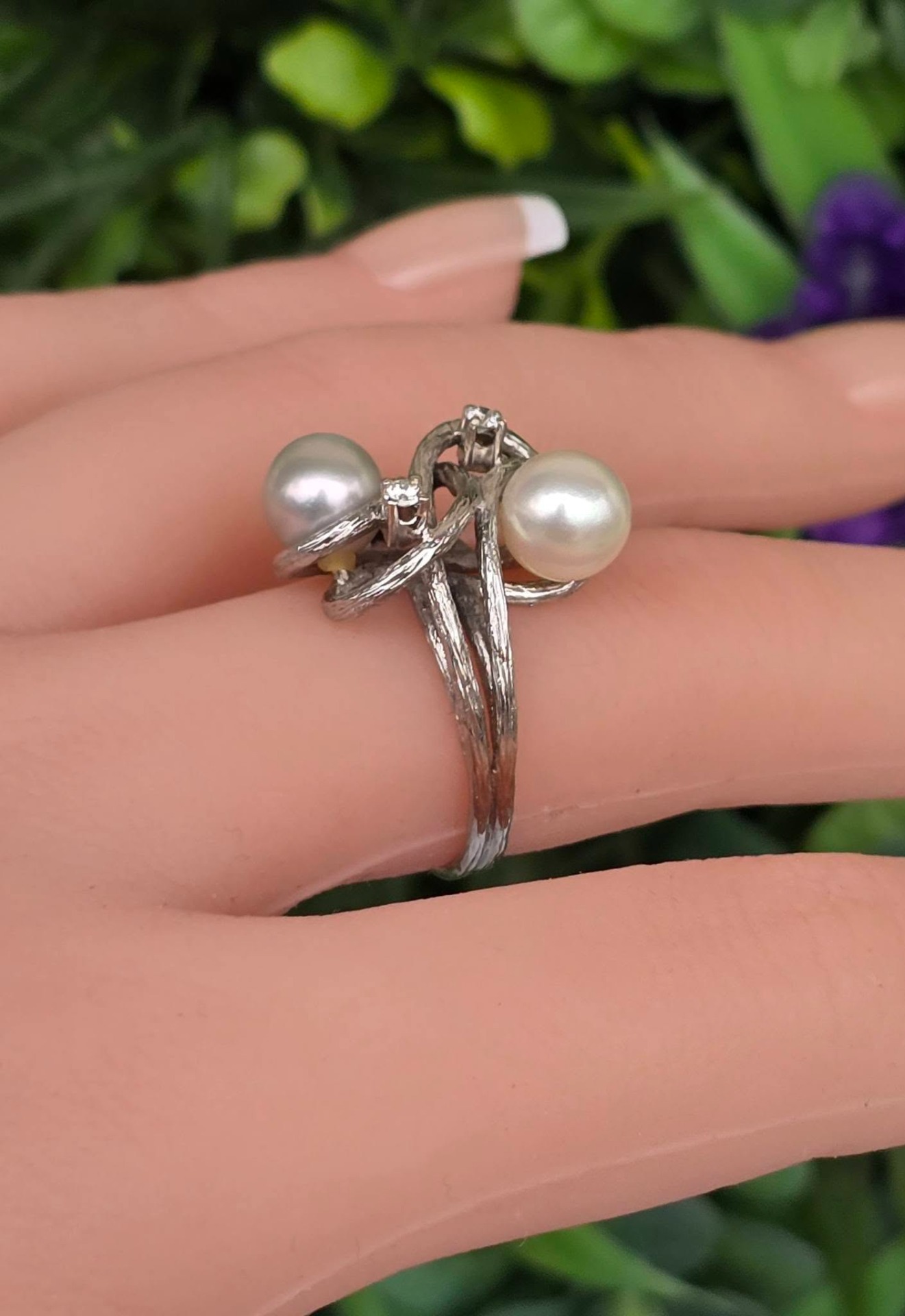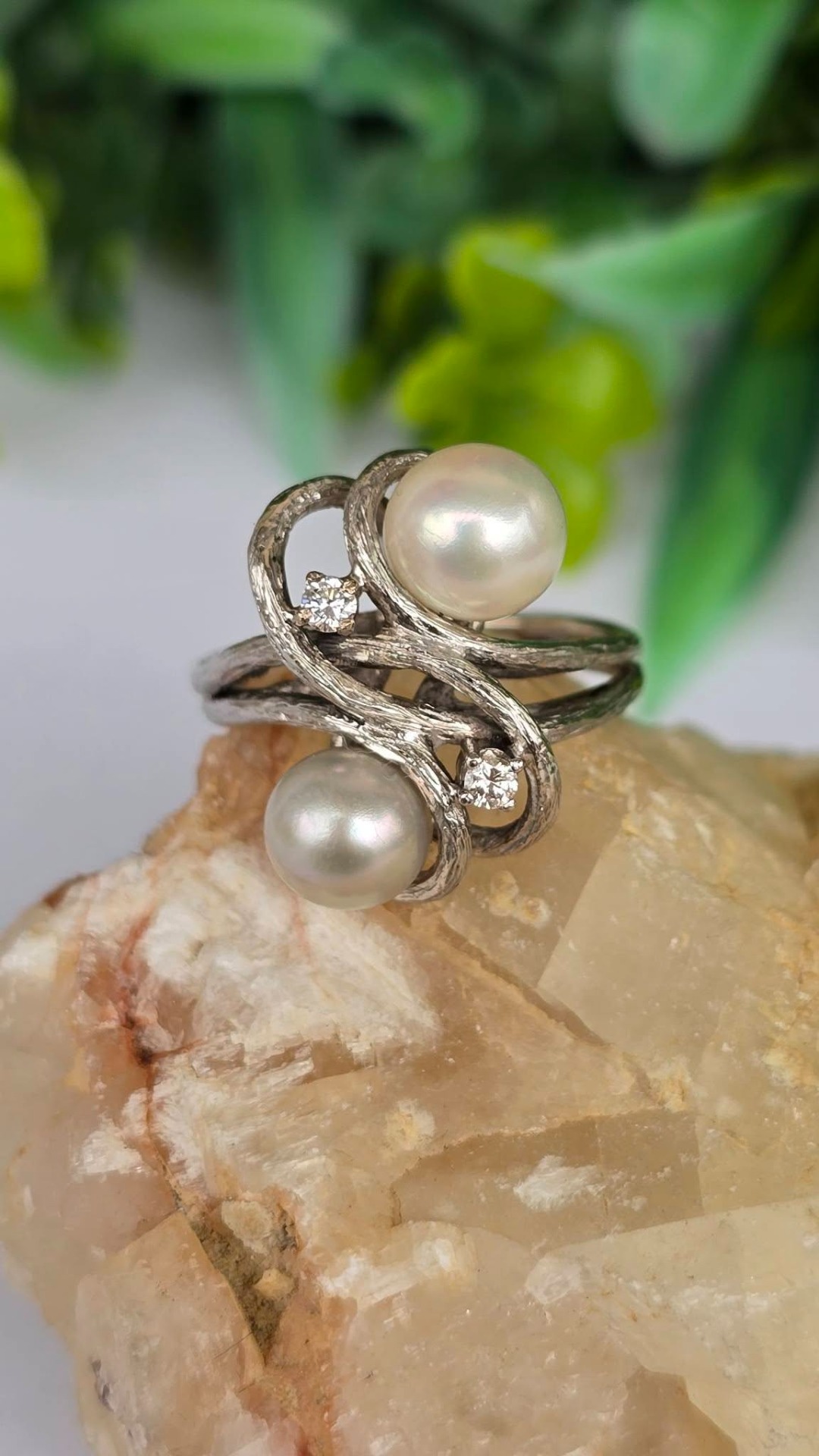 Inel "Toi et Moi" vechi, din aur de 18K, cu perle naturale de cultură și 2 diamante naturale, manufactură cu design texturat care imită scoarța unui copac (anii