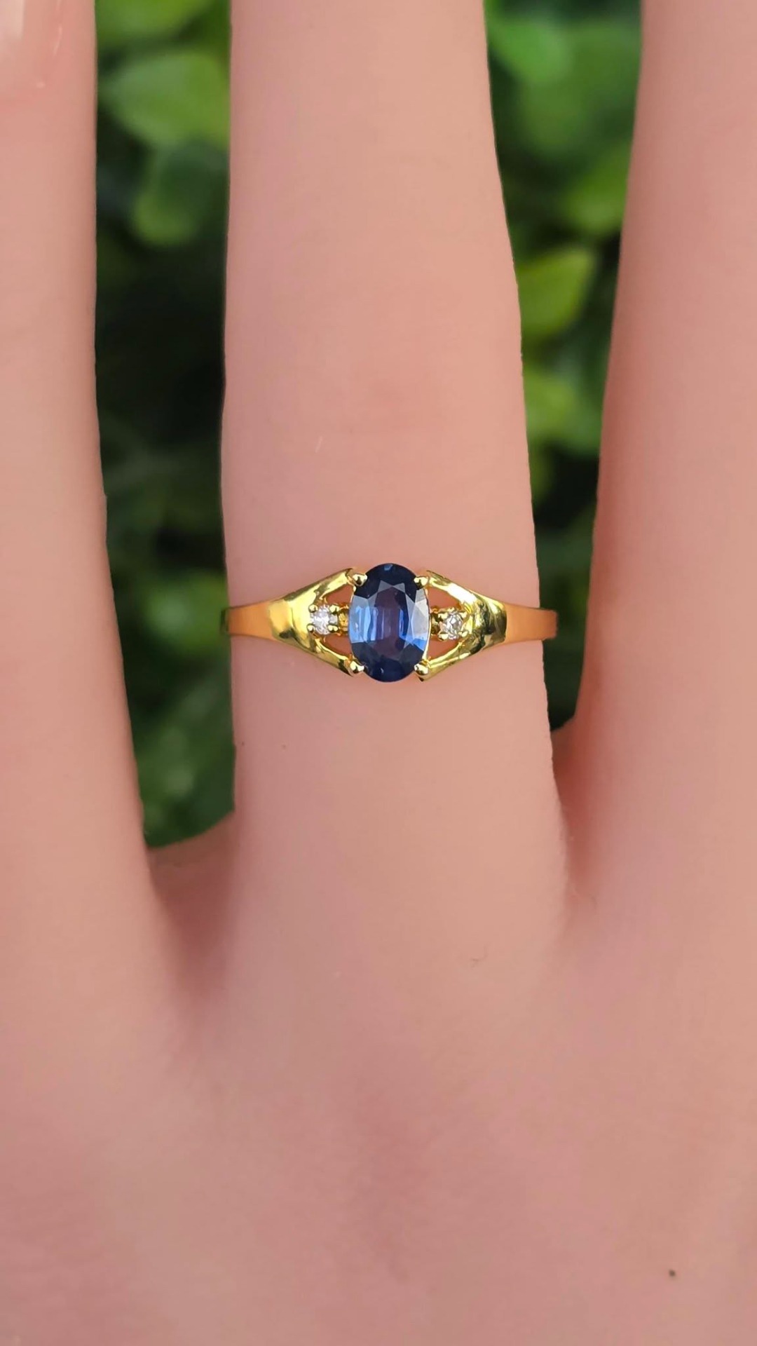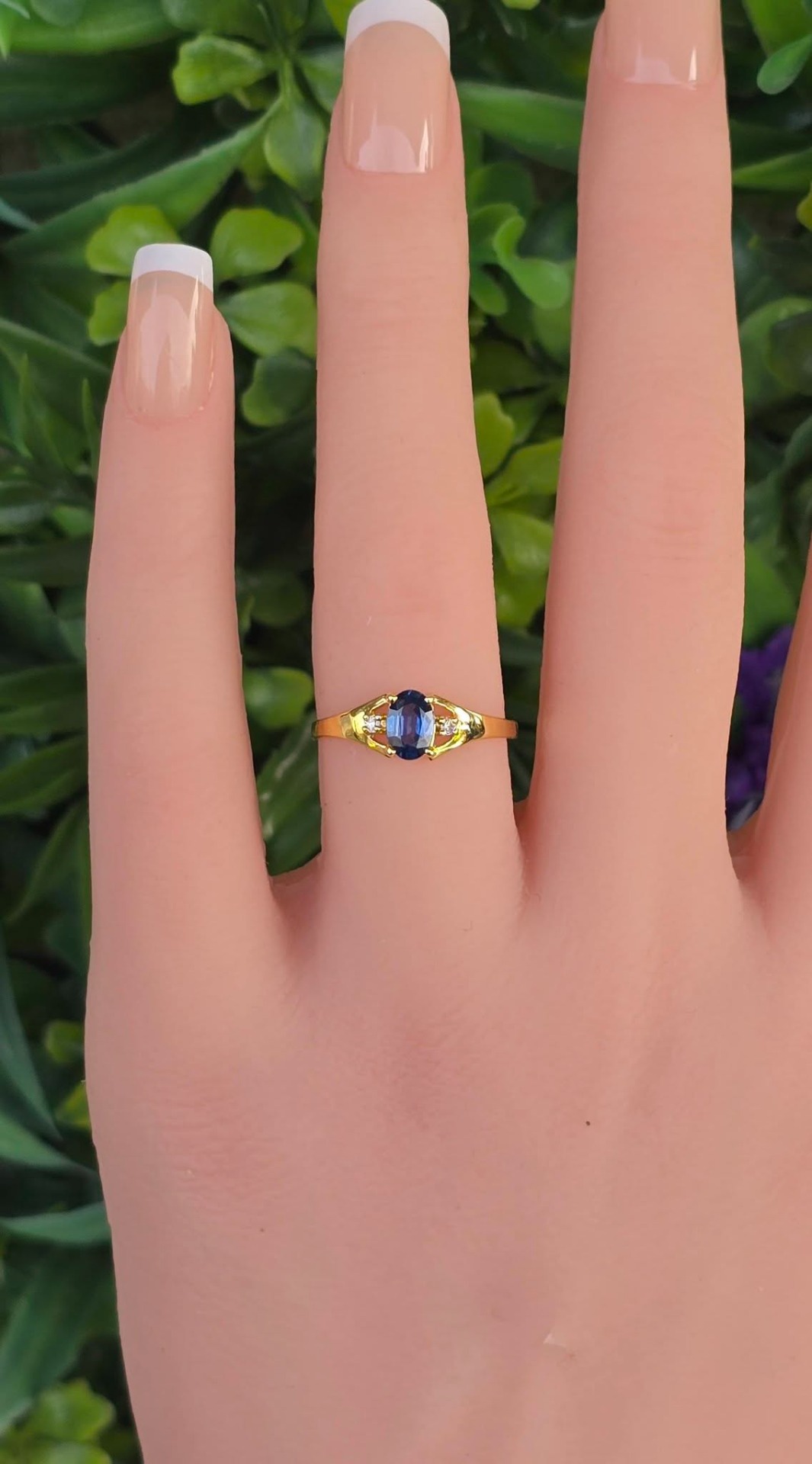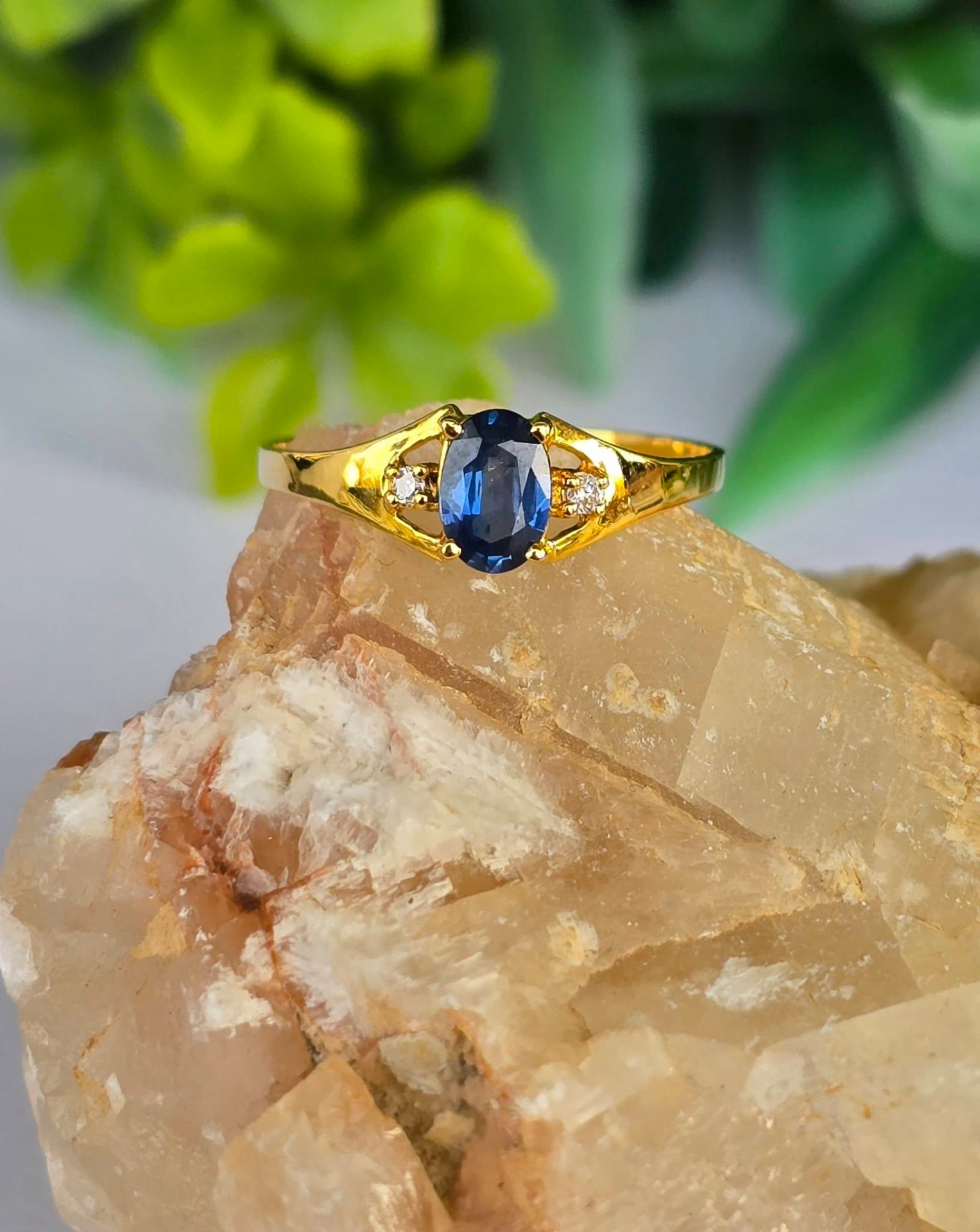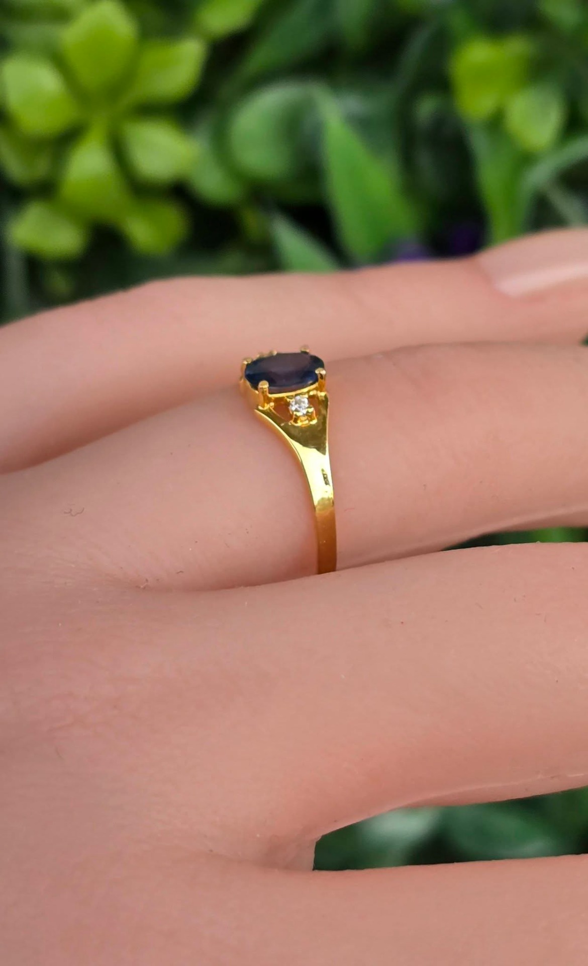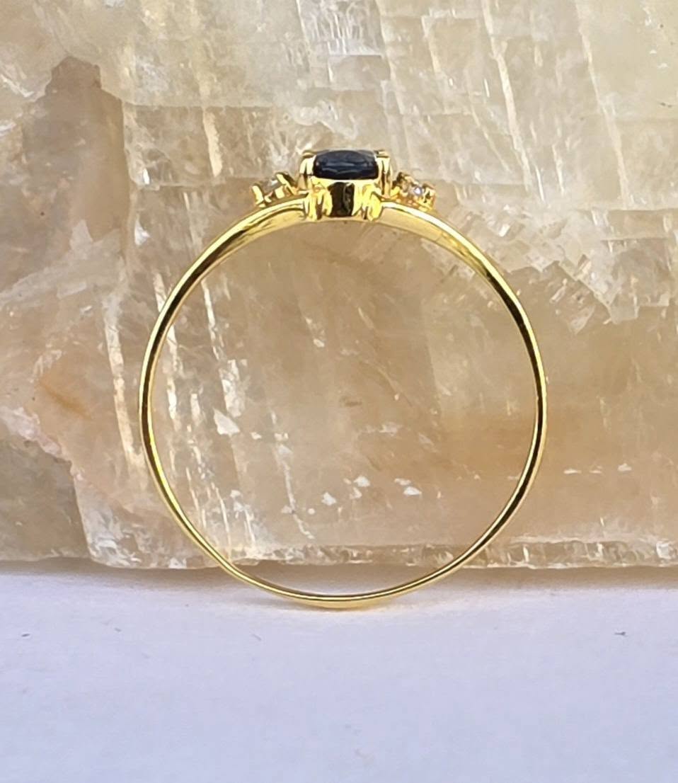 Inel "trio" superb, din aur de 10K, cu safir și 2 diamante naturale.
