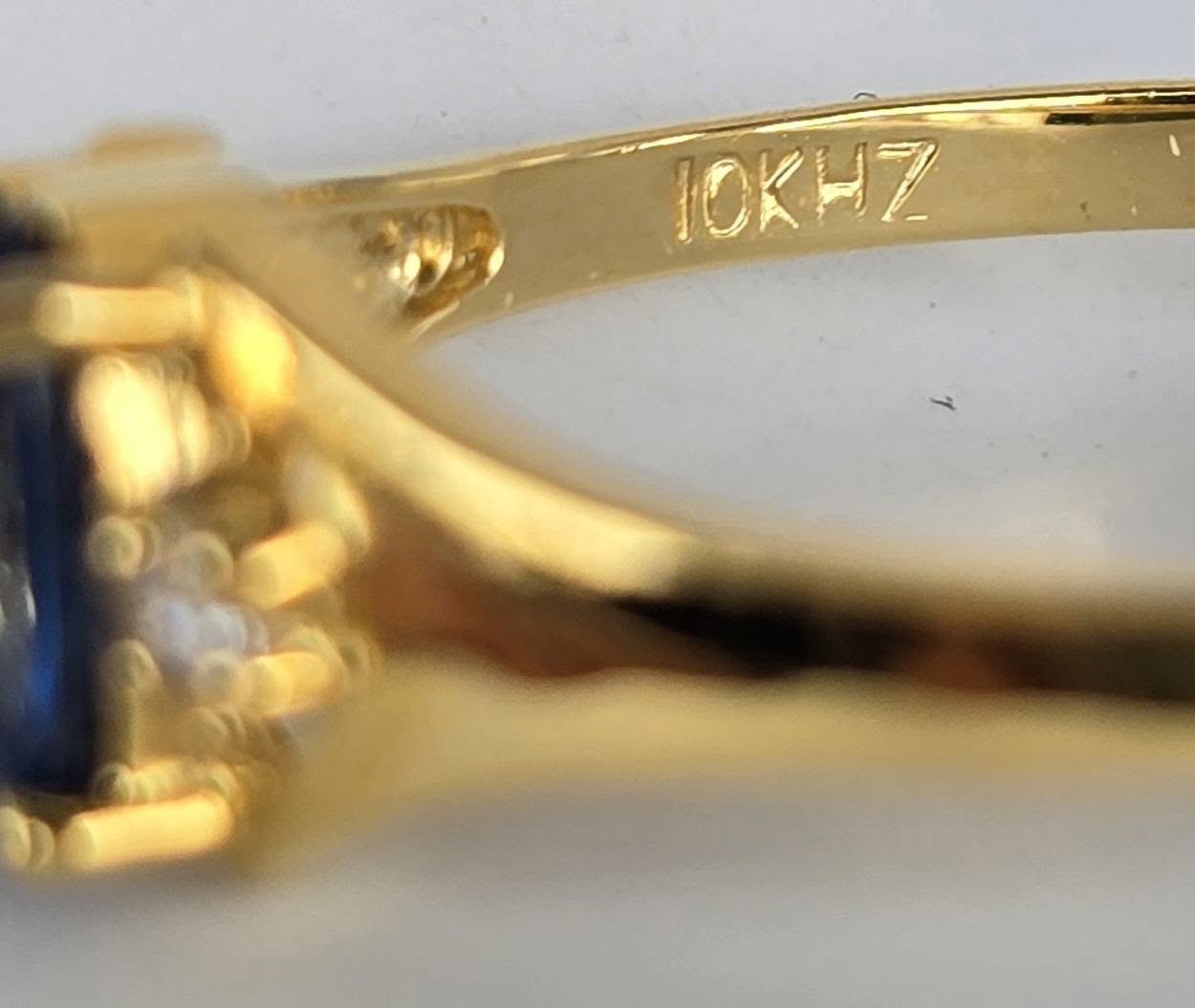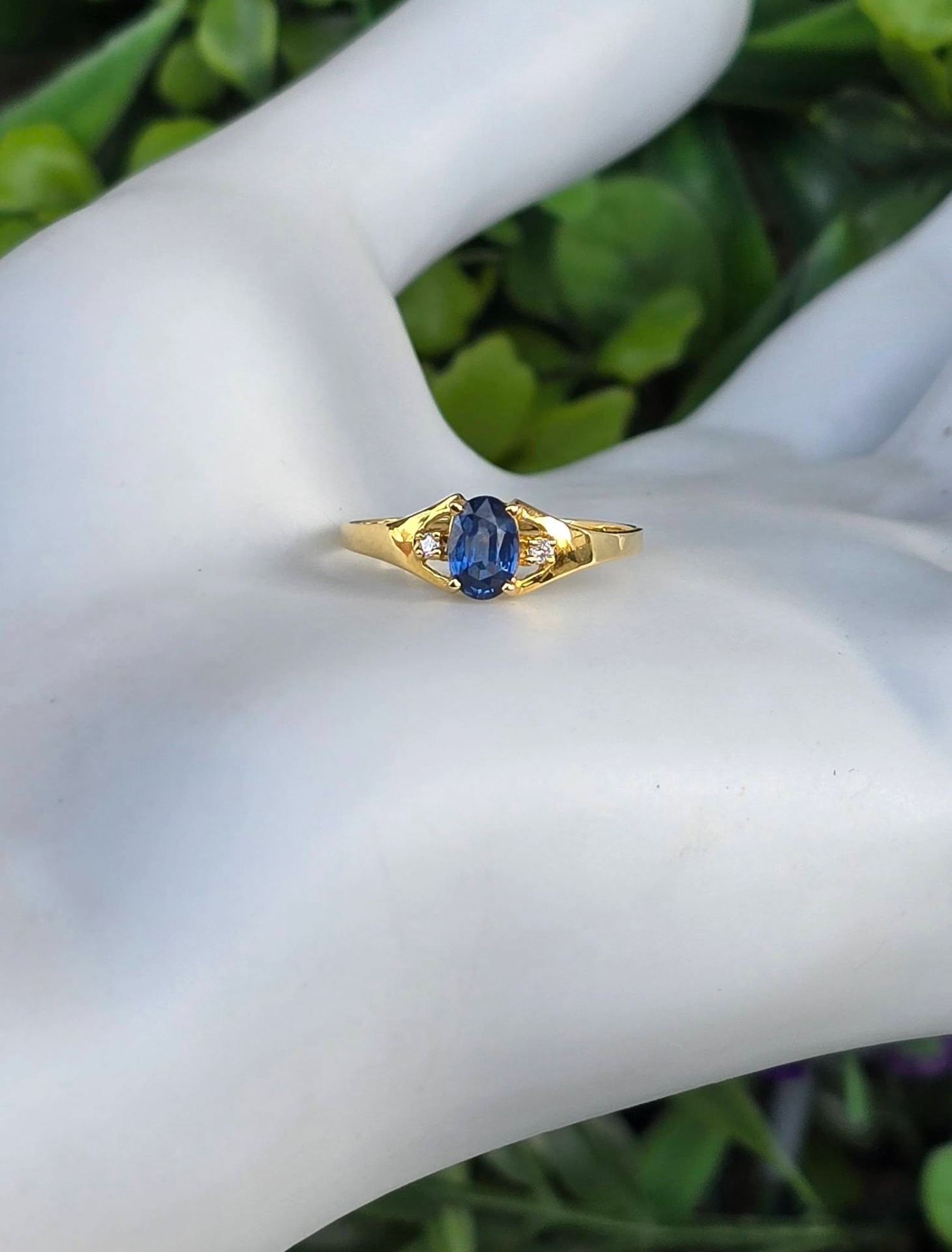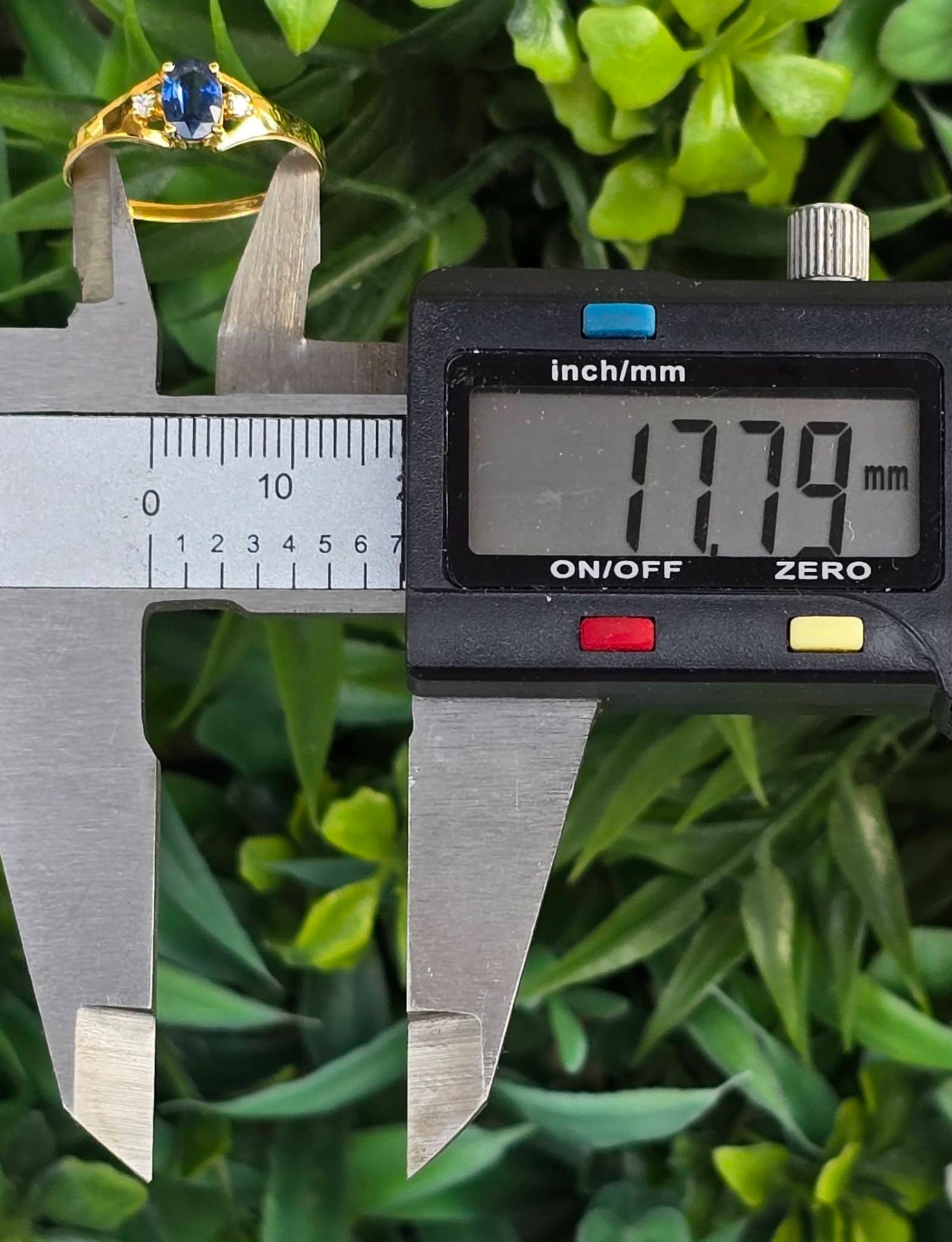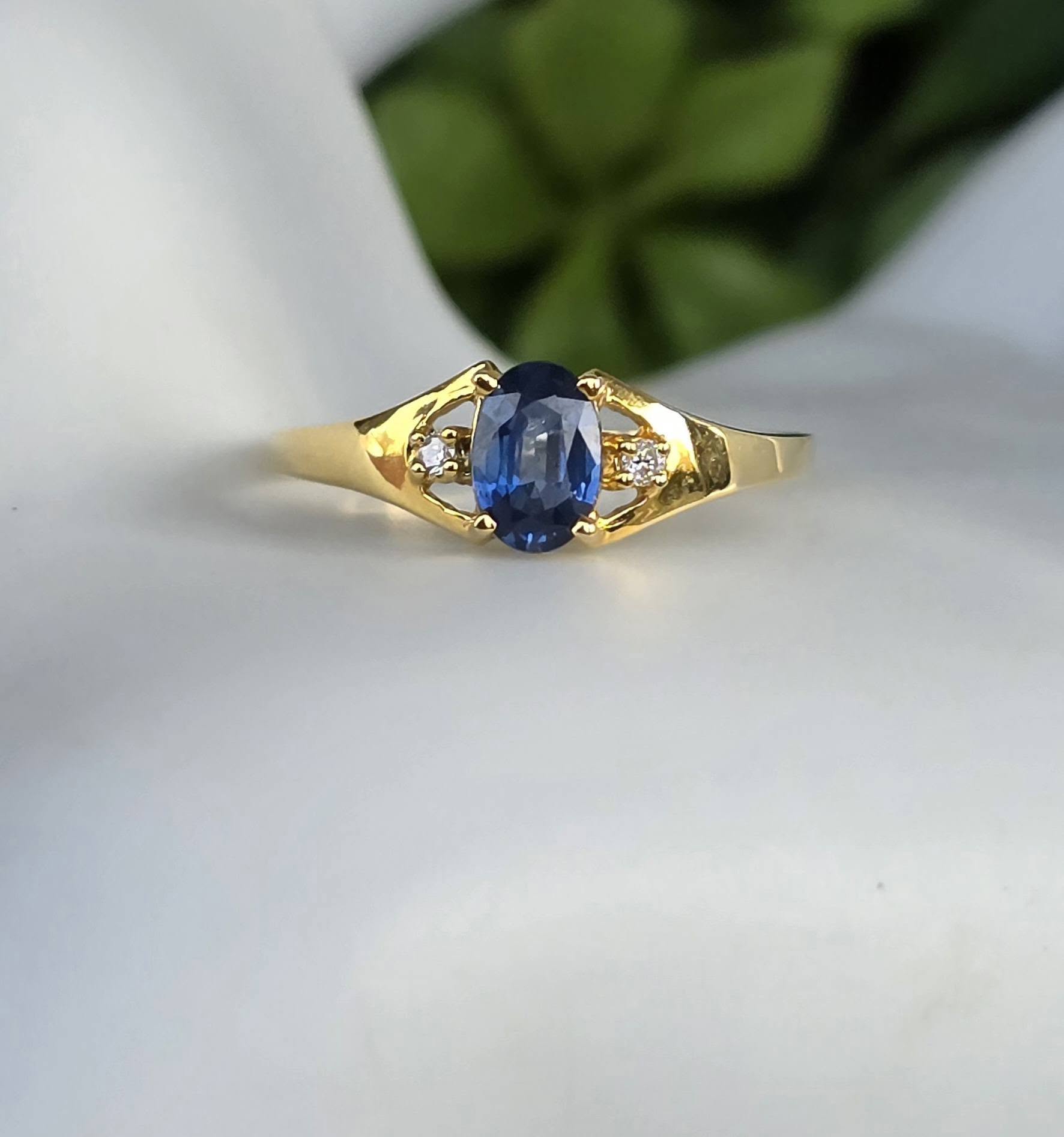 Inel "trio" superb, din aur de 10K, cu safir și 2 diamante naturale.