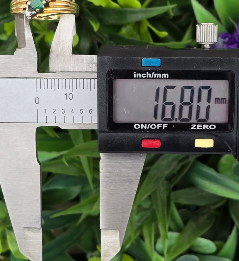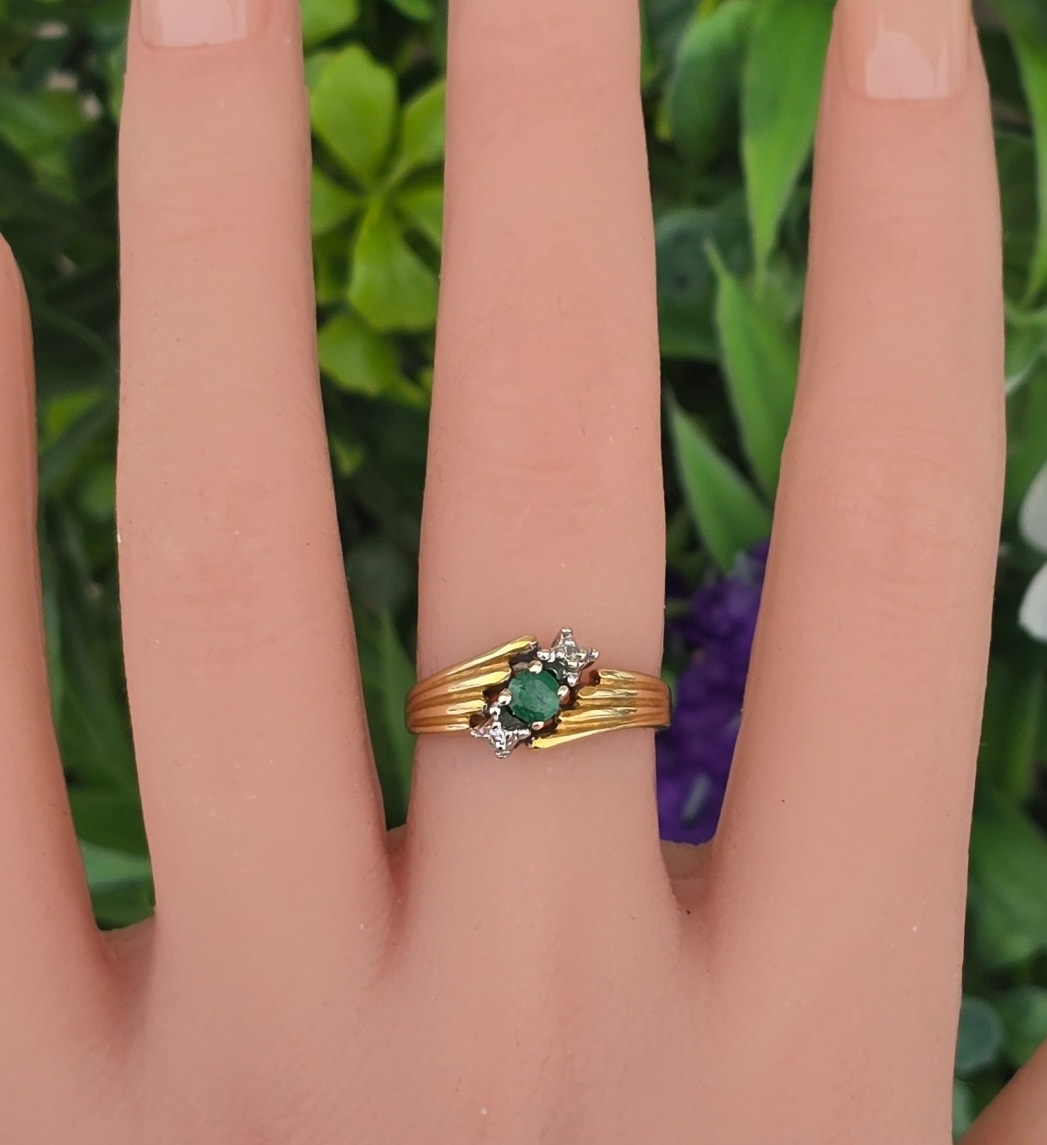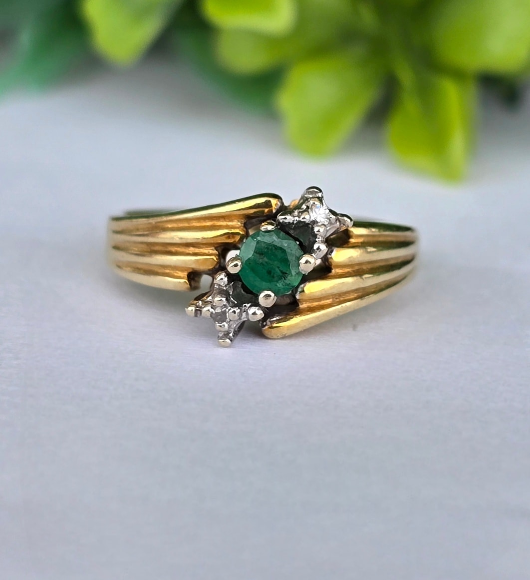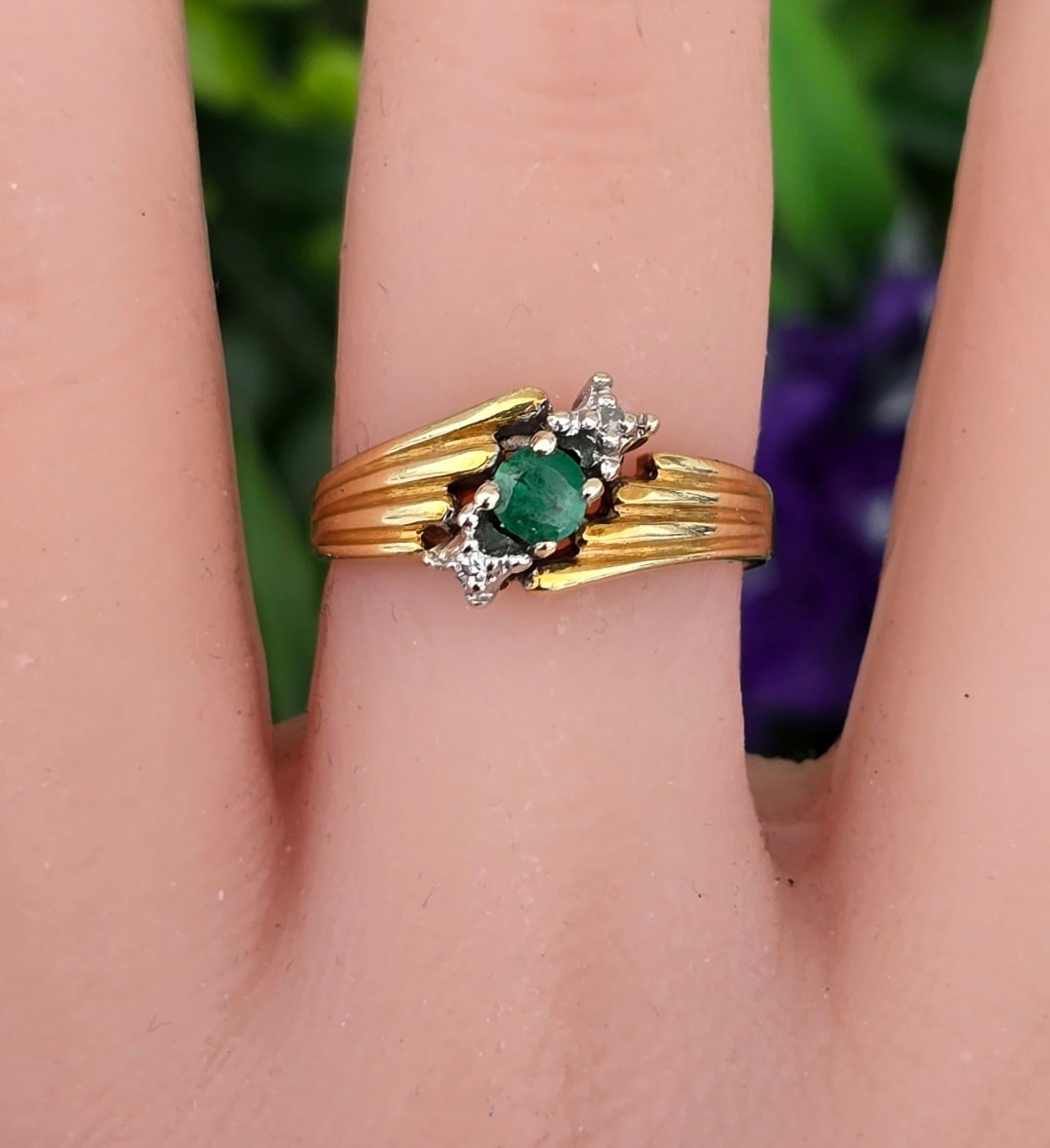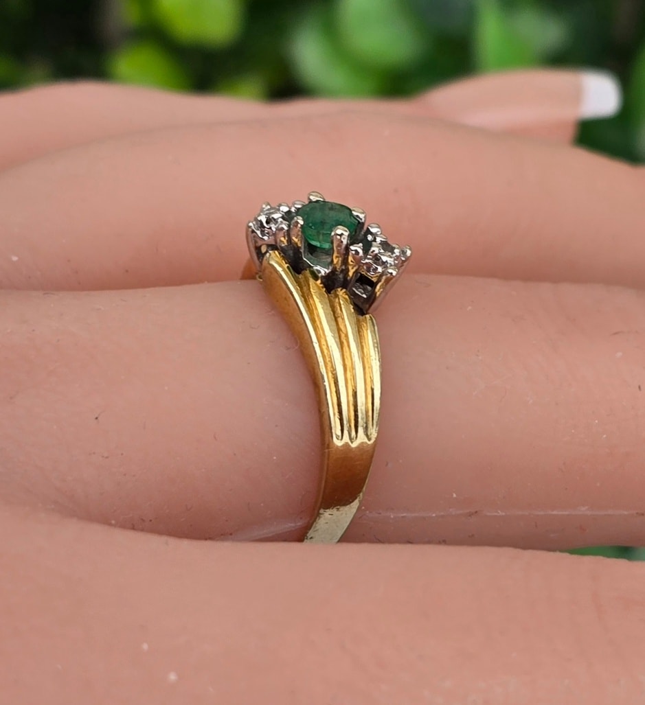 Inel "trio" vechi, din aur de 14K, cu smarald și 2 diamante naturale.