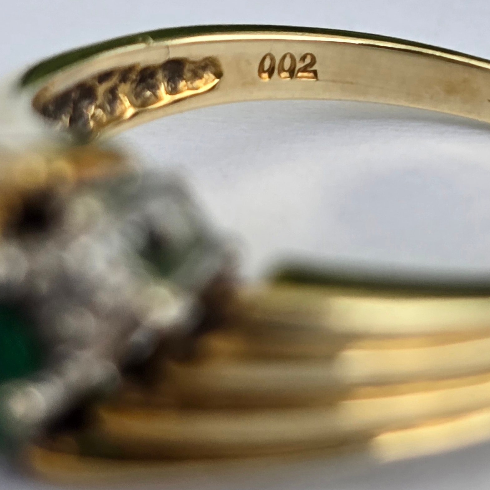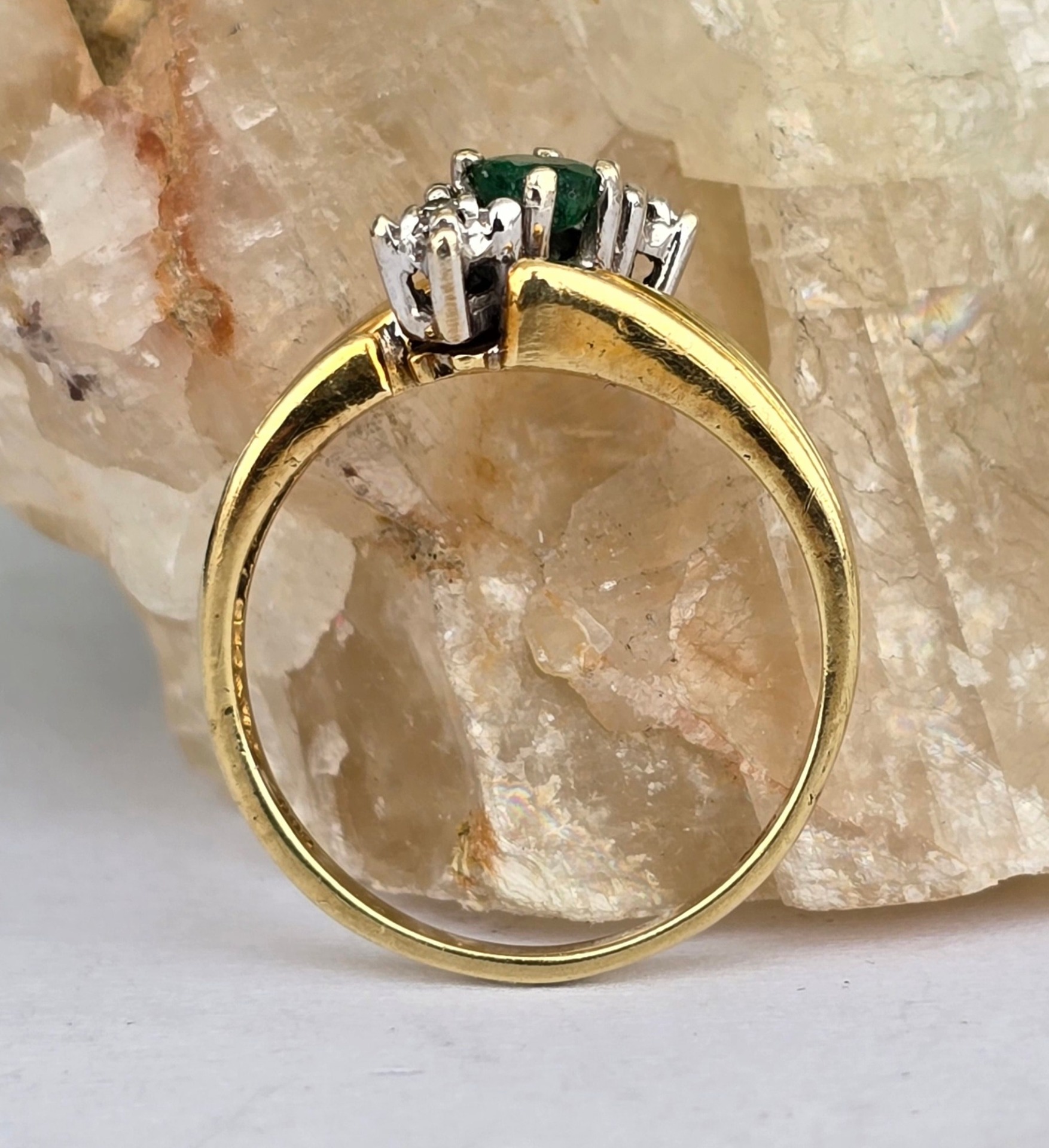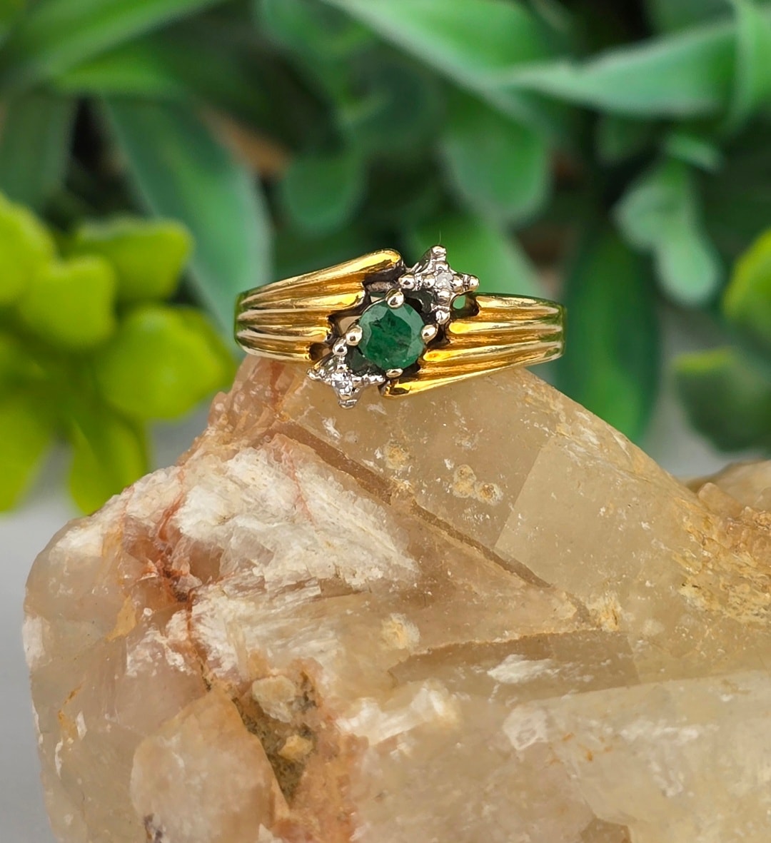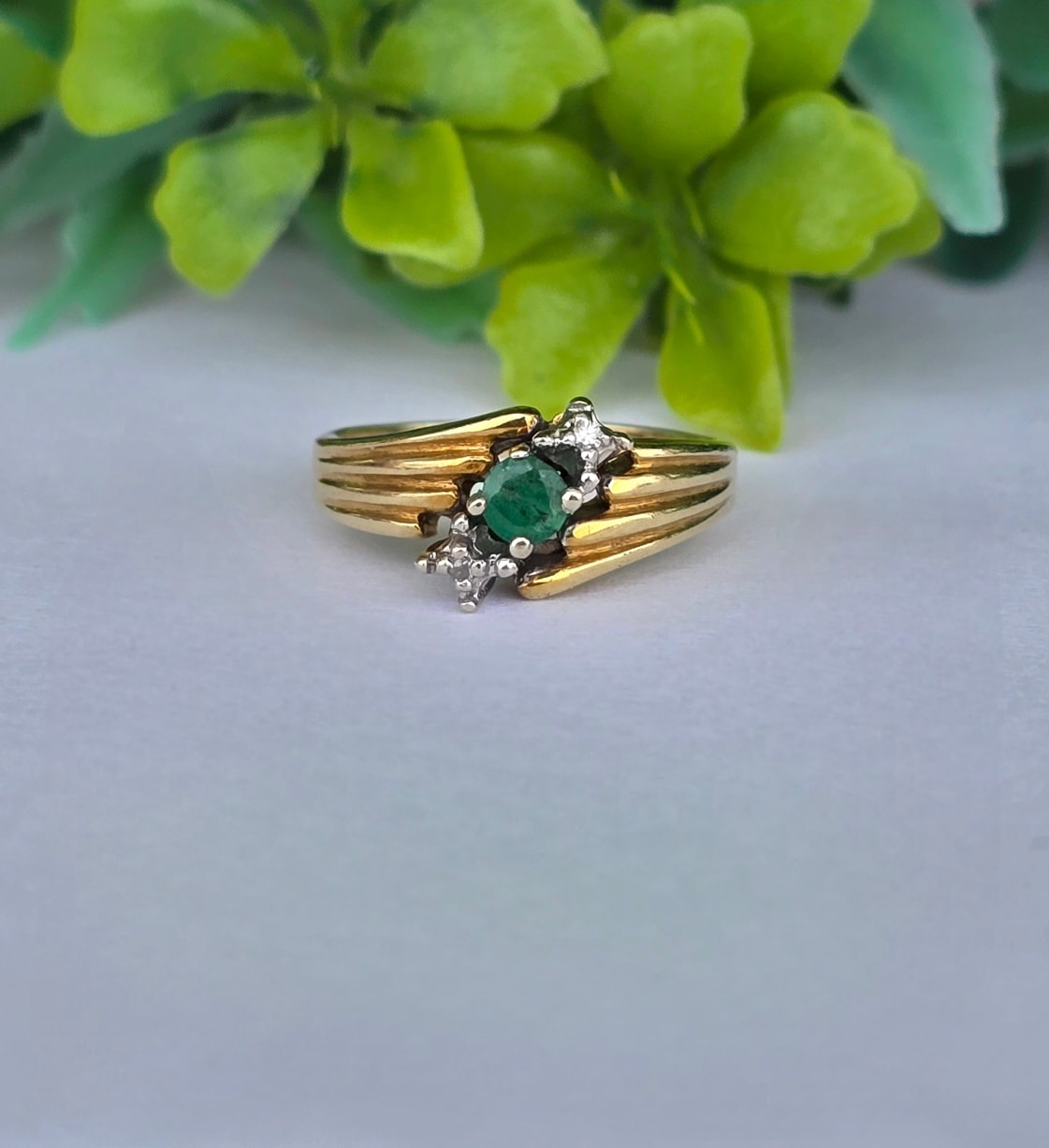 Inel "trio" vechi, din aur de 14K, cu smarald și 2 diamante naturale.