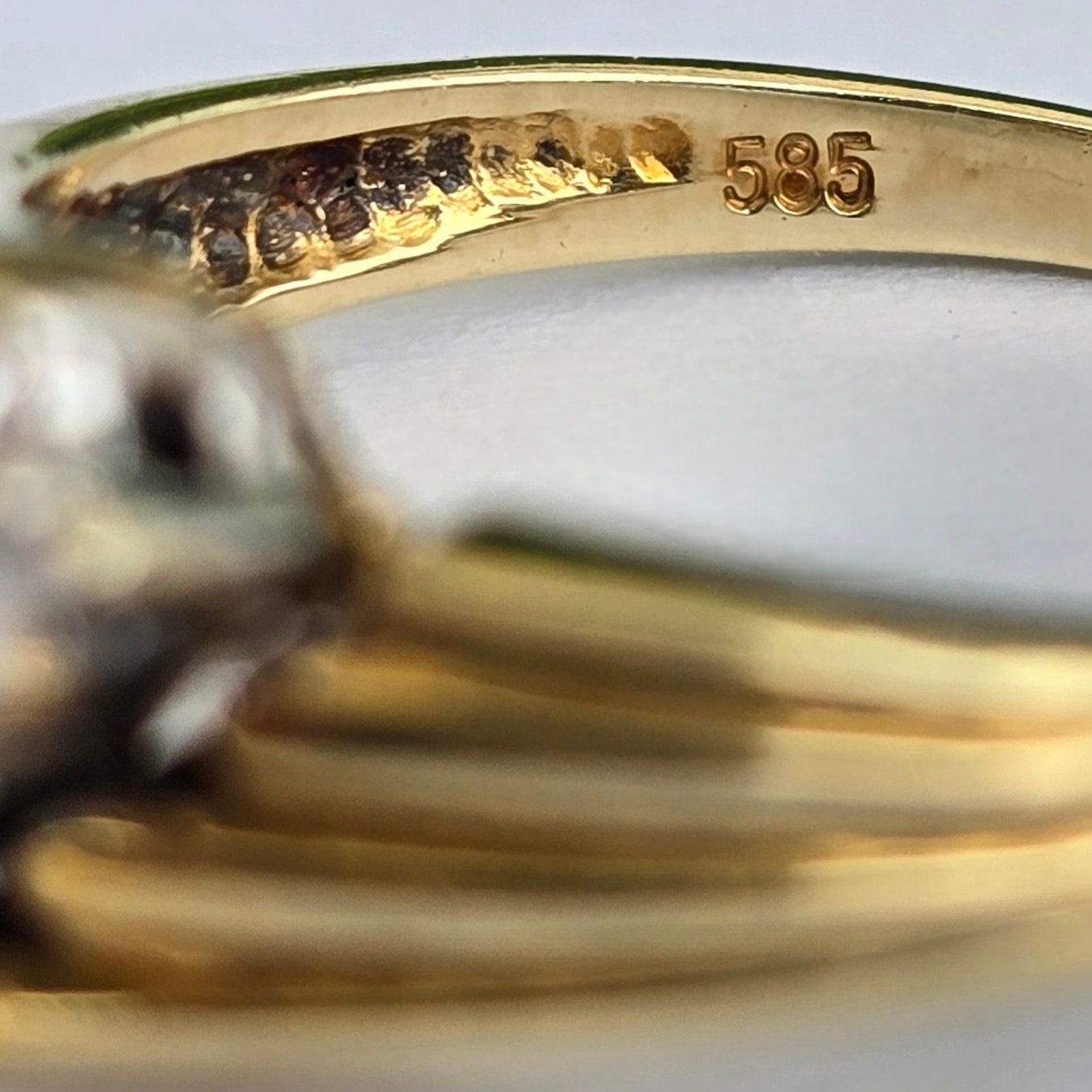Prezintă marcaj 585 pentru puritate aur de 14K și marcaj "0.02" pentru caratajul diamantelor.