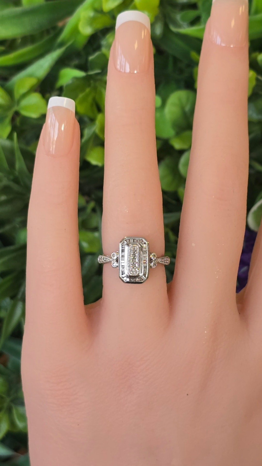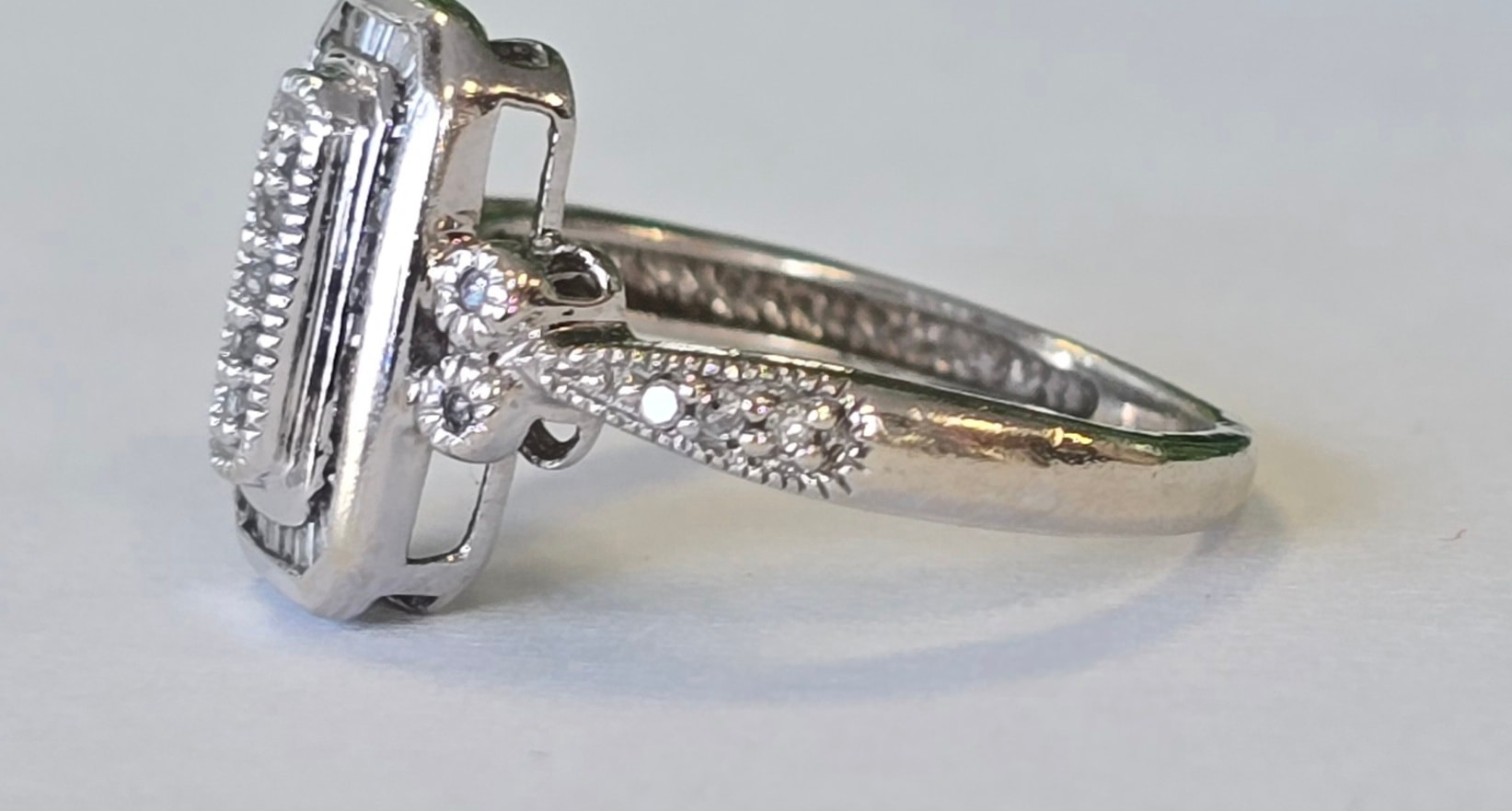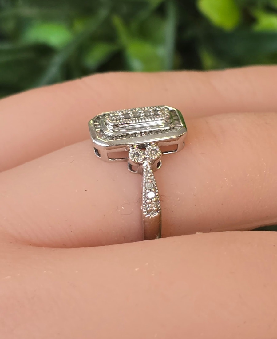 Inel vechi Art Deco, din aur de 14K, cu 51 diamante naturale, manufactură complexă cu diamante "baguette" în montură "calibré" cu efect de rază de soare.