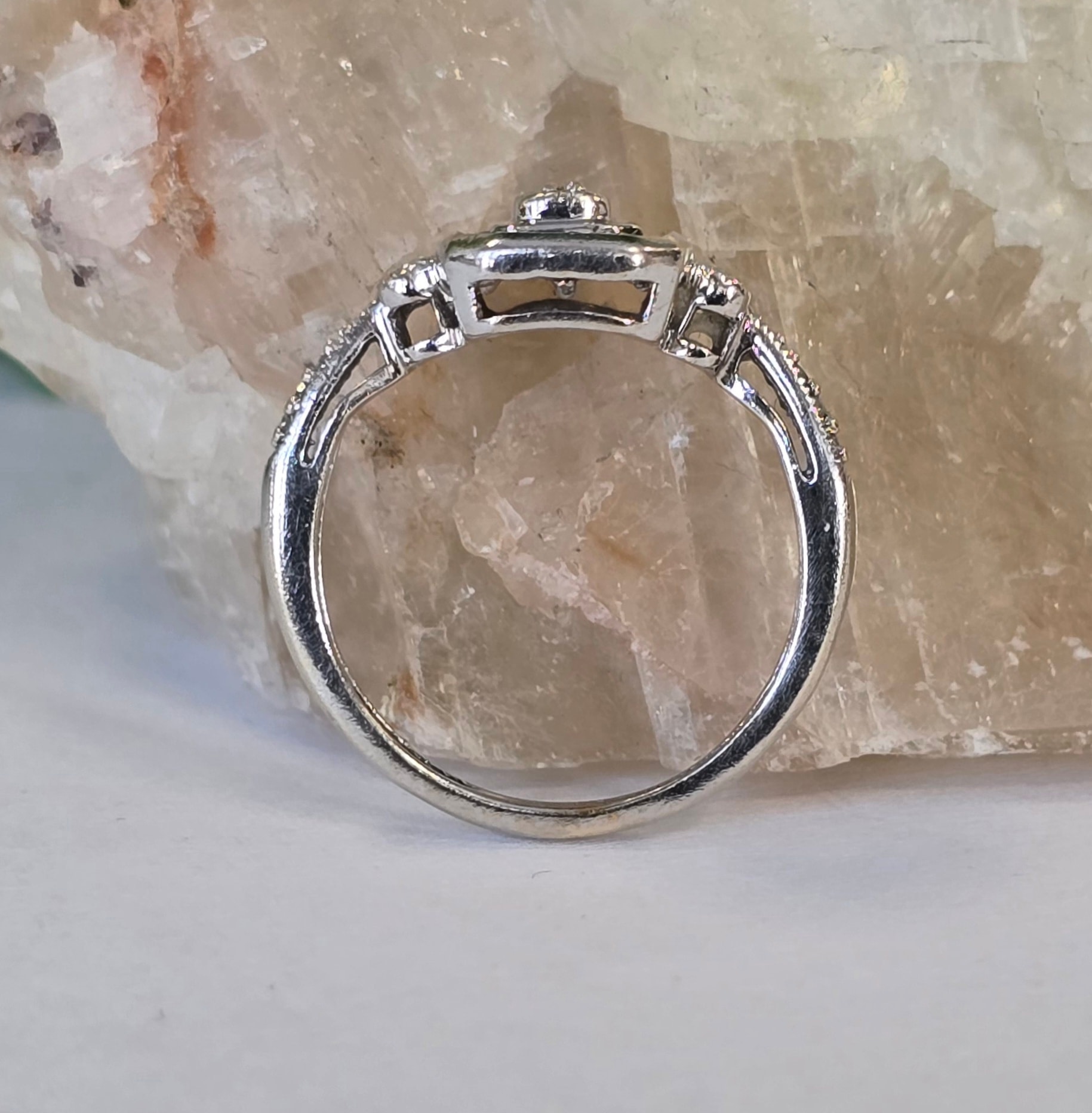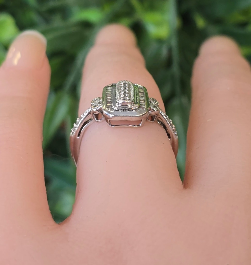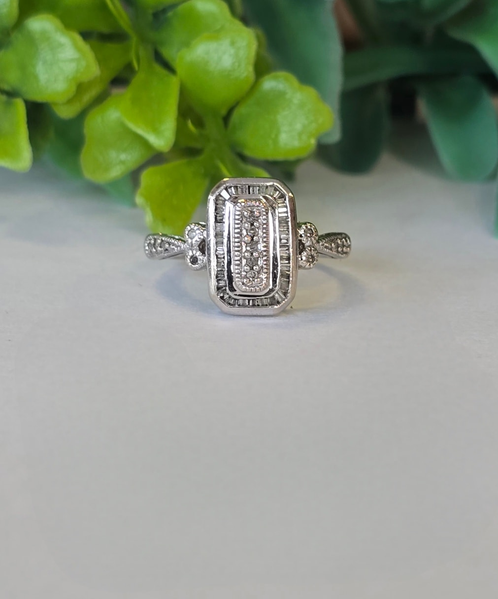 Inel vechi Art Deco, din aur de 14K, cu 51 diamante naturale, manufactură complexă cu diamante "baguette" în montură "calibré" cu efect de rază de soare.