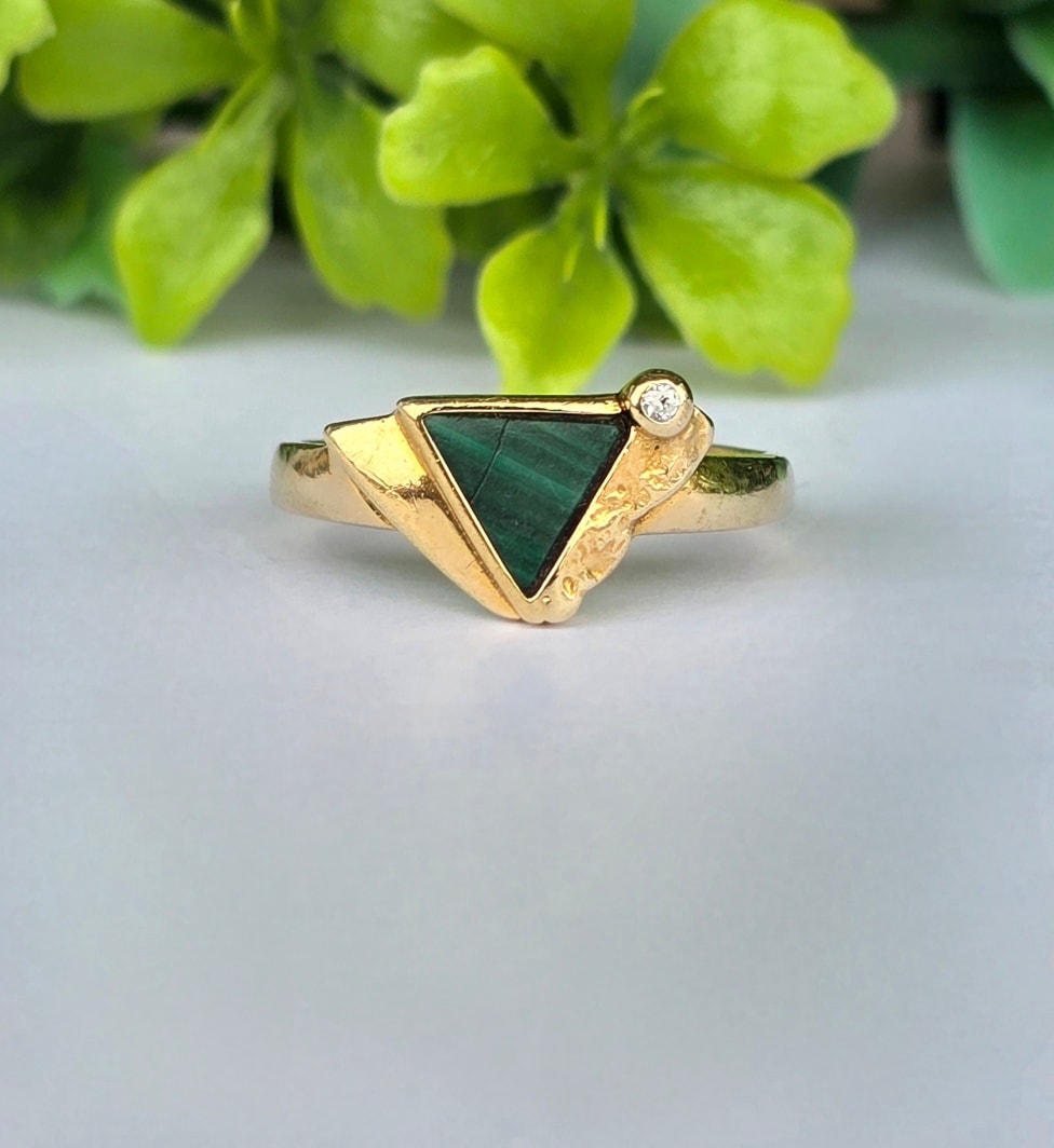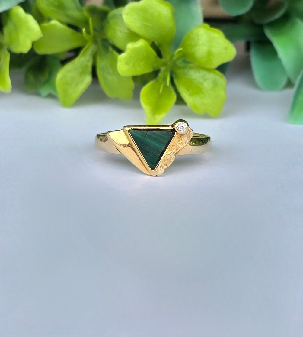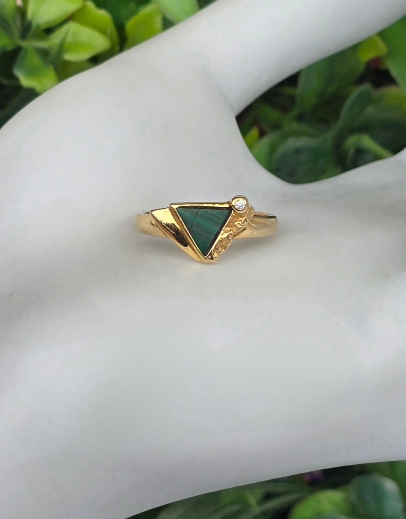 Inel vechi Art Deco din aur de 8K, cu malachit natural și cubic zirconia.