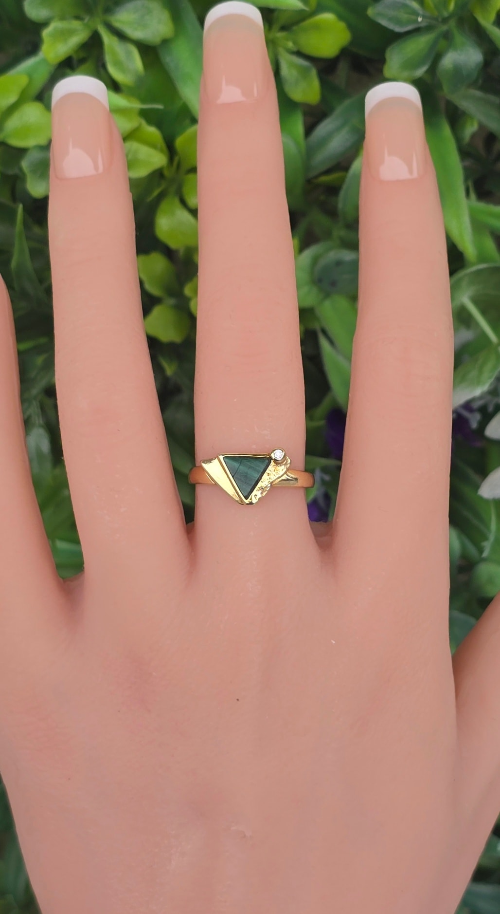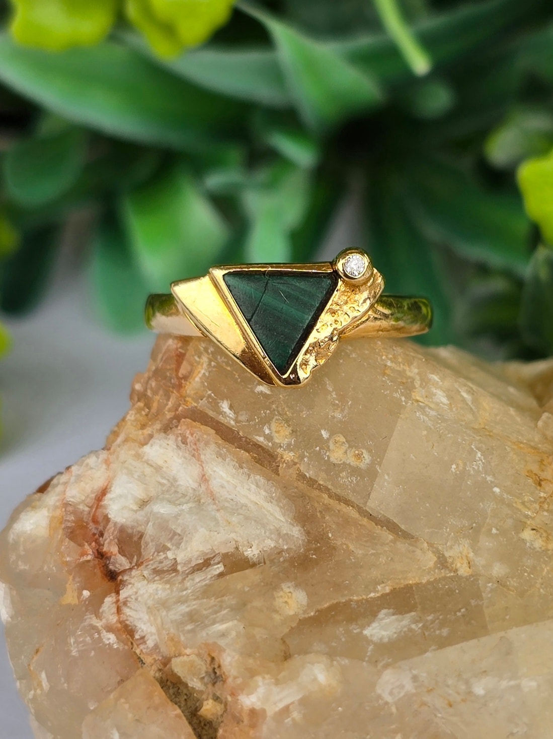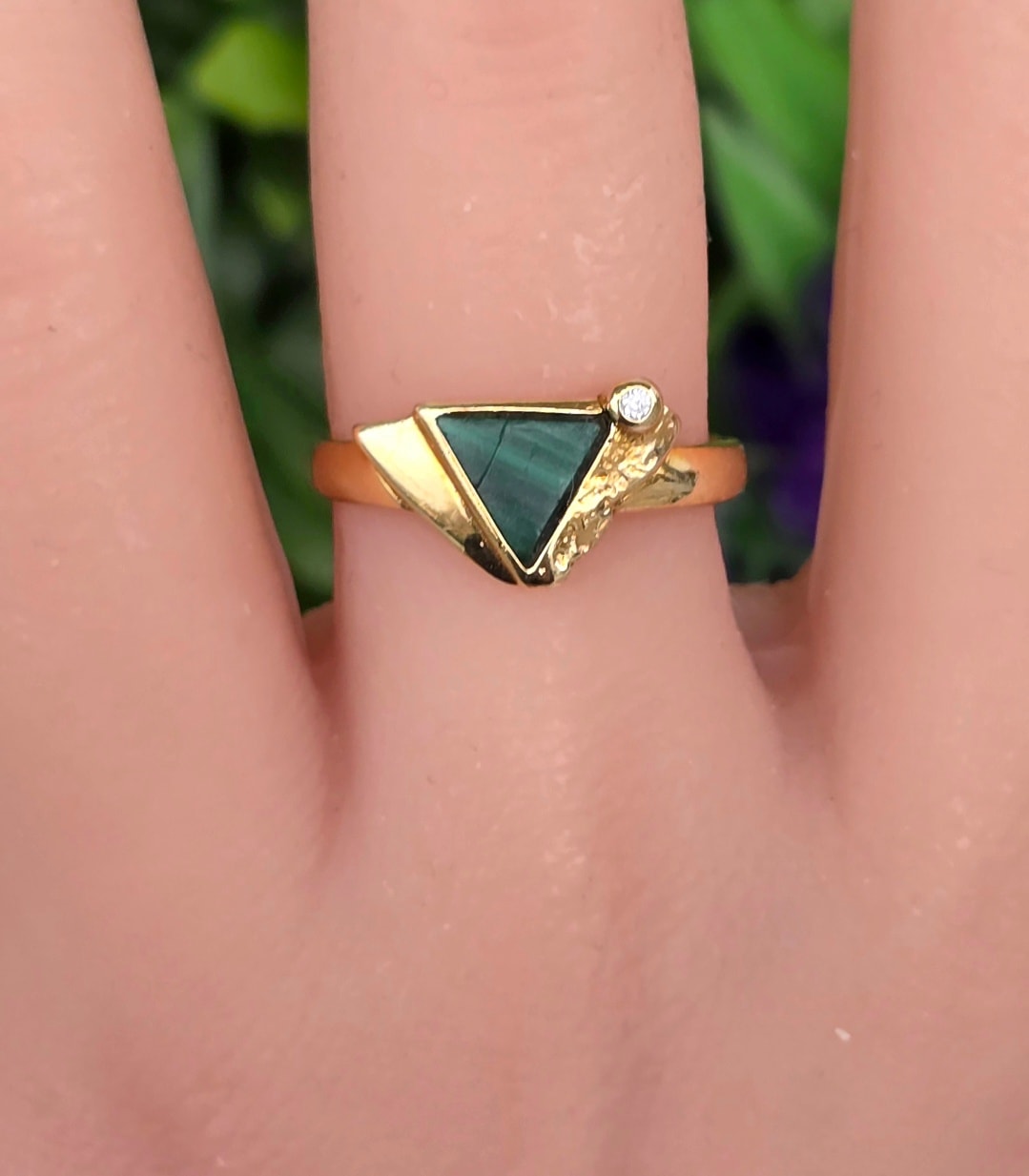 Inel vechi Art Deco din aur de 8K, cu malachit natural și cubic zirconia.