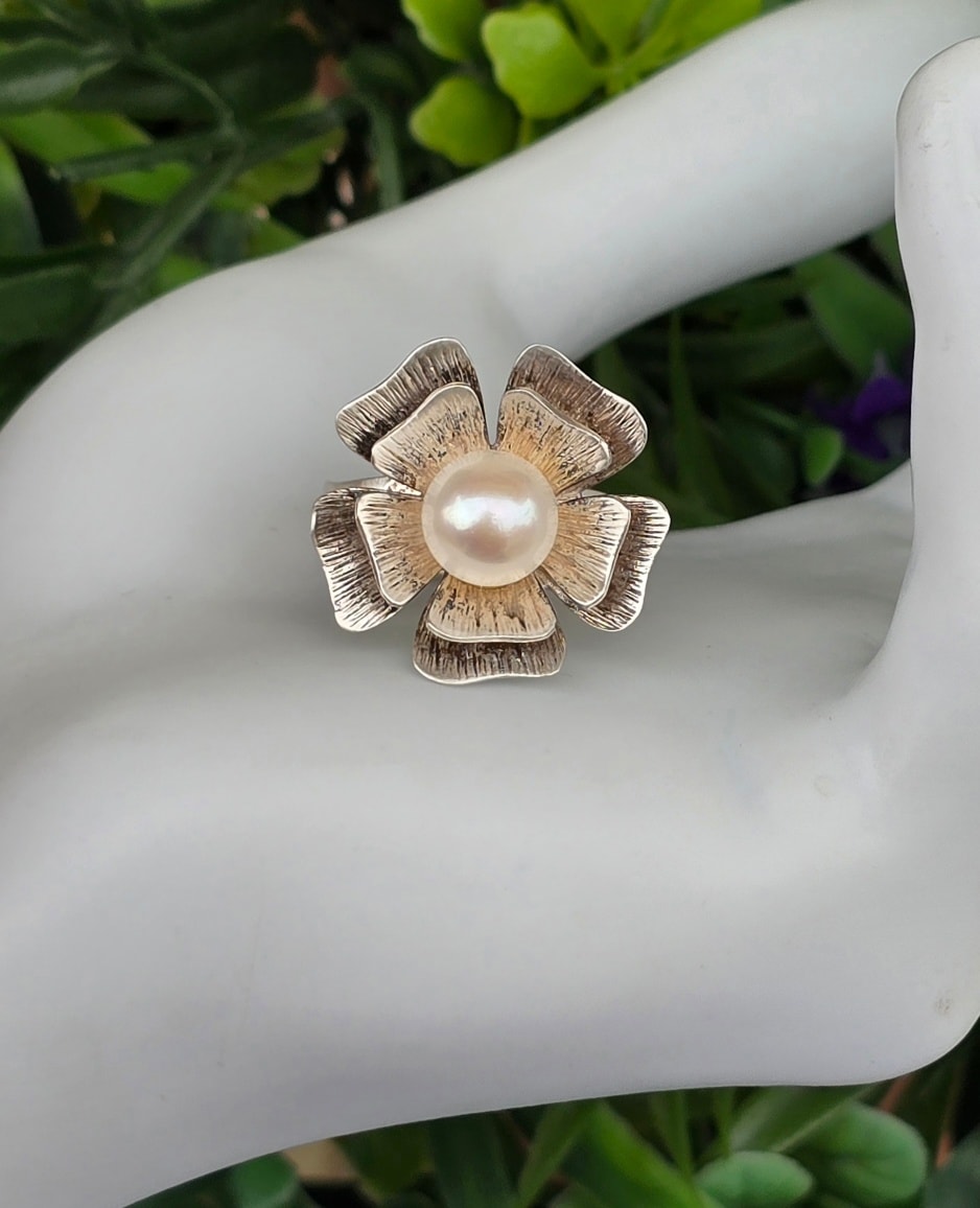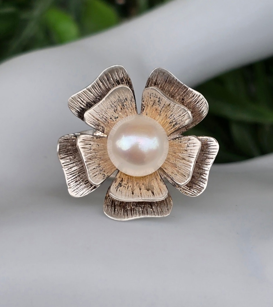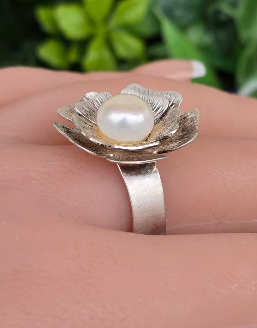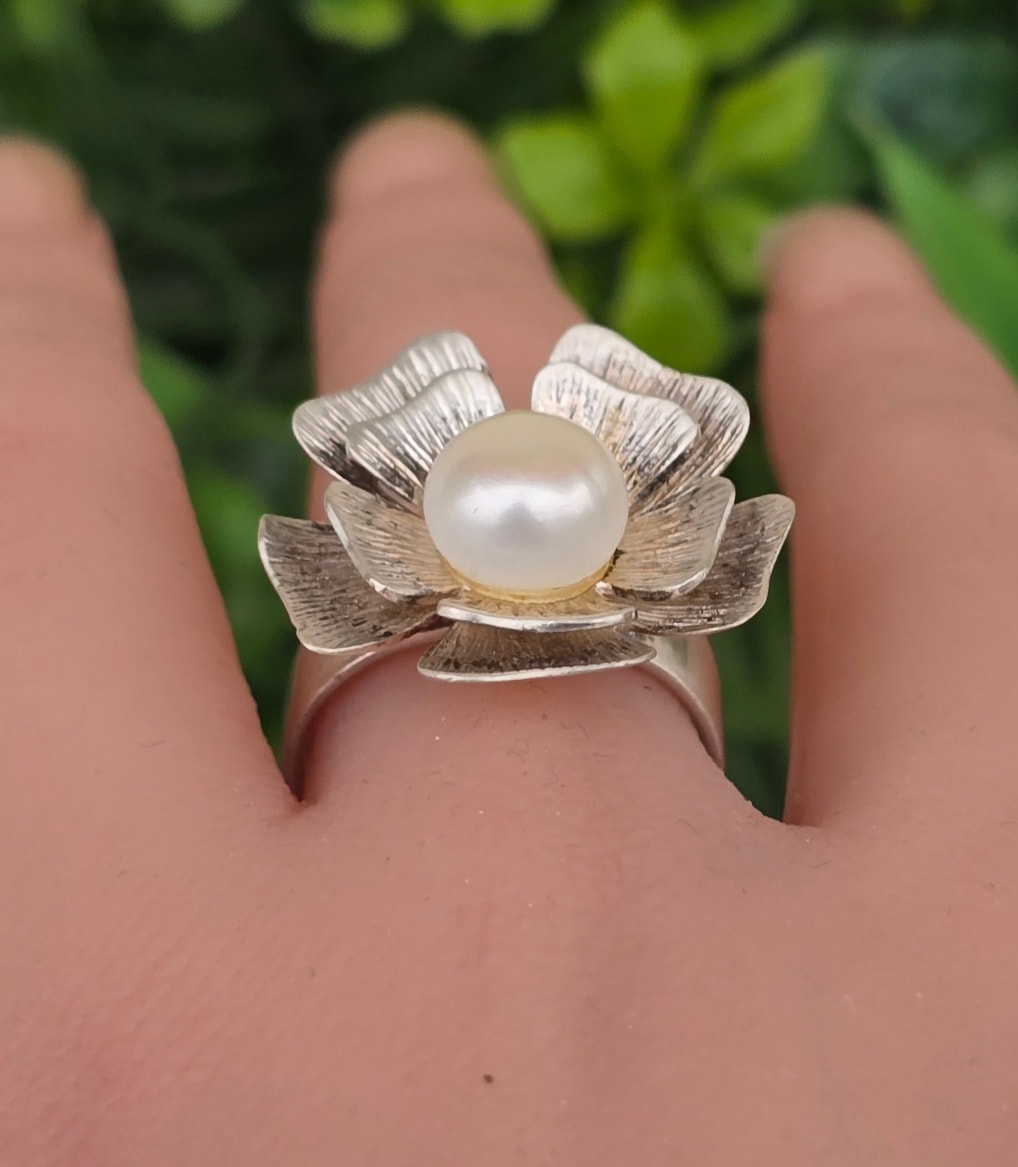 Inel vechi deosebit, din argint, cu perlă naturală de cultură.