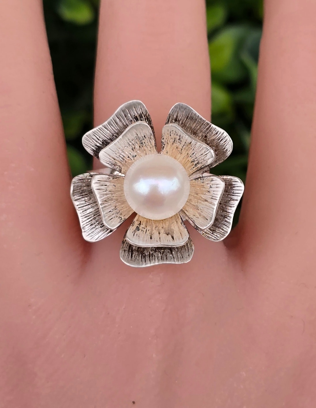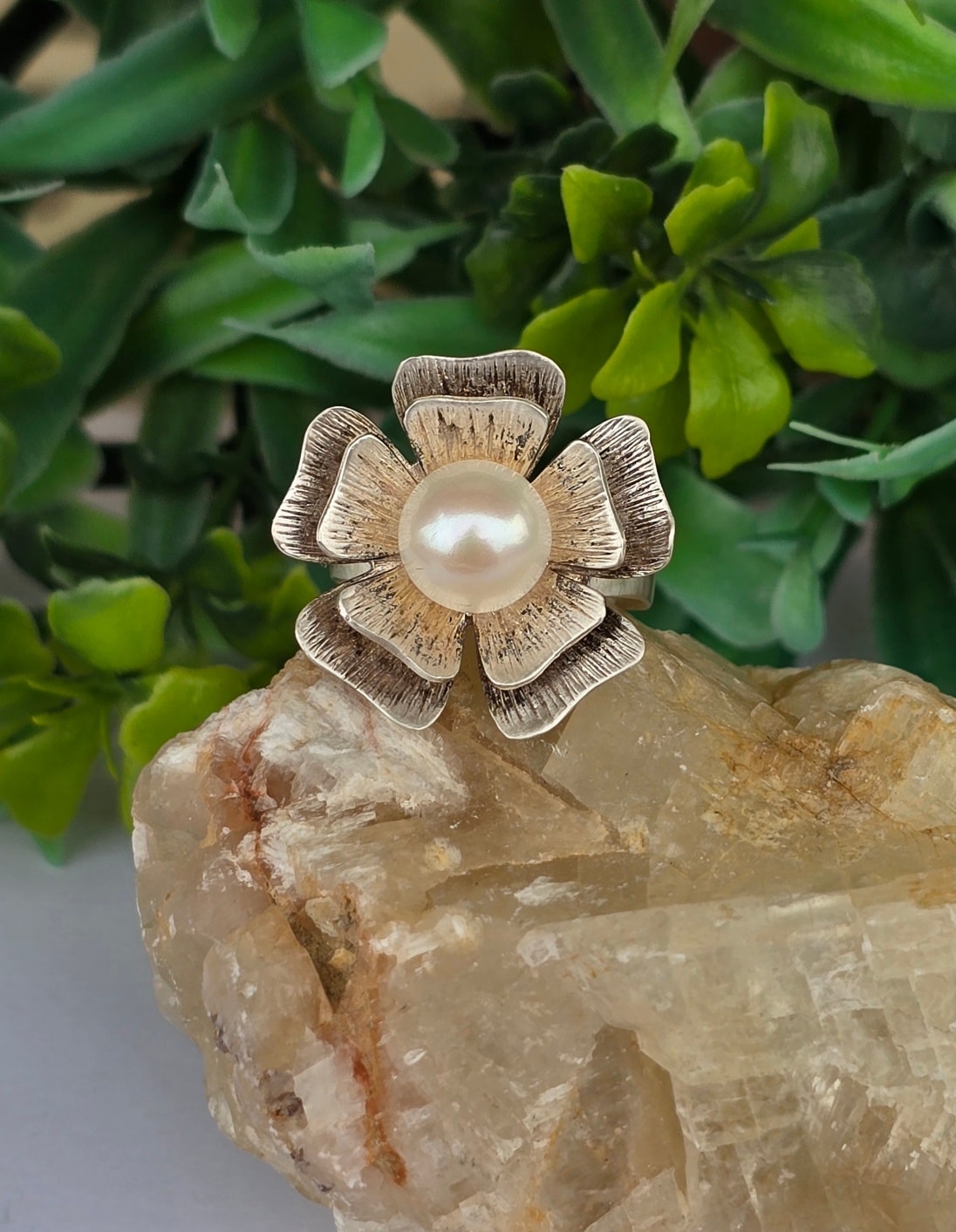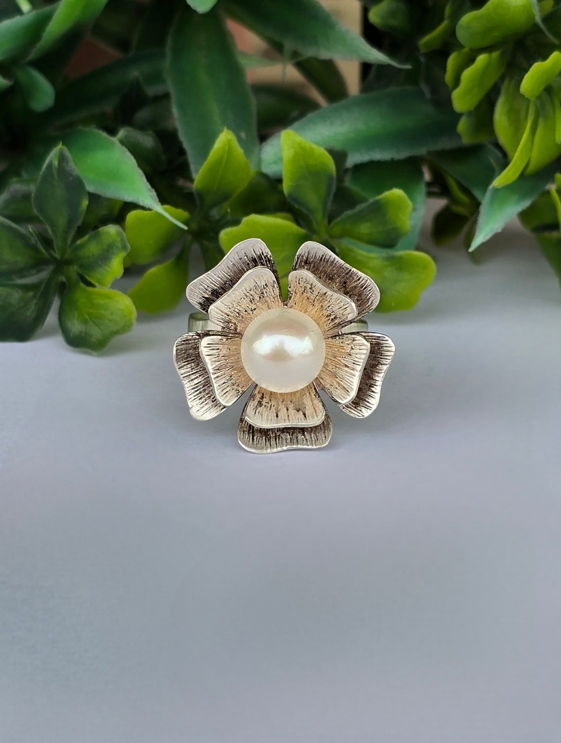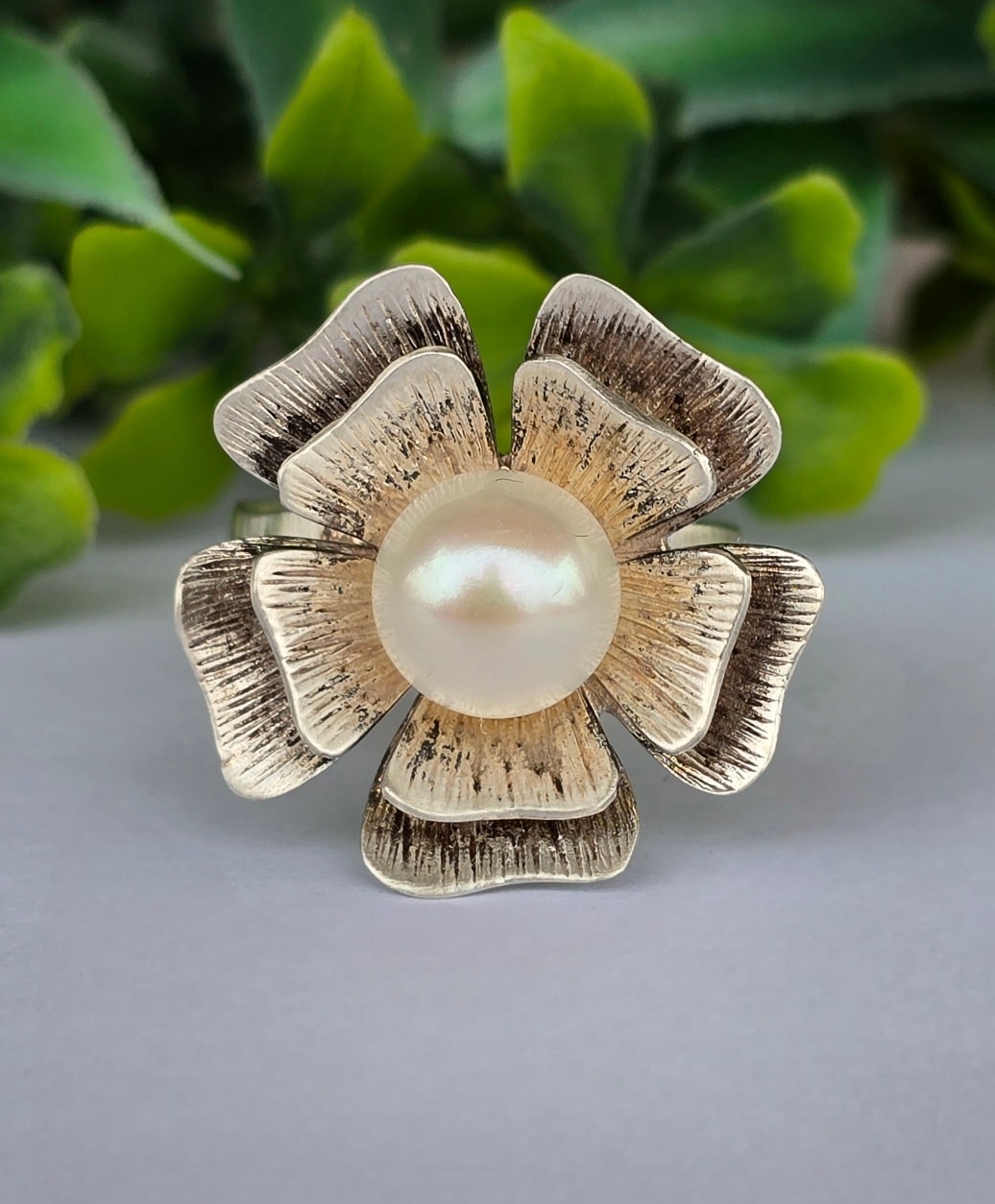Inel vechi deosebit, din argint, cu perlă naturală de cultură.