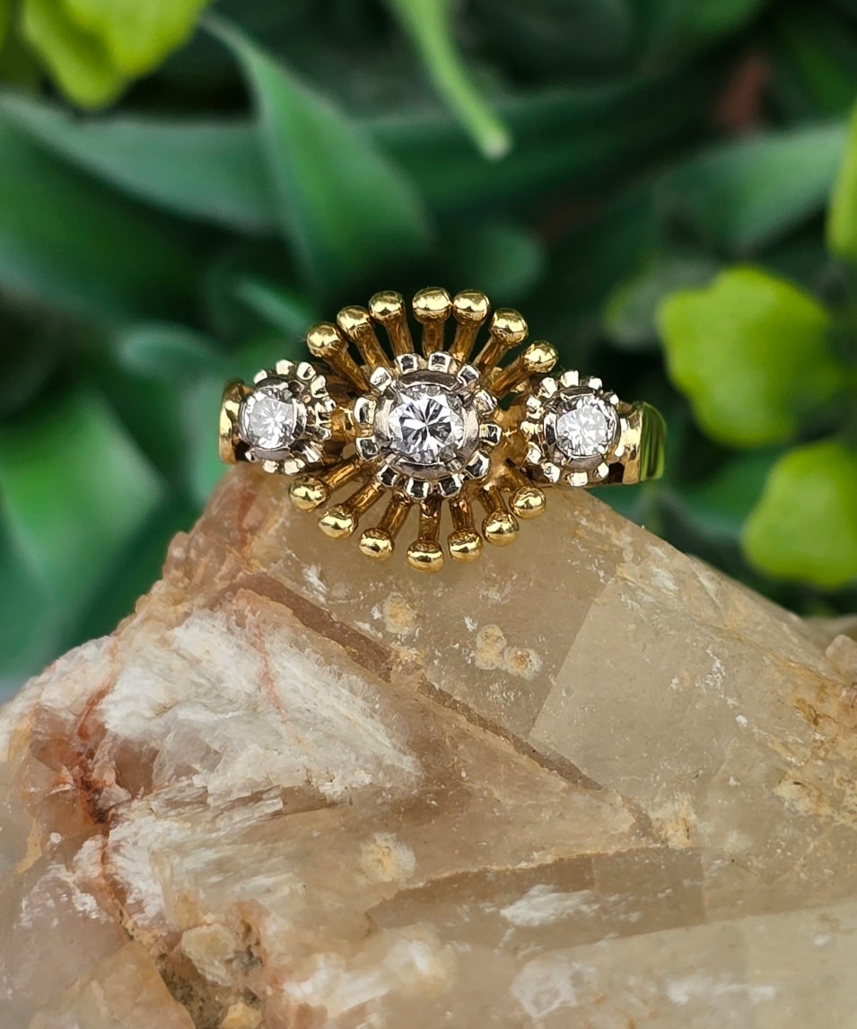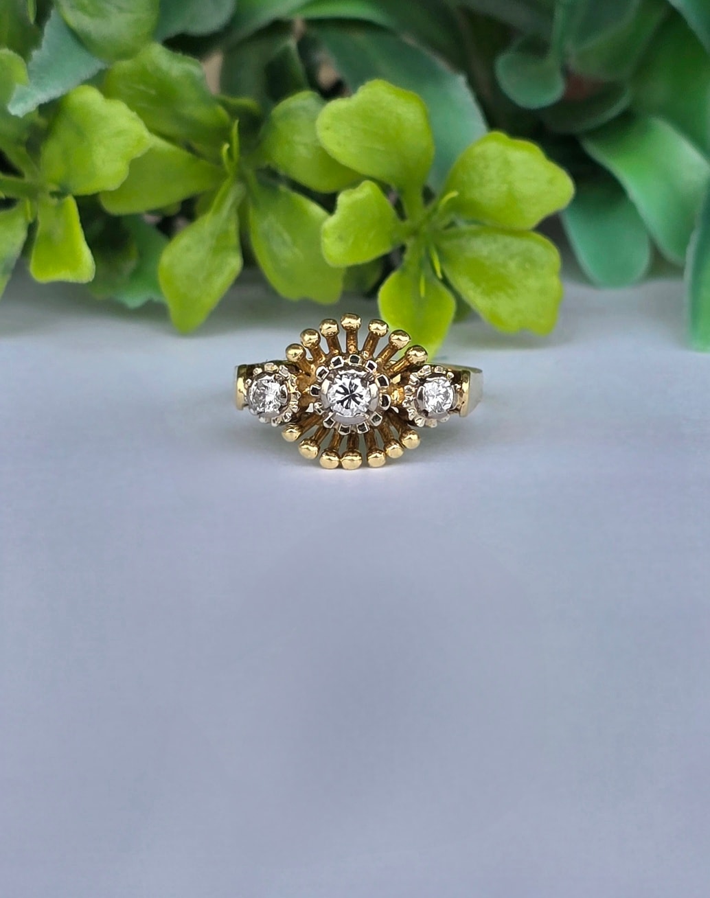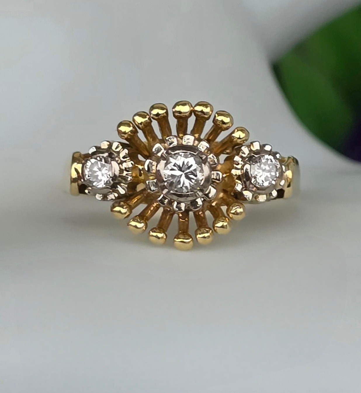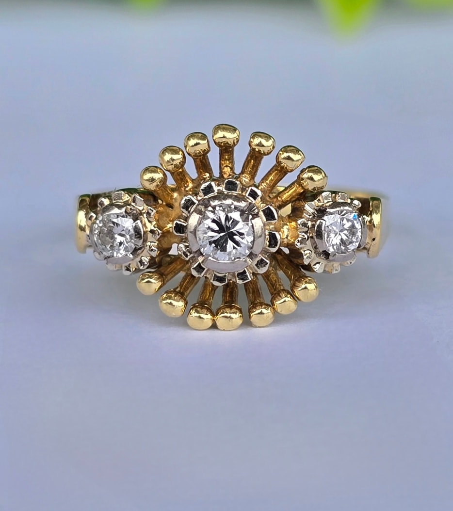 Inel vechi deosebit, din aur de 14K, cu 3 diamante naturale (0.30ct).