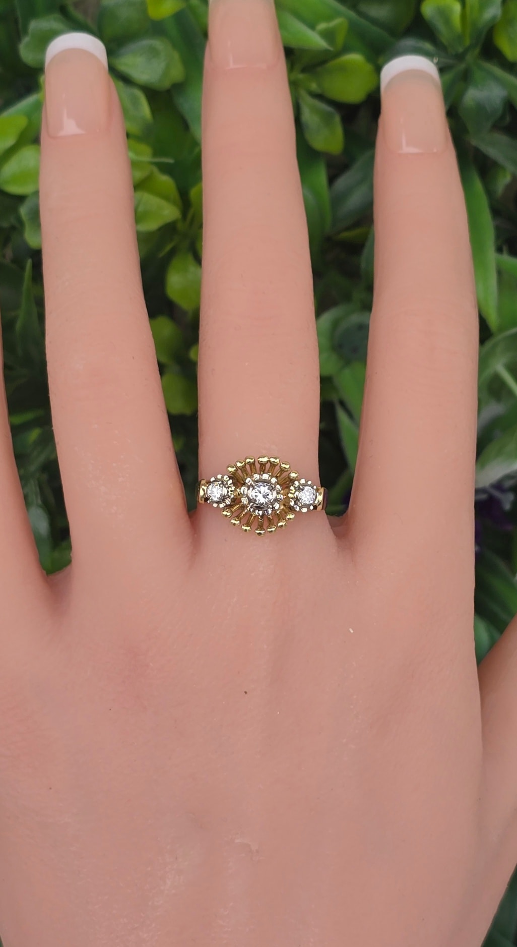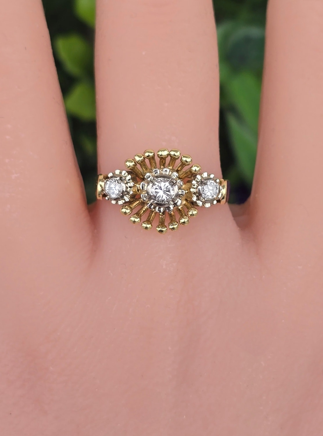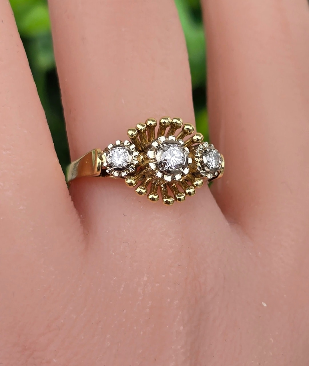 Inel vechi deosebit, din aur de 14K, cu 3 diamante naturale (0.30ct).