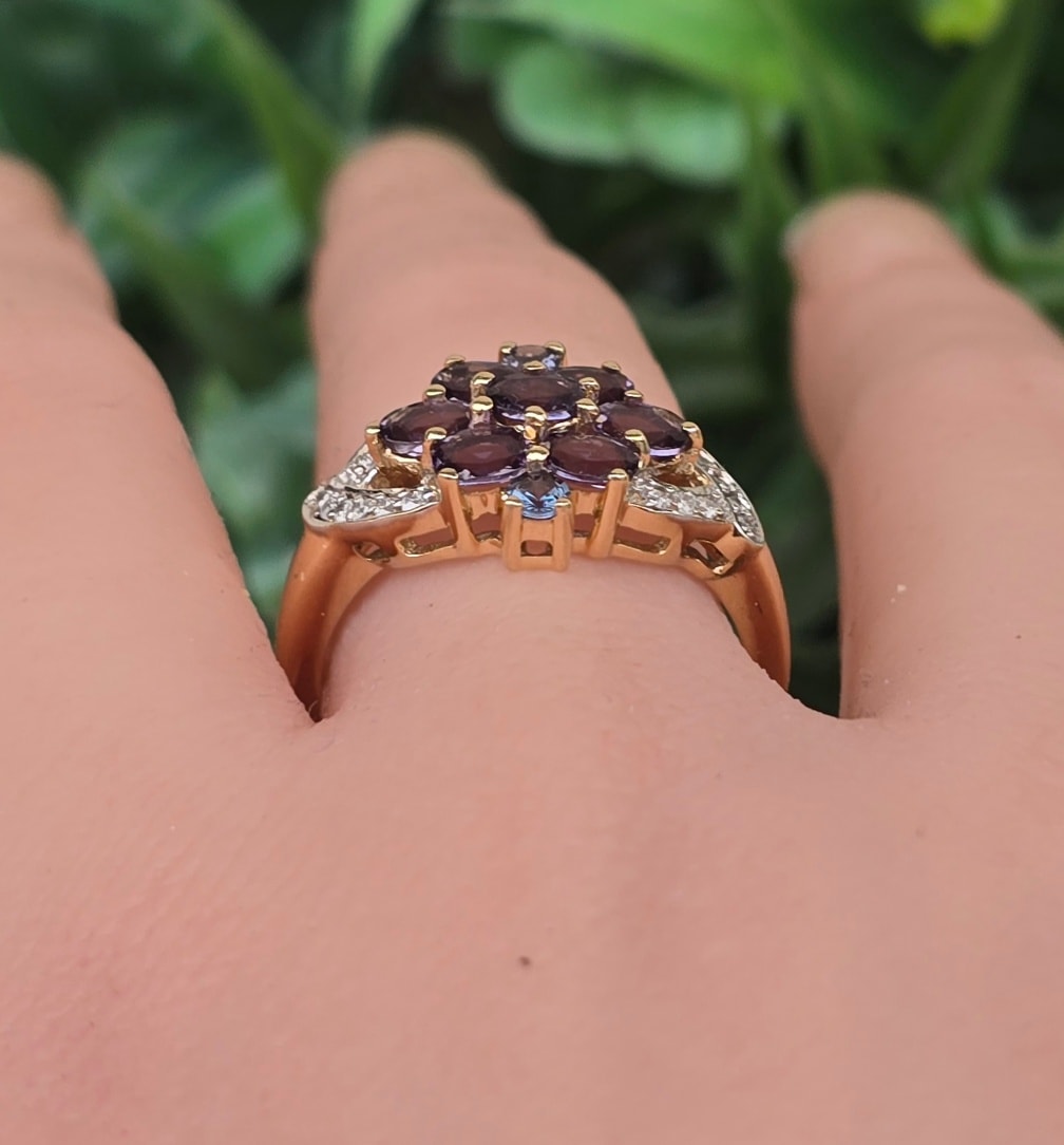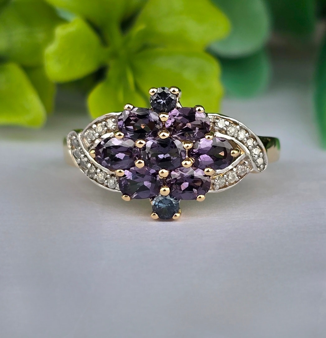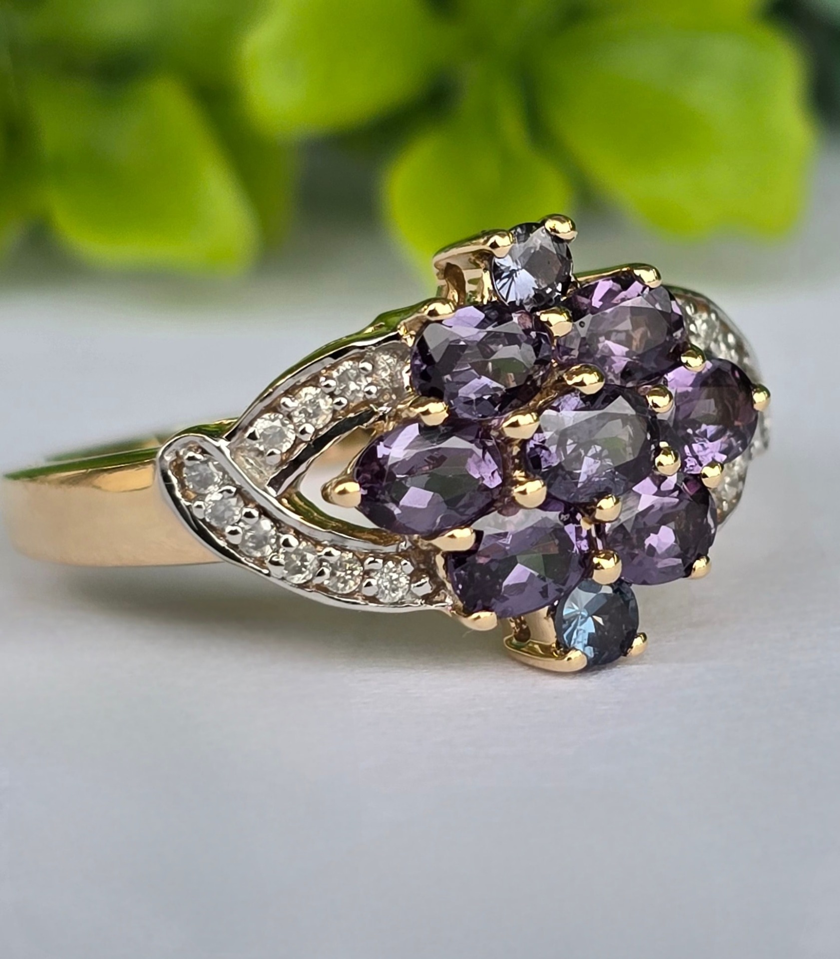 Inel vechi deosebit, din aur de 14K, cu 9 rare granate tanzaniene cu schimbare de culoare ("color change Tanzanian garnets"), cu nuanțe de albastru, verde și violet în funcție de tipul de lumină și 18 diamante naturale.