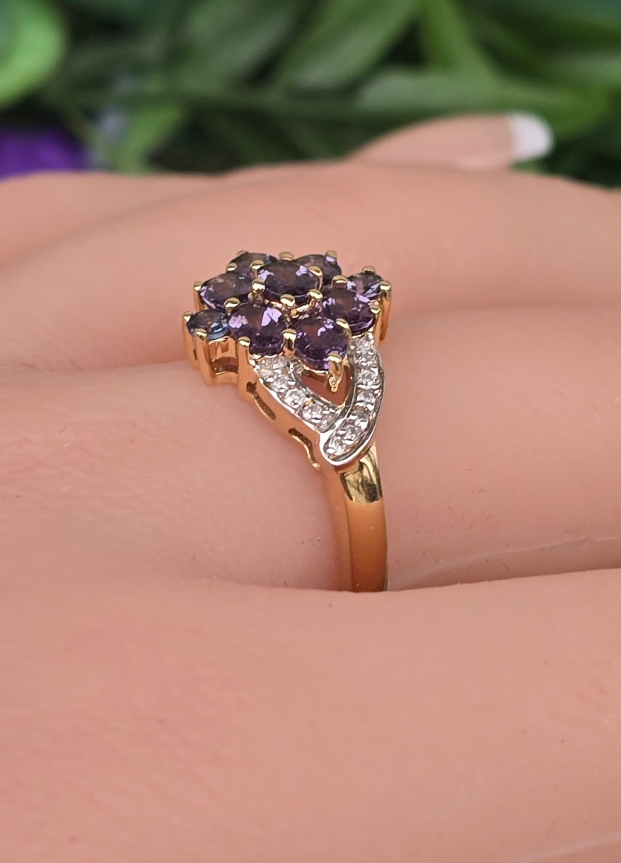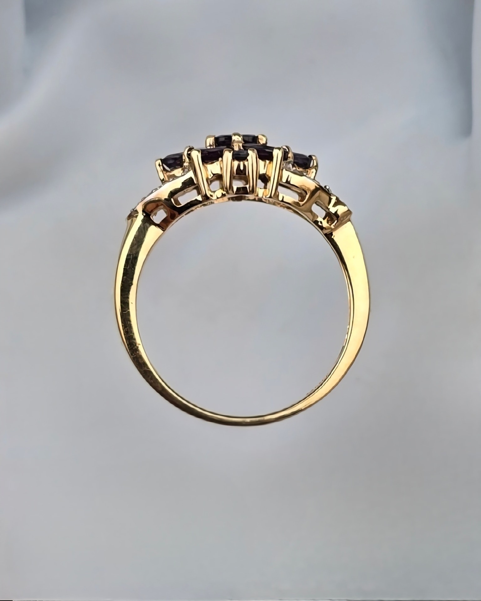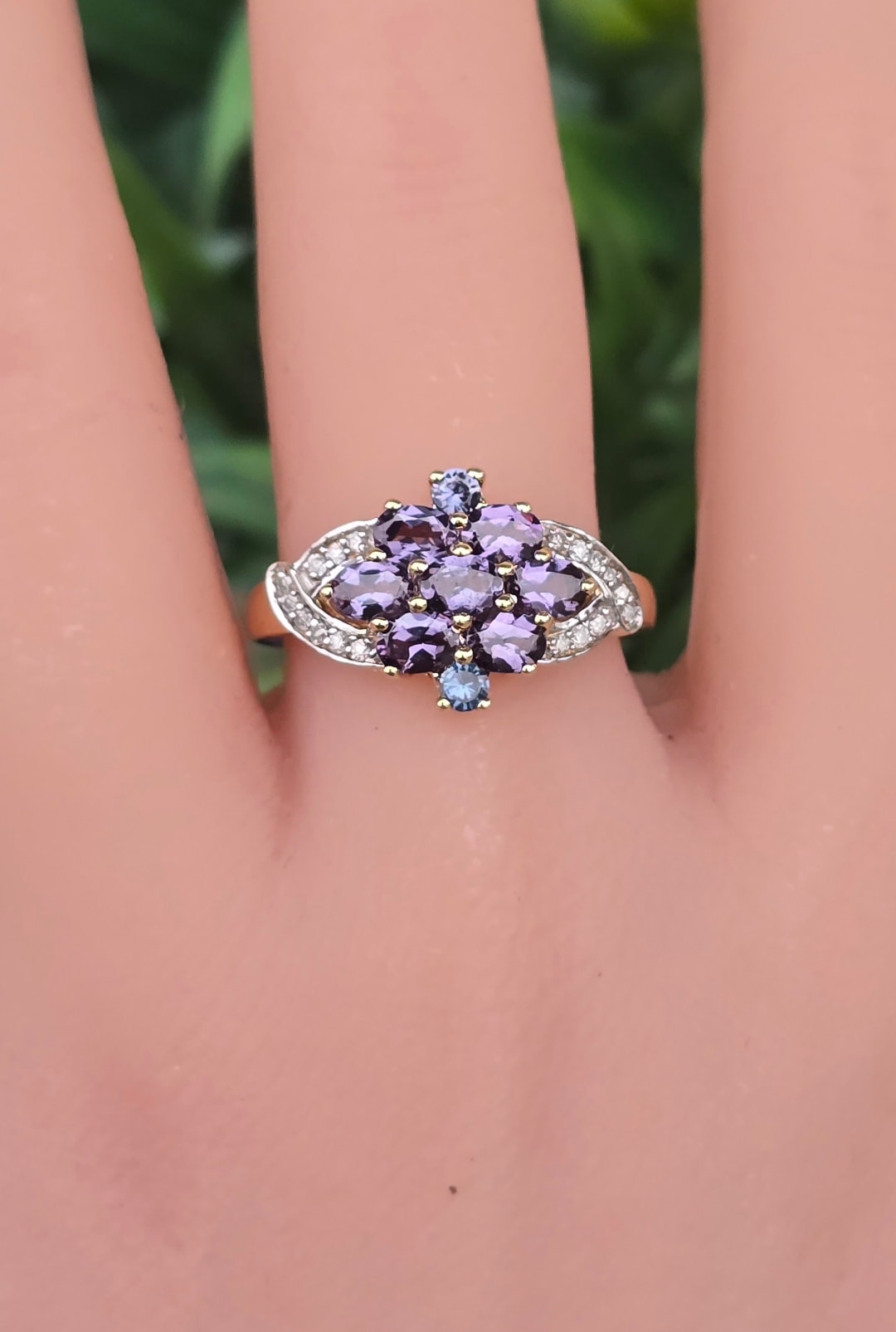 Inel vechi deosebit, din aur de 14K, cu 9 rare granate tanzaniene cu schimbare de culoare ("color change Tanzanian garnets"), cu nuanțe de albastru, verde și violet în funcție de tipul de lumină și 18 diamante naturale.