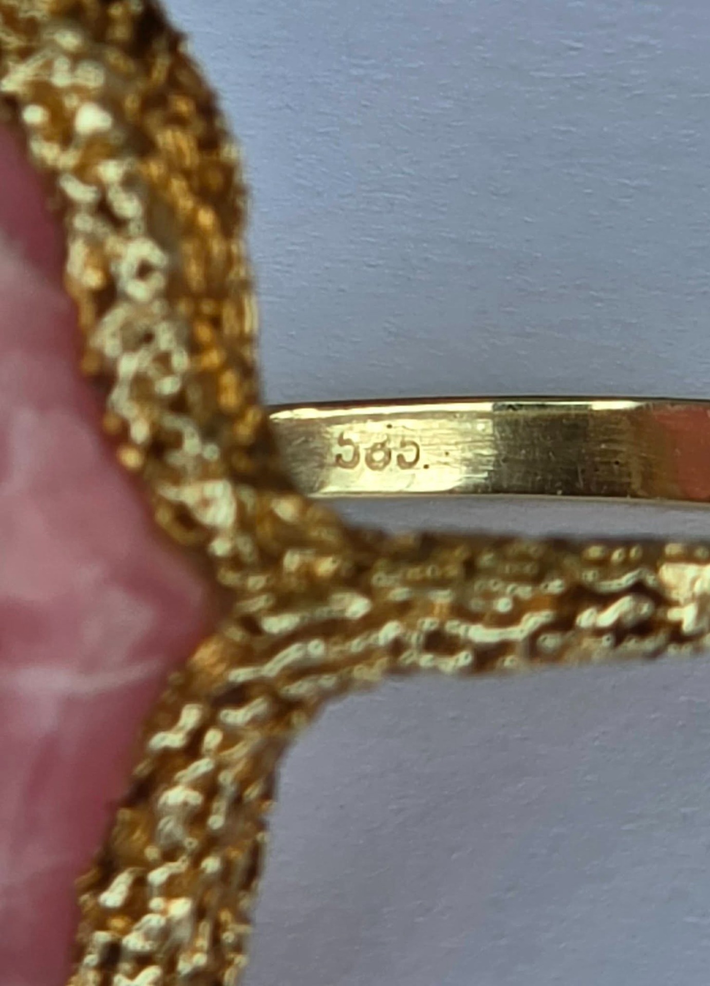 Prezintă marcaj 585 pentru puritate aur de 14K.