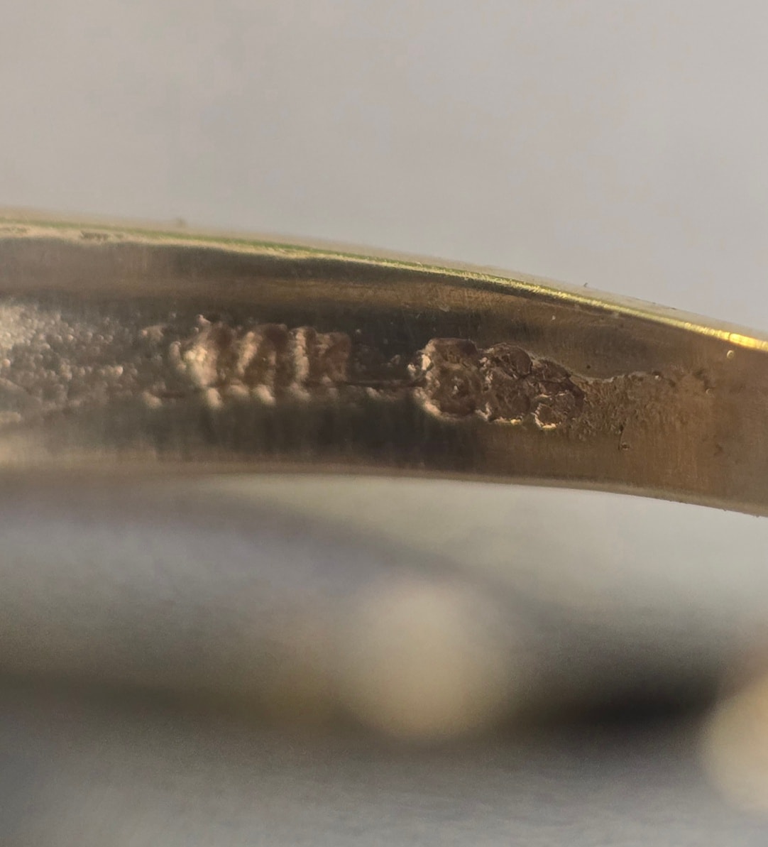 Prezintă marcaj 585 pentru puritate aur de 14K.