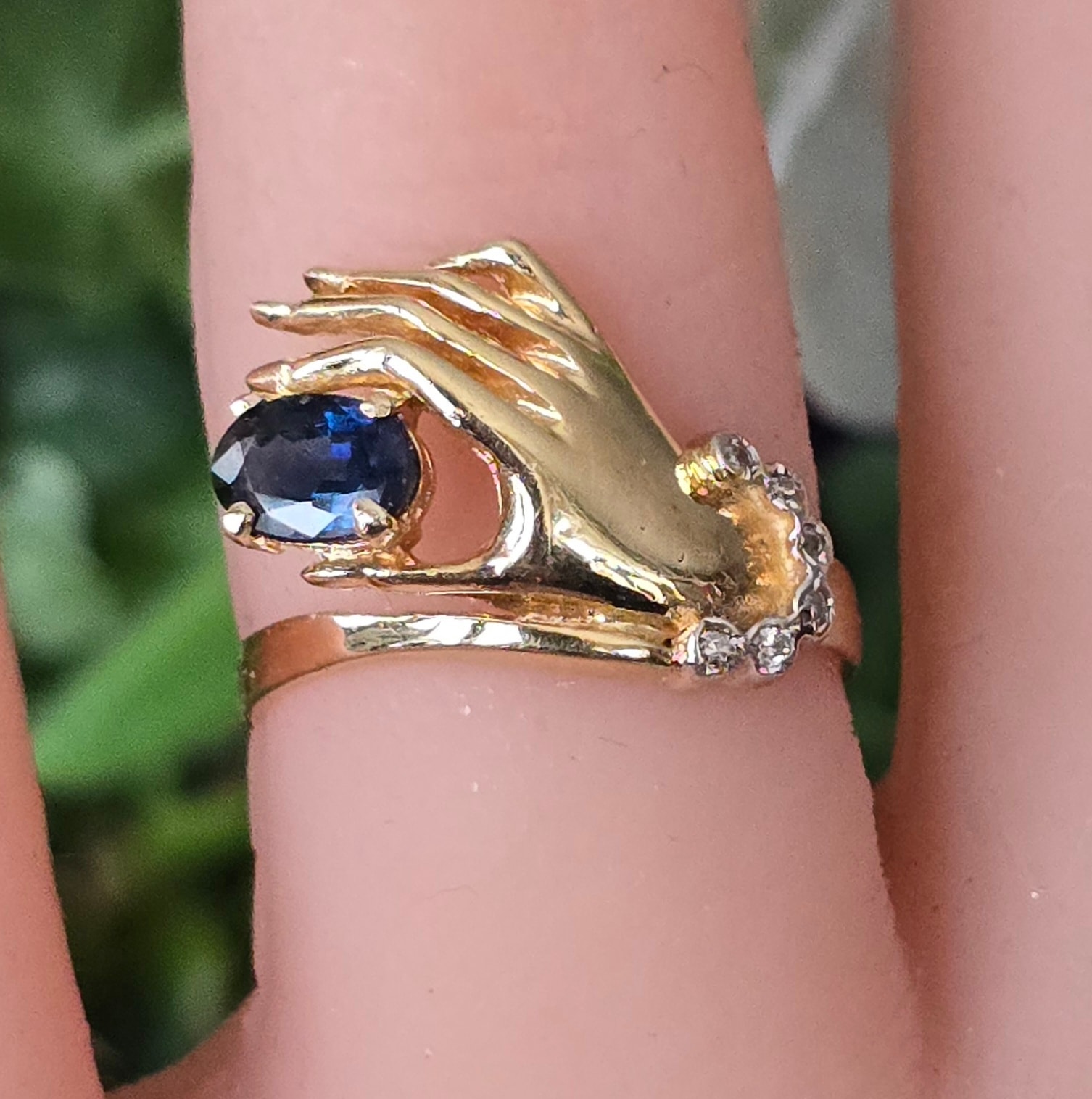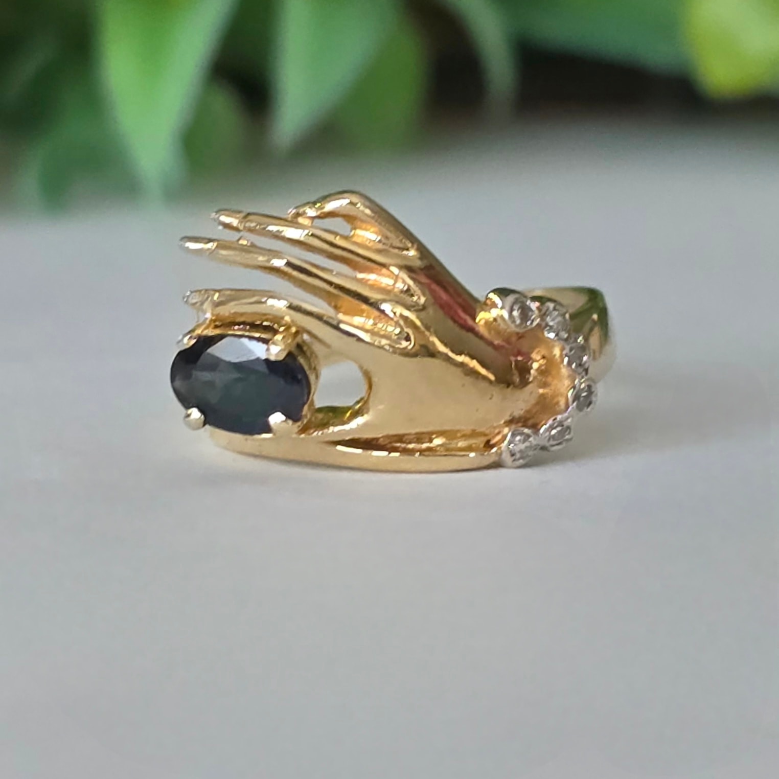Inel vechi deosebit, din aur de 14K, cu safir și 6 diamante naturale.