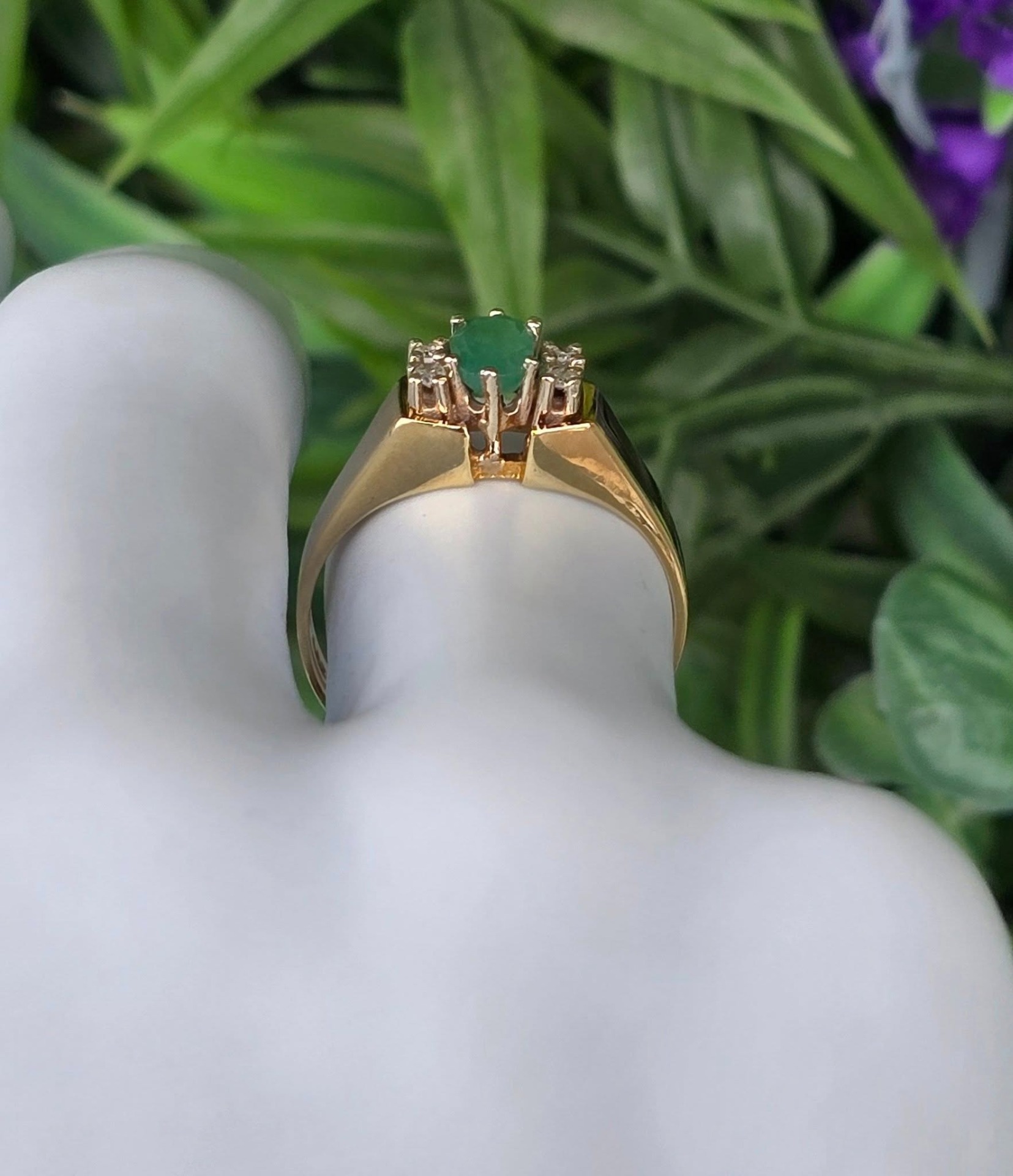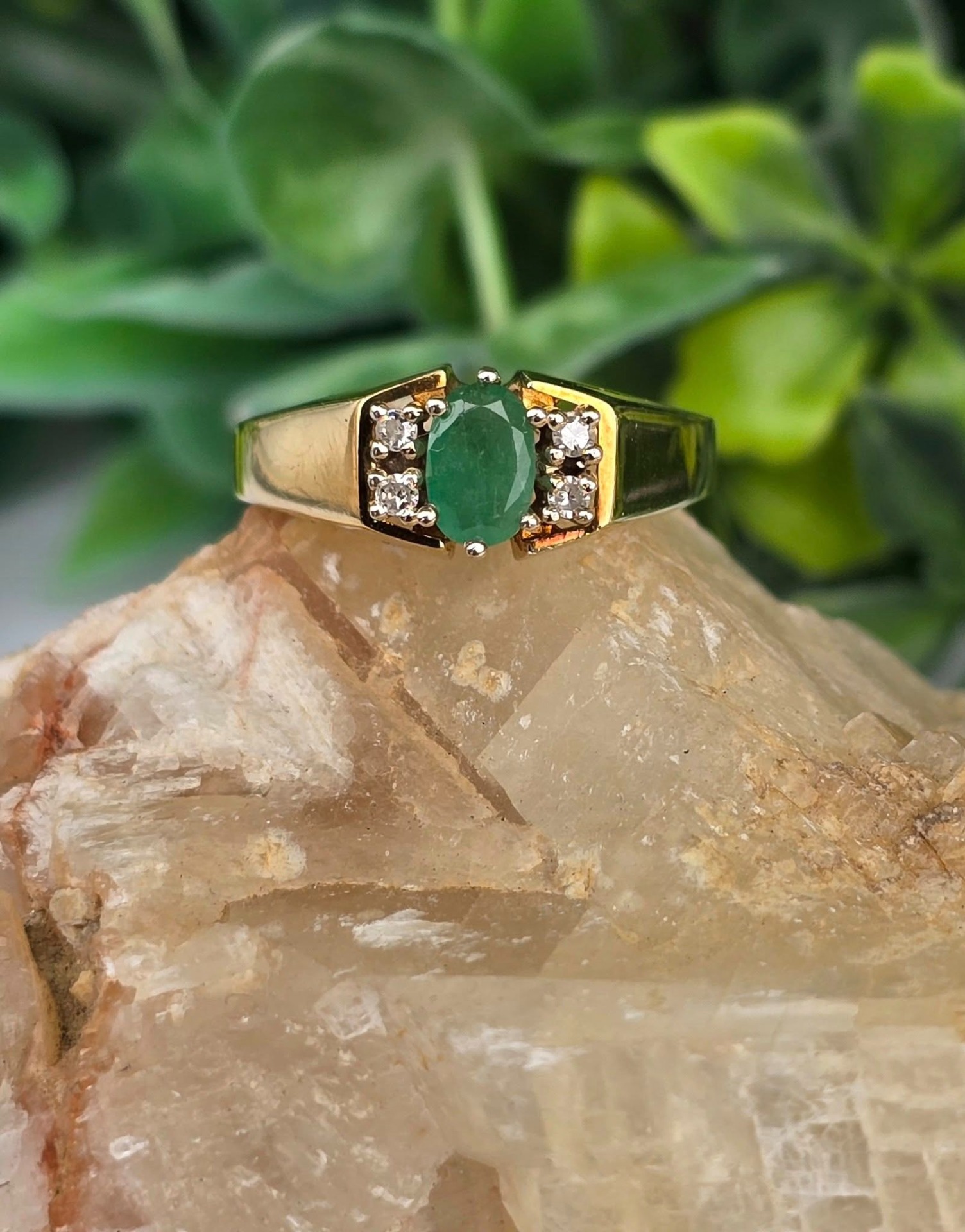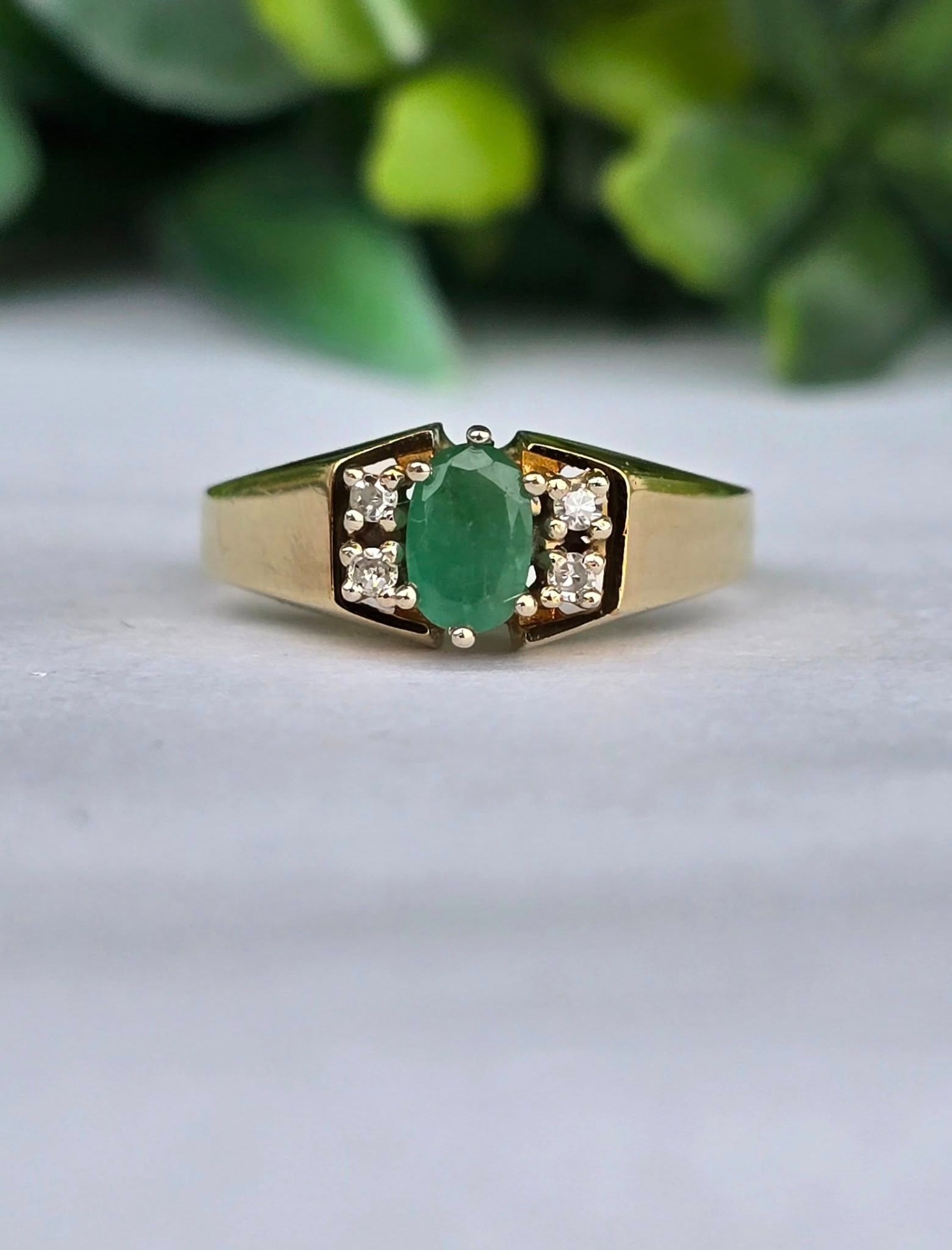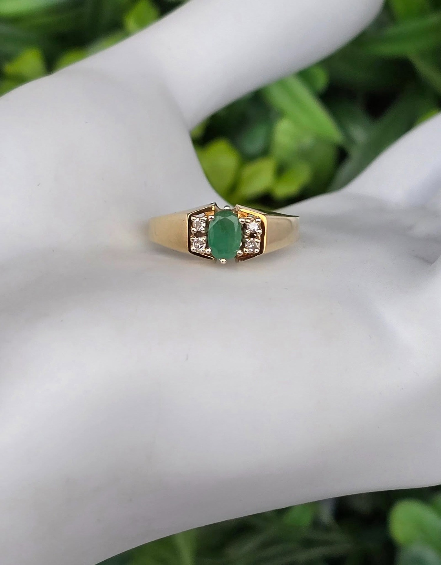 Inel vechi deosebit, din aur de 14K, cu smarald și 4 diamante naturale.
