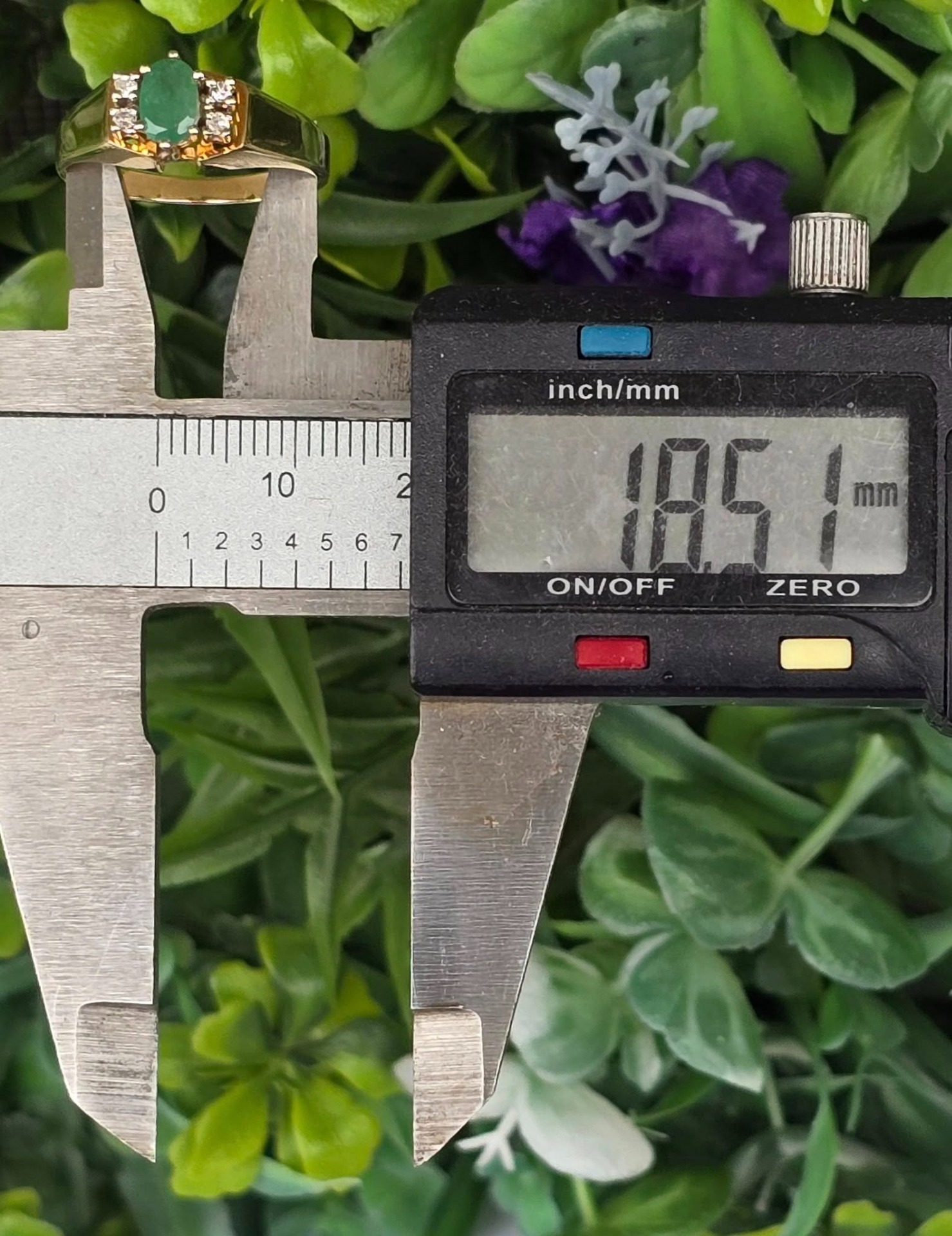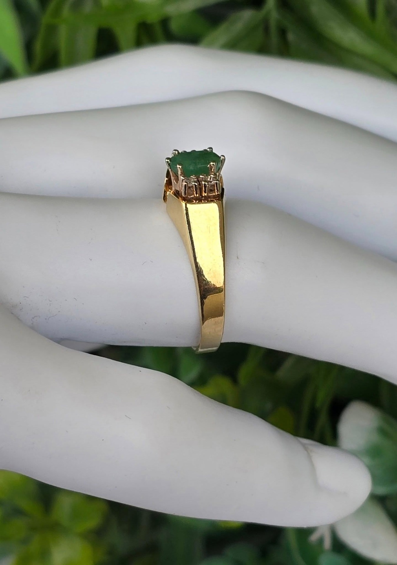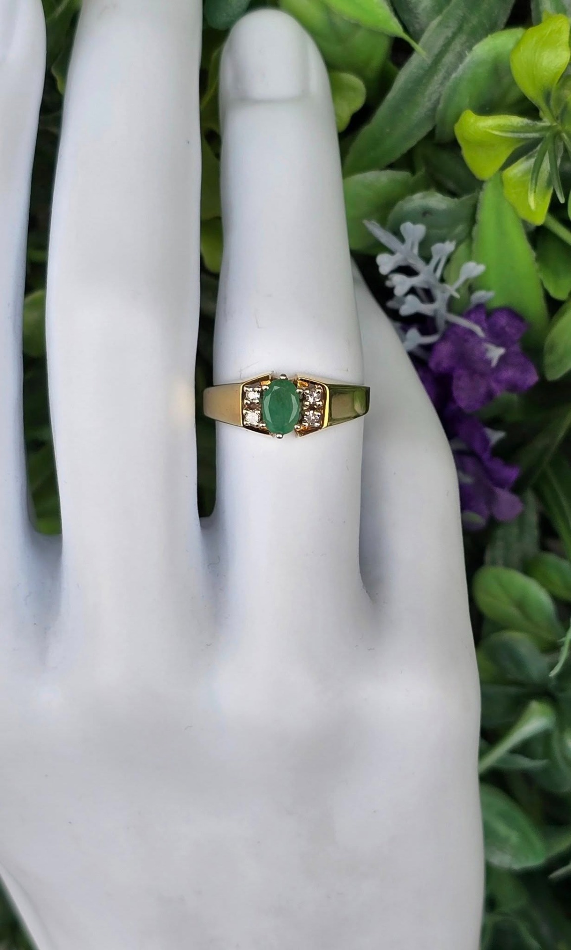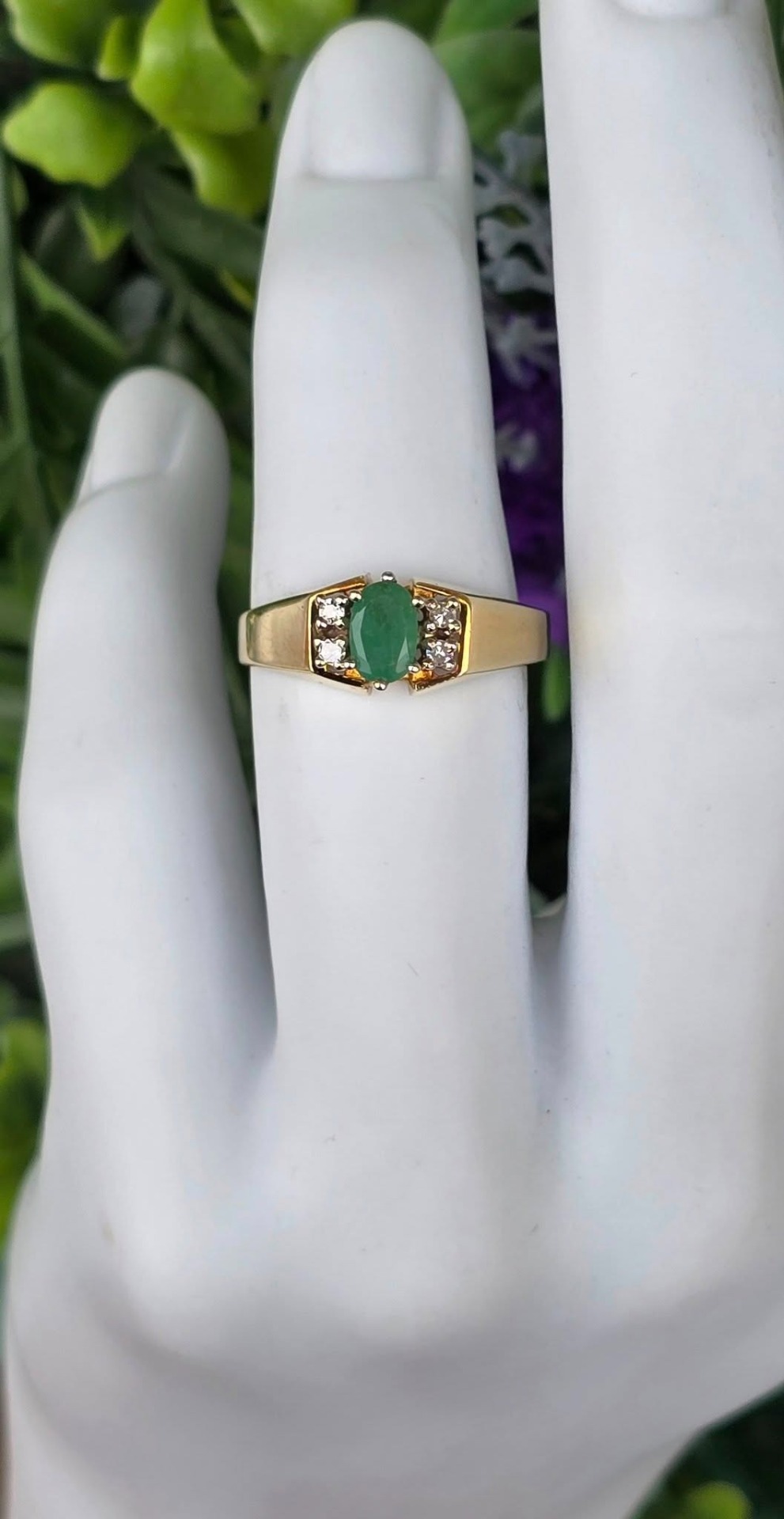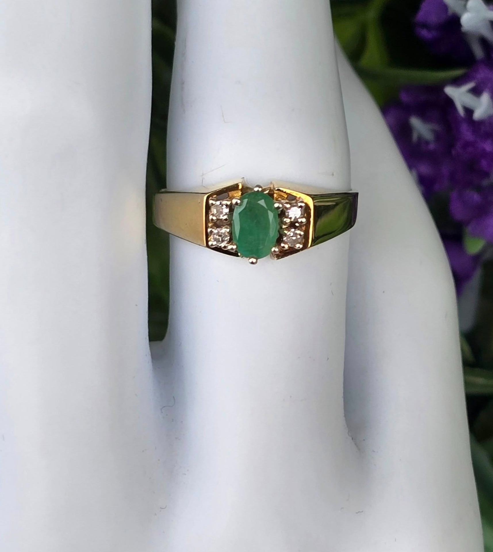 Inel vechi deosebit, din aur de 14K, cu smarald și 4 diamante naturale.