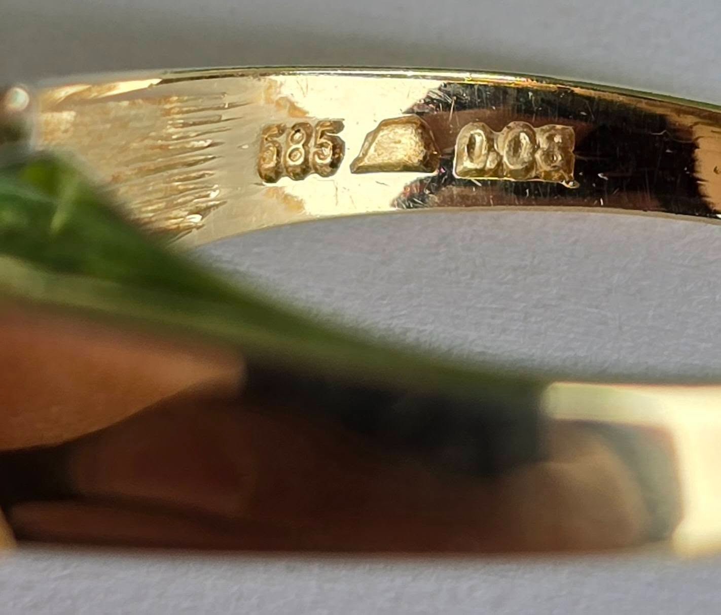 Prezintă marcaj 585 pentru puritate aur de 14K și marcaj "0.08" pentru caratajul diamantelor.