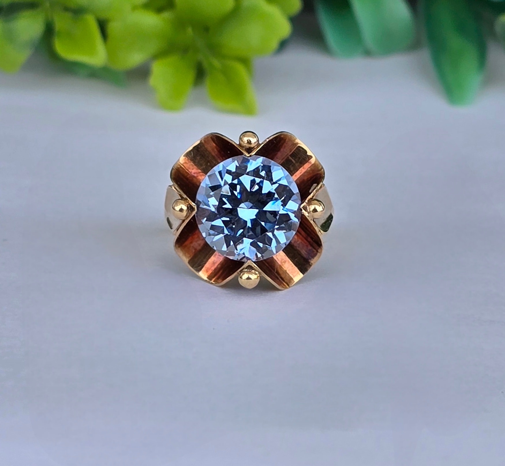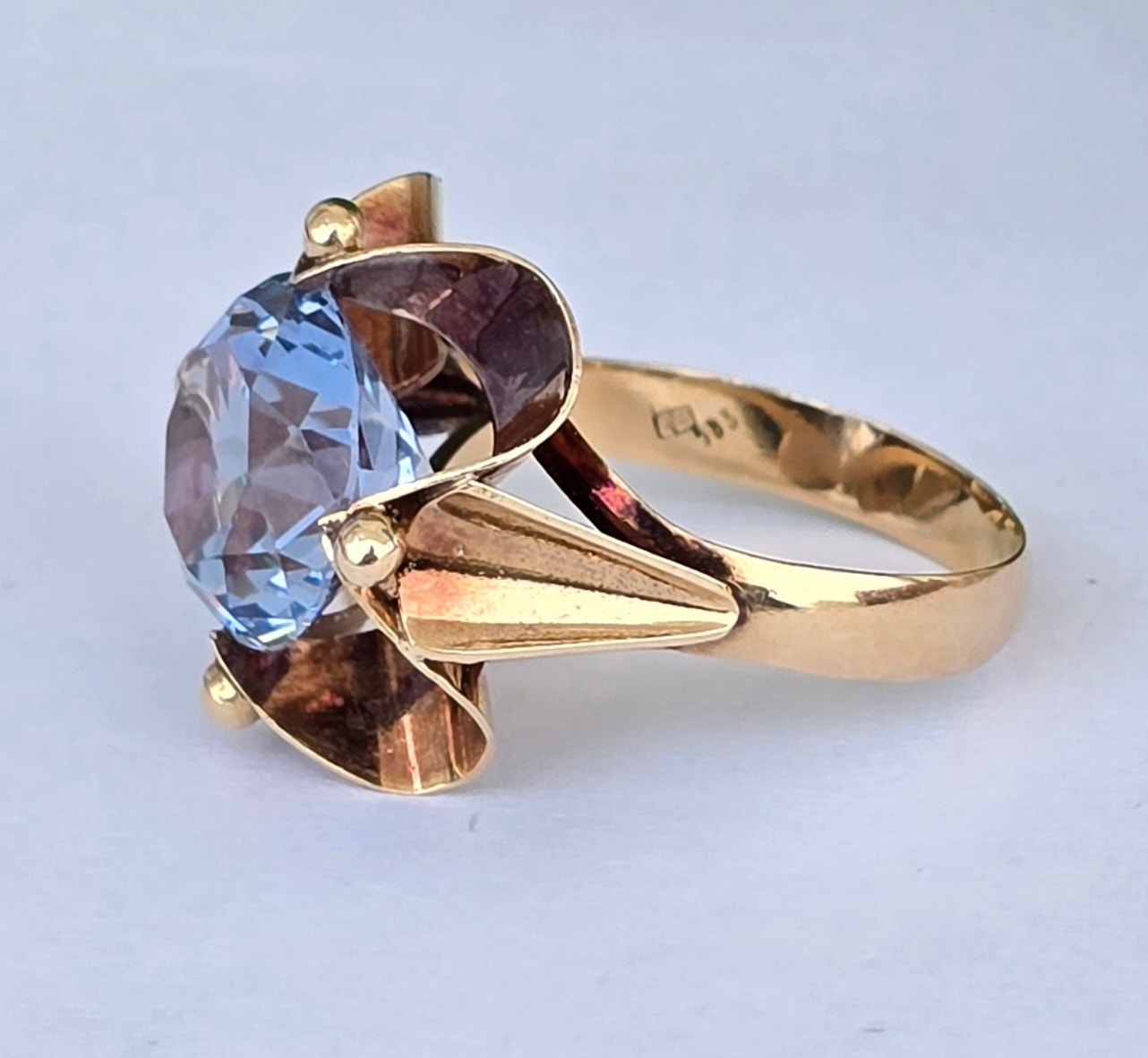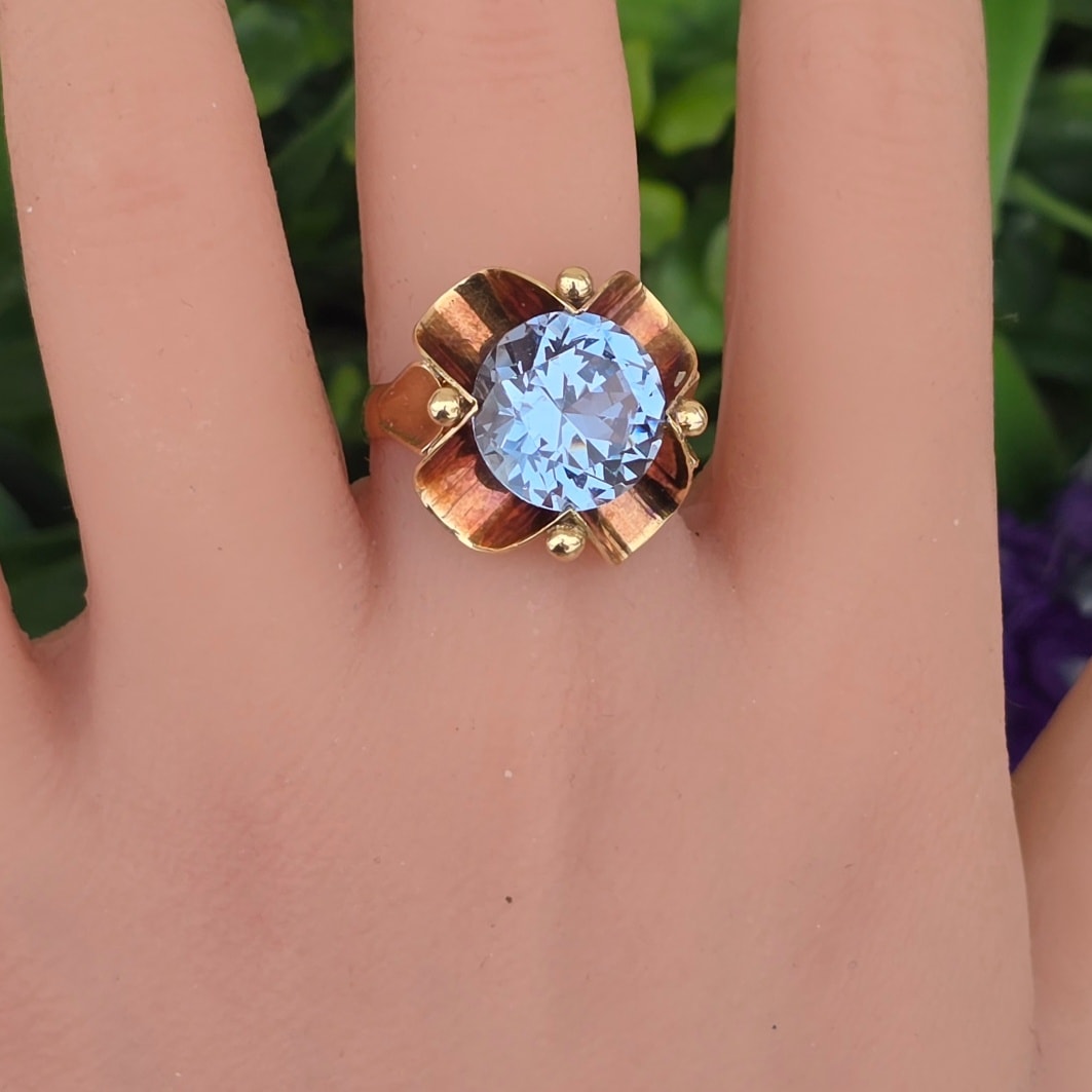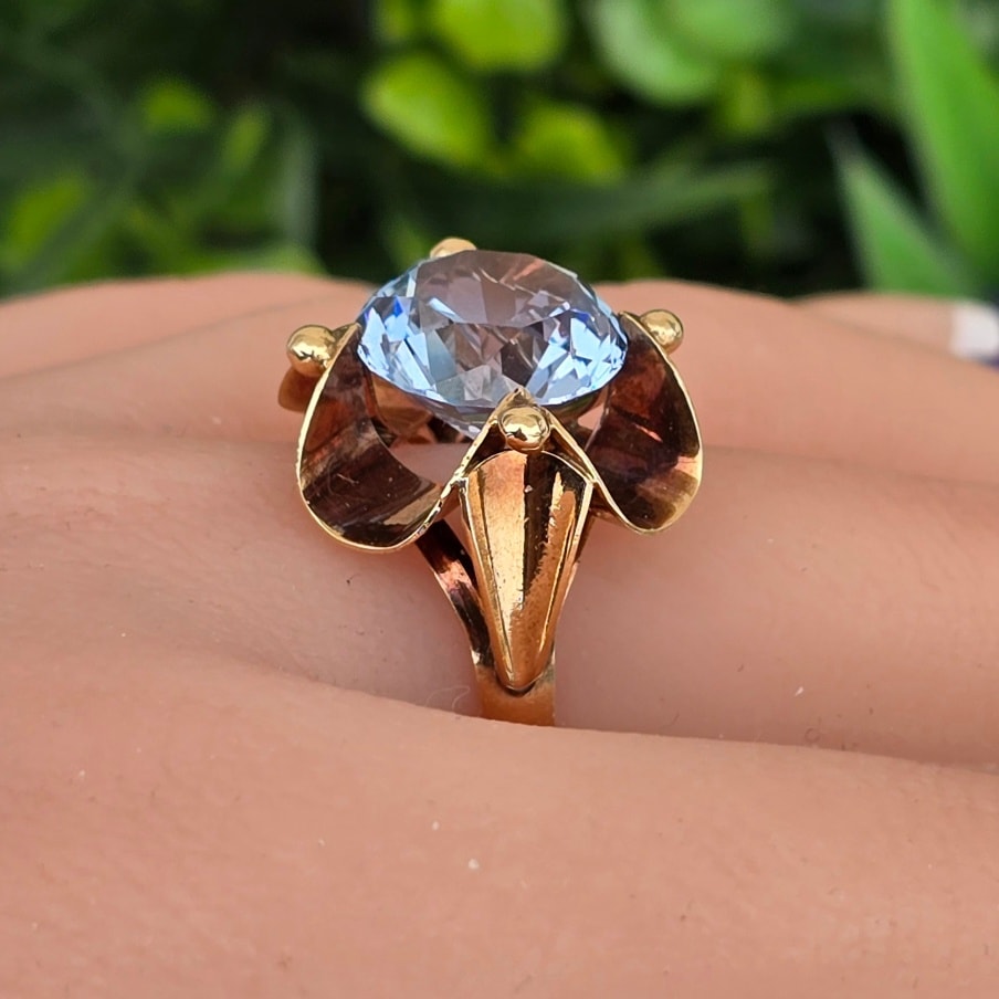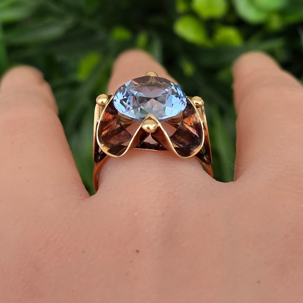 Inel vechi deosebit, din aur de 14K, cu un superb topaz "swiss blue" natural (anii 1940-1950, Germania).